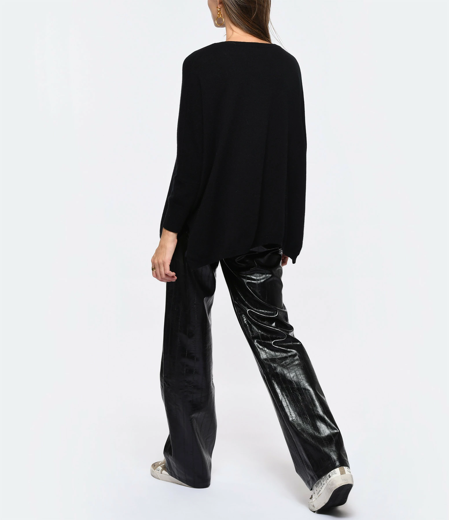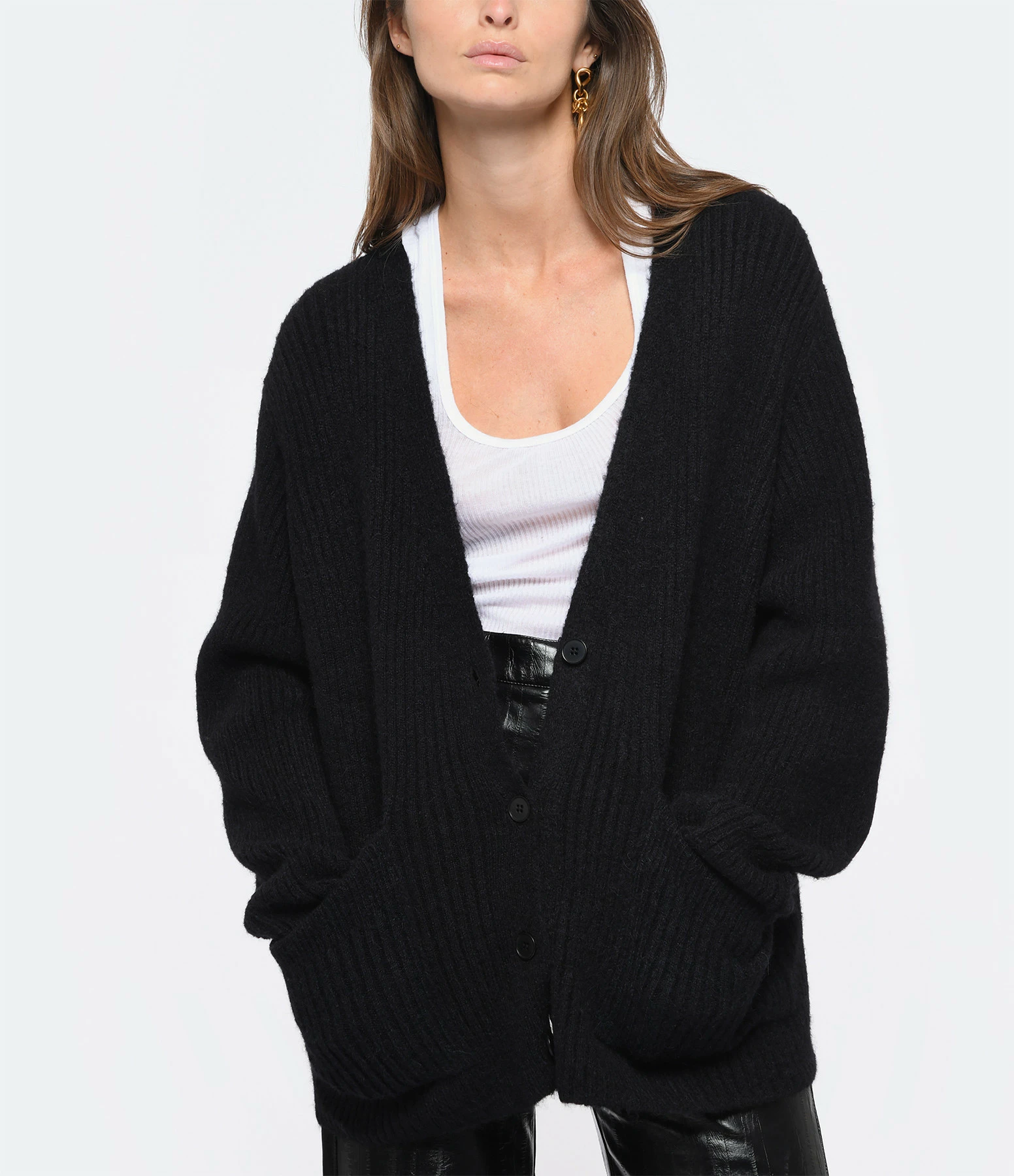 Gilet court en maille côtelée de laine mélangée noir. Encolure en V. Manches longues. Fermeture boutonnée simple sur le devant. Boutons noirs. Deux poches plaquées sur le devant. Coupe ample. Base droite.