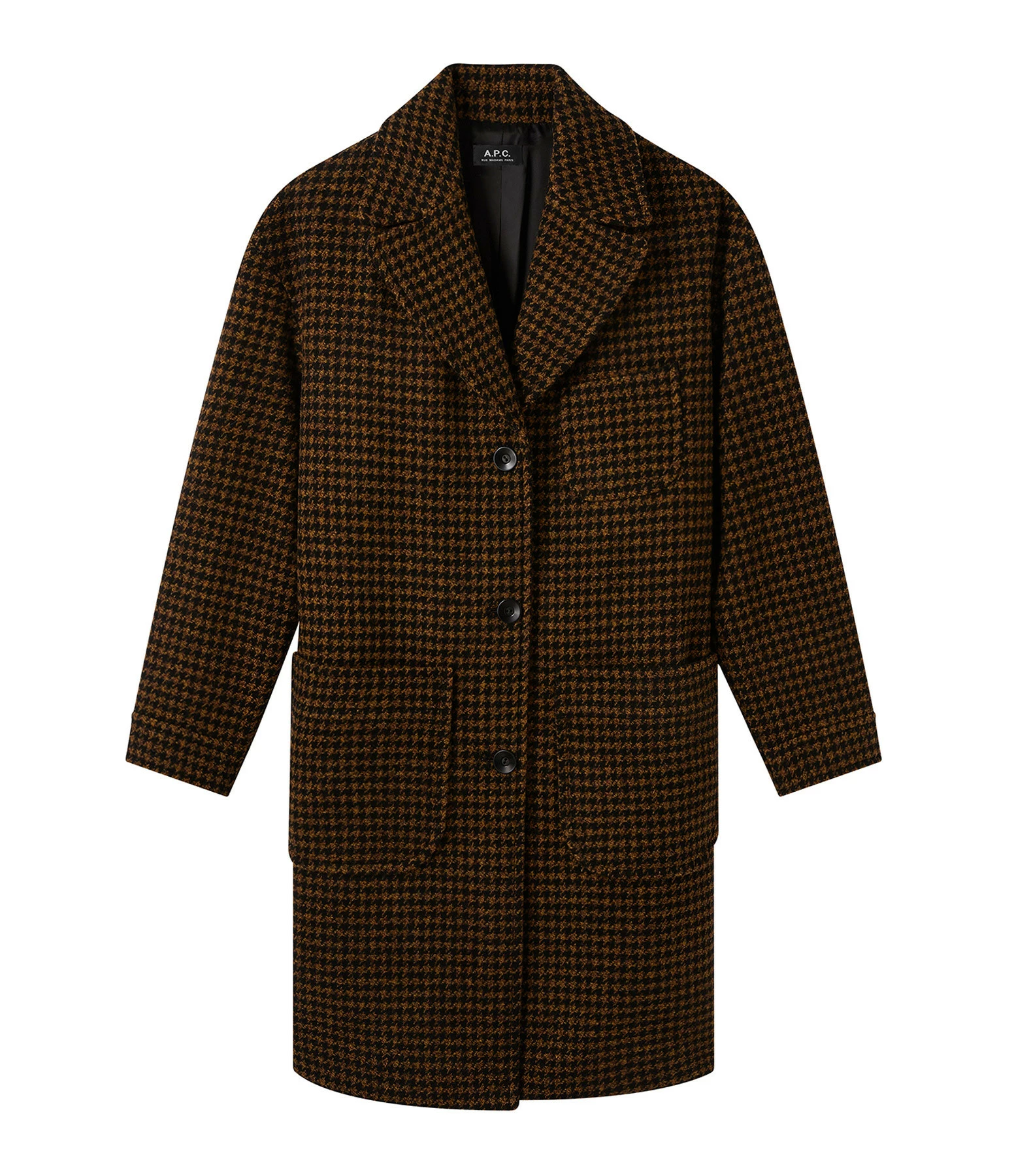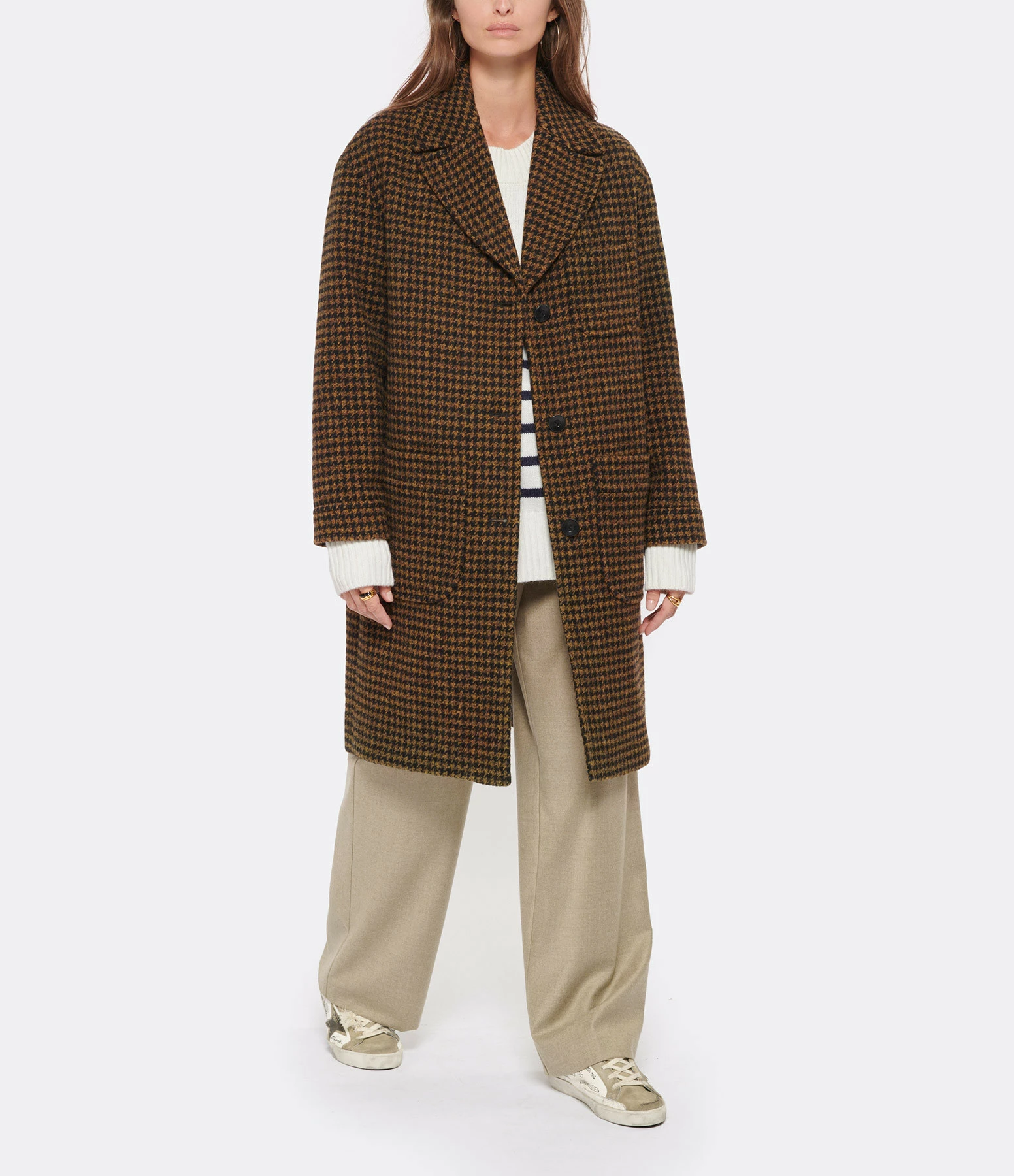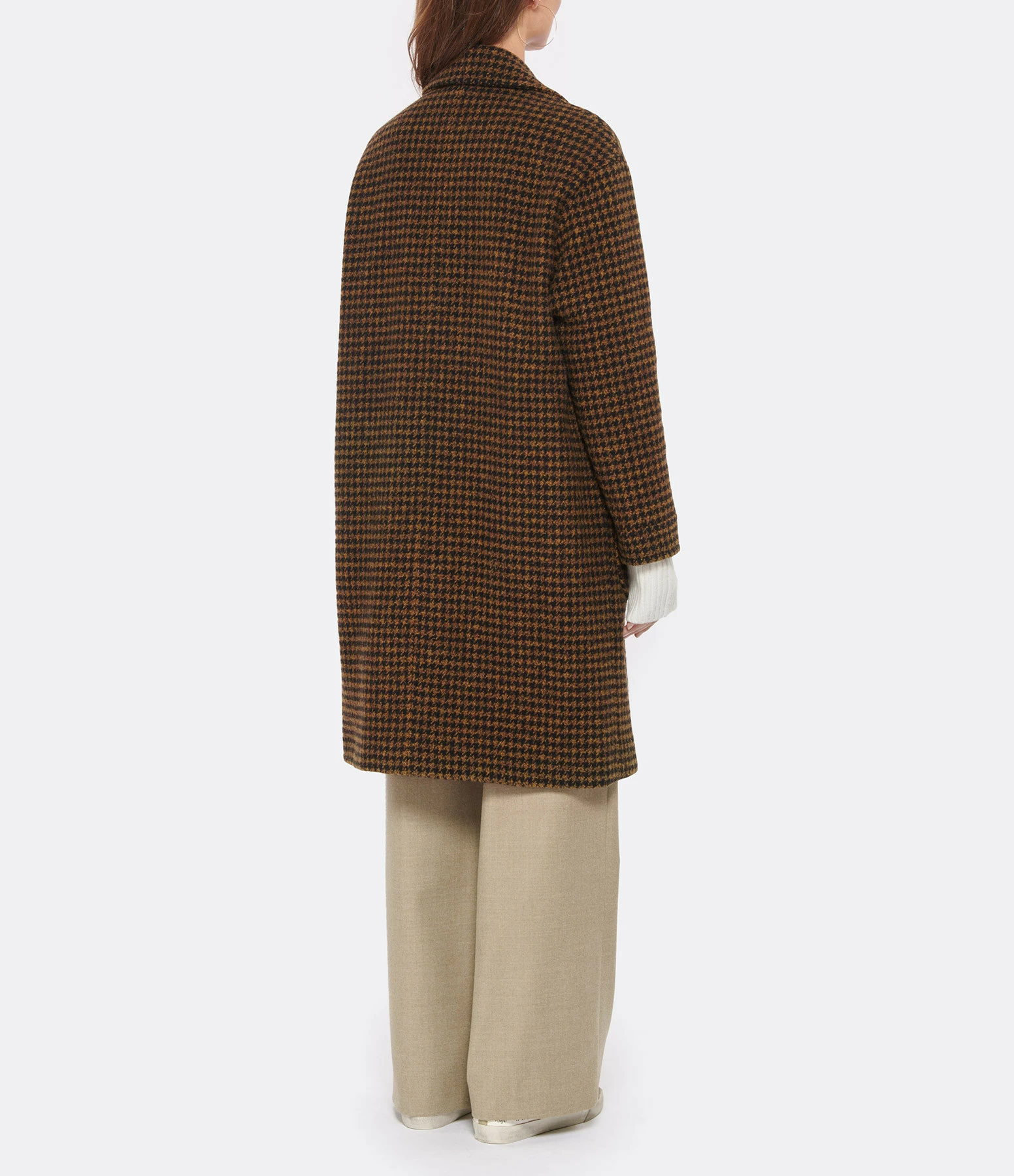 Manteau mi-long en lainage pied-de-poule dans des tons ocre. Col tailleur cranté. Manches longues. Une poche plaquée poitrine et deux poches plaquées sur le devant. Fermeture boutonnée simple sur le devant. Boutons noirs. Coupe droite légèrement ample. Base droite.