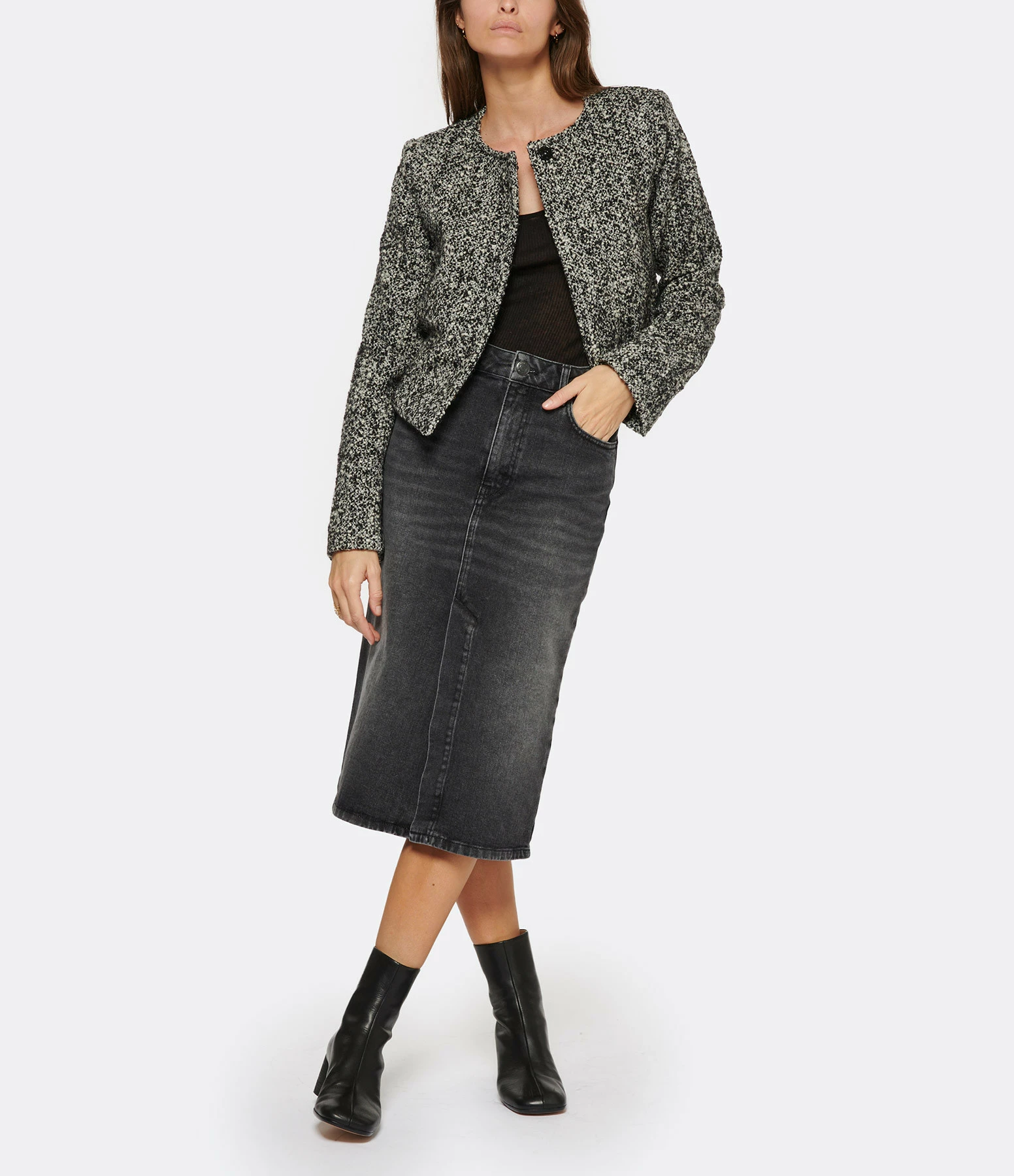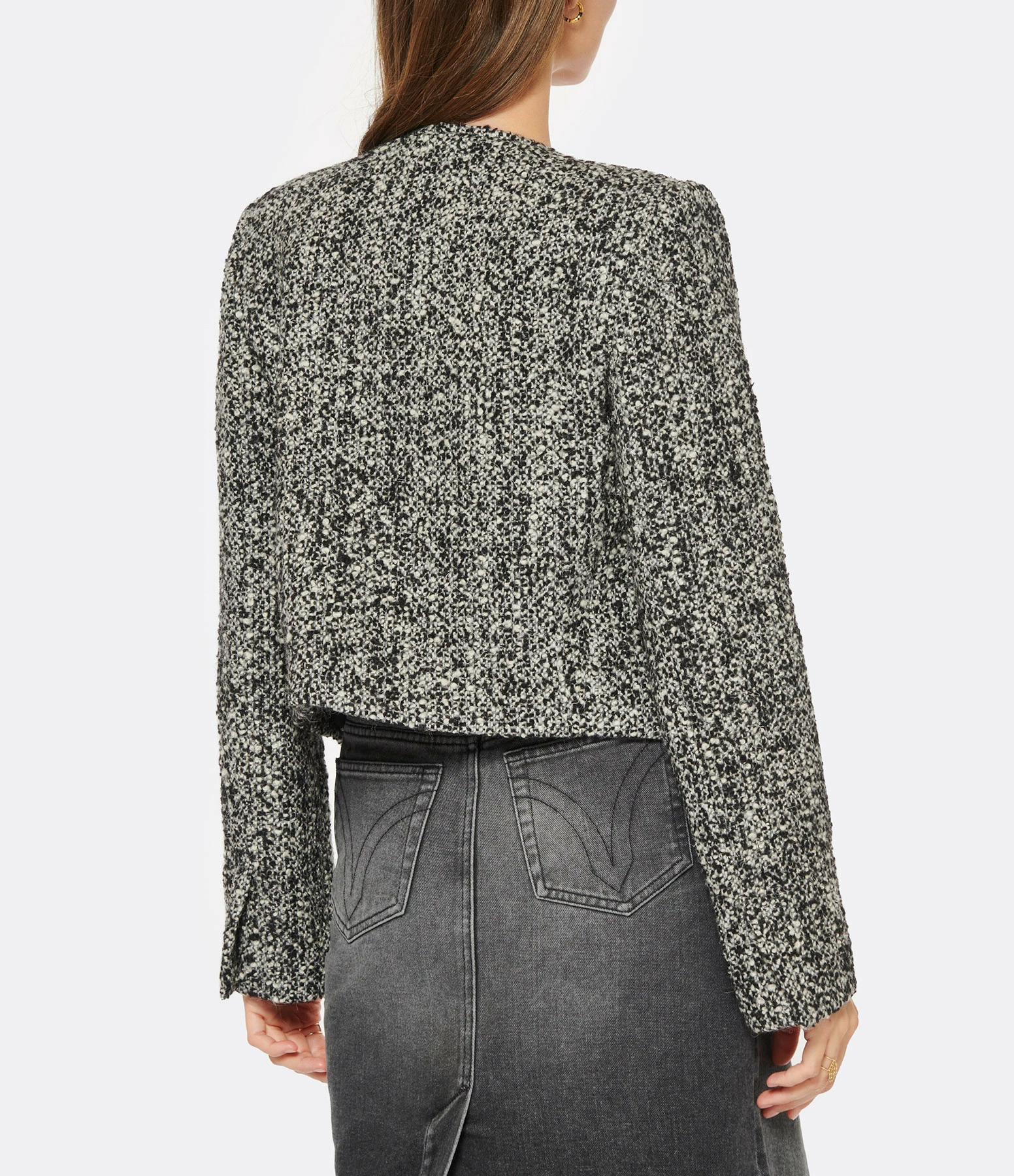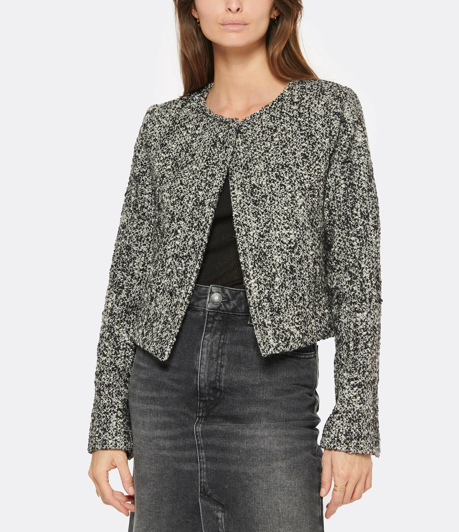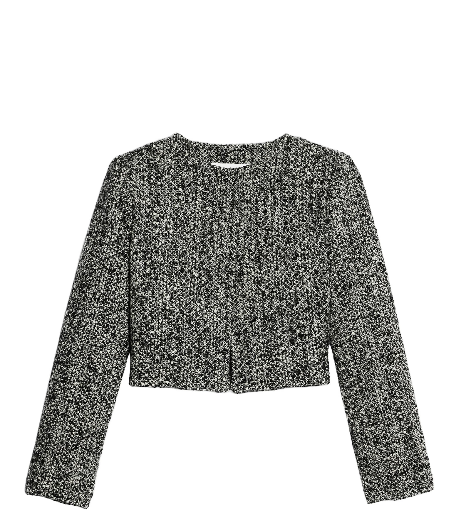Veste en tweed de laine mélangée noir et écru. Col rond. Épaulettes. Manches longues avec fentes. Fermeture pressionnée sur le devant avec un seul bouton en haut. Coupe droite. Base droite. Longueur raccourcie. Doublée.