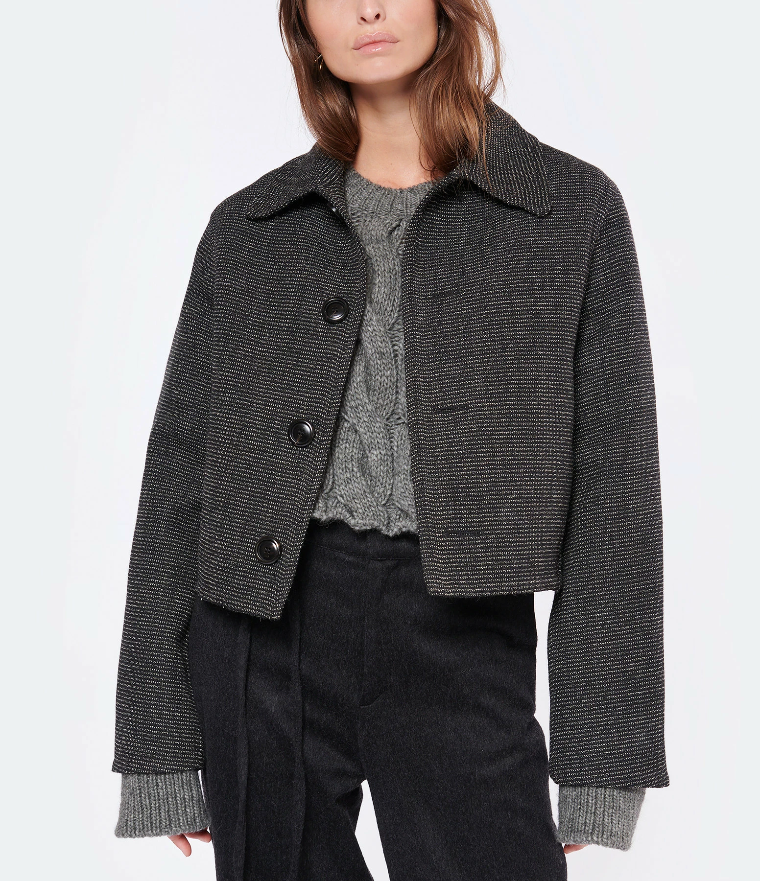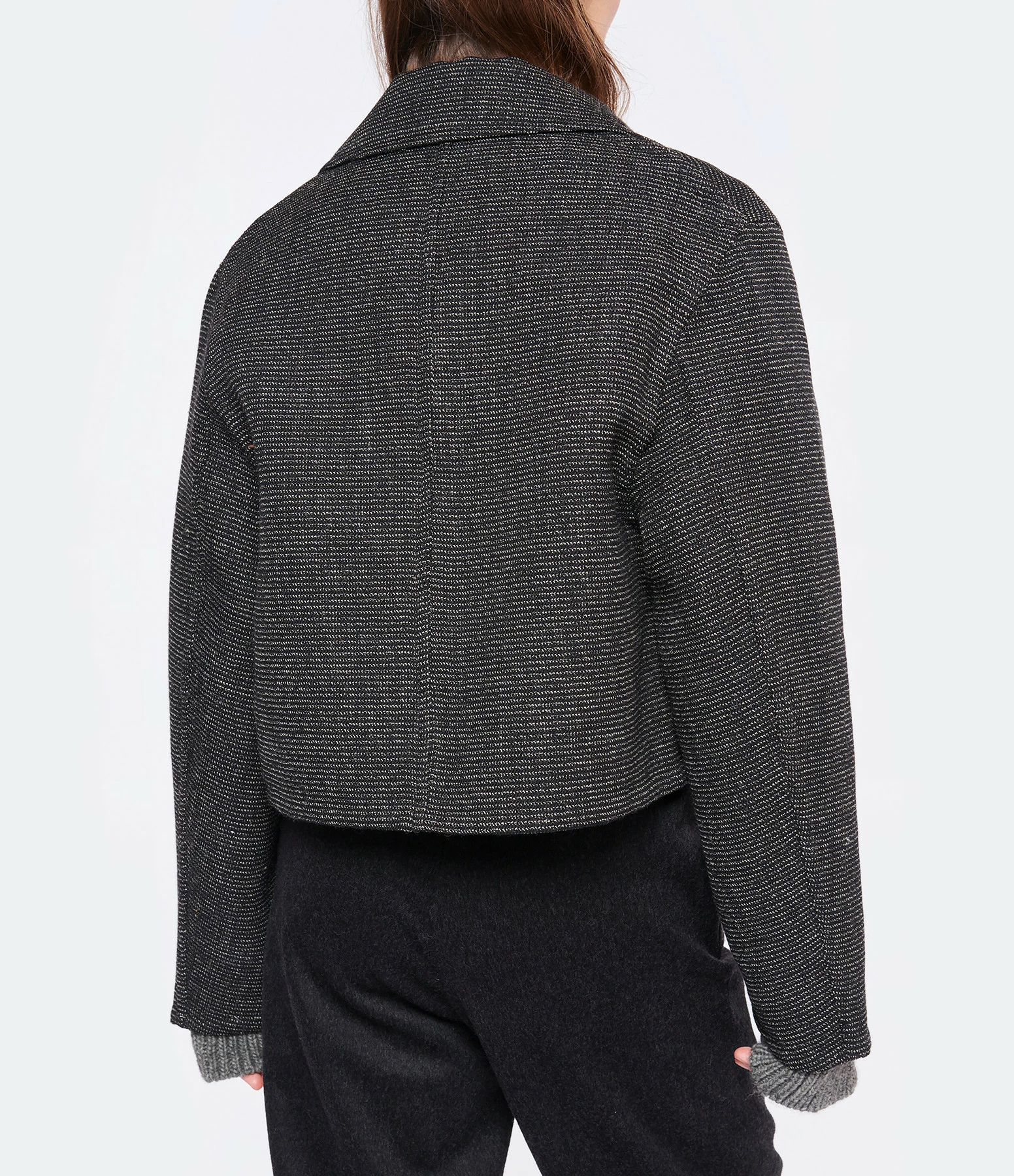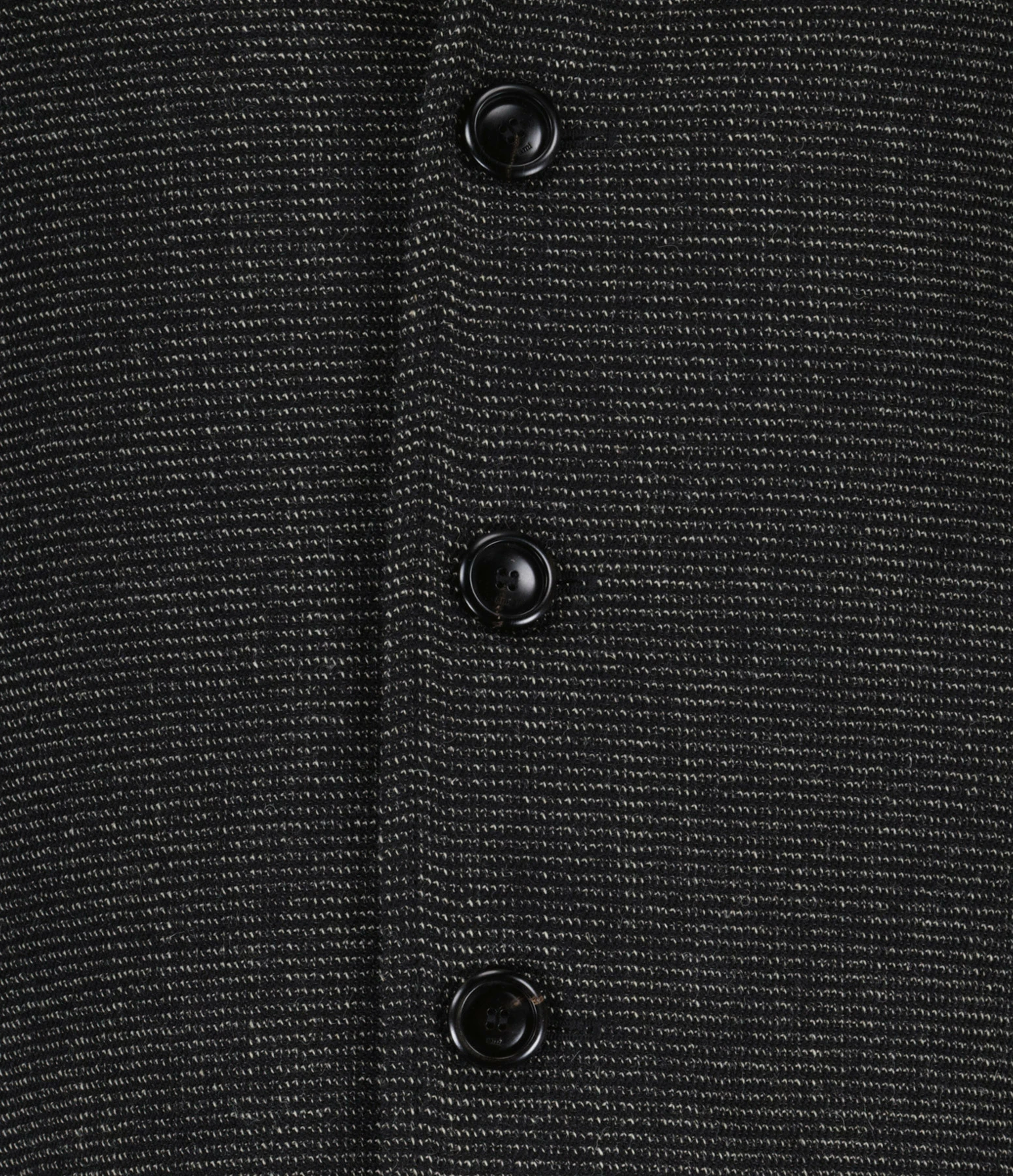 Veste unisexe en laine mélangée moulinée noir et écru. Col chemisier. manches longue. Fermeture boutonnée sur le devant. Boutons noirs effet corne. Deux poches invisibles sur le devant. Coupe droite. Base droite. Non doublée.