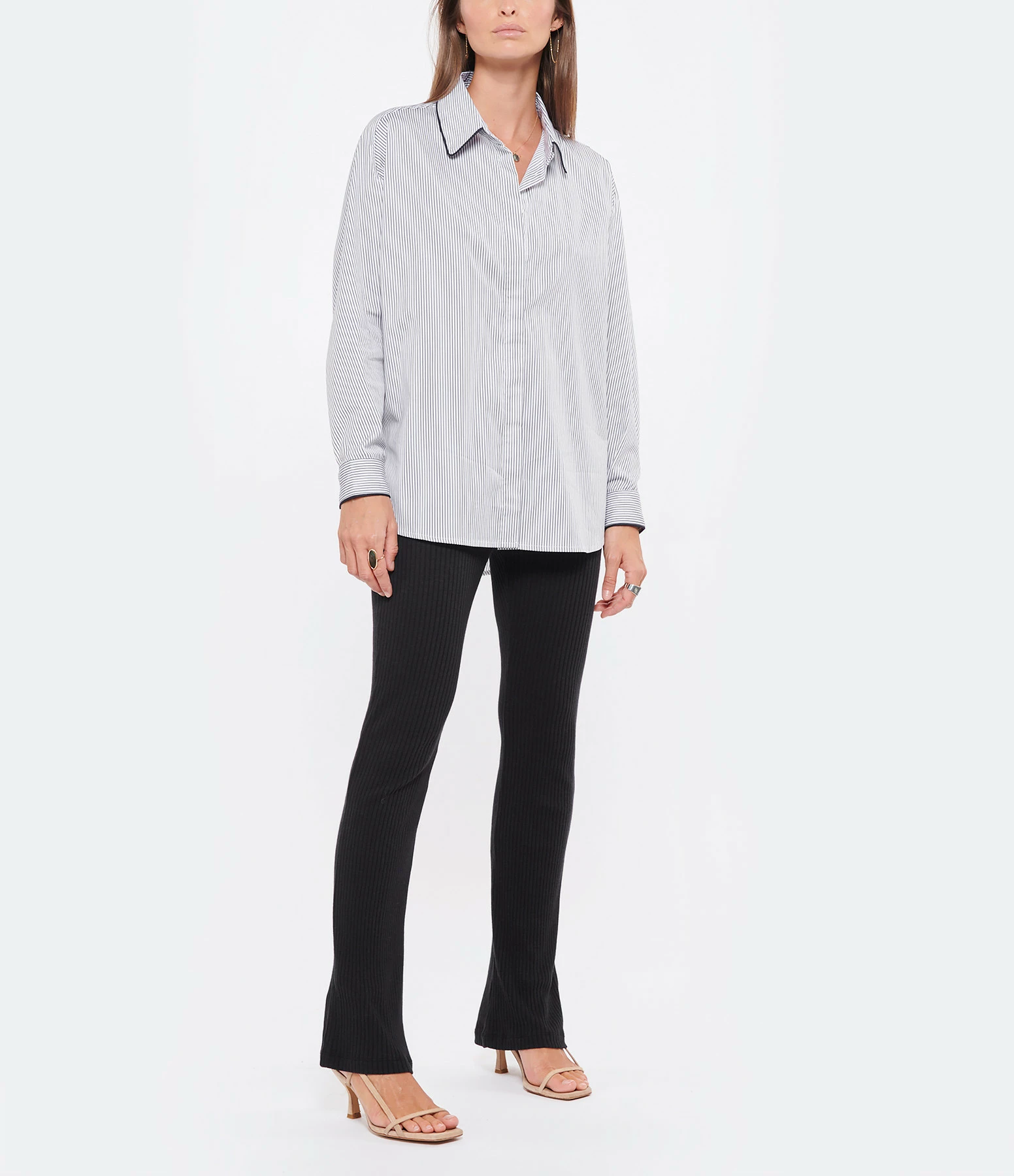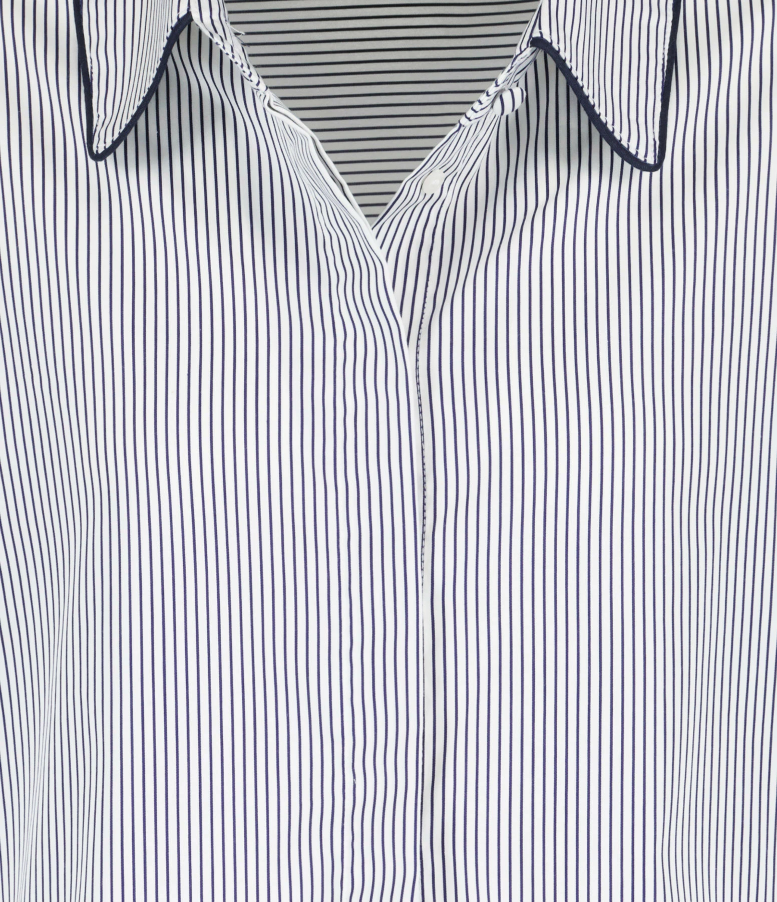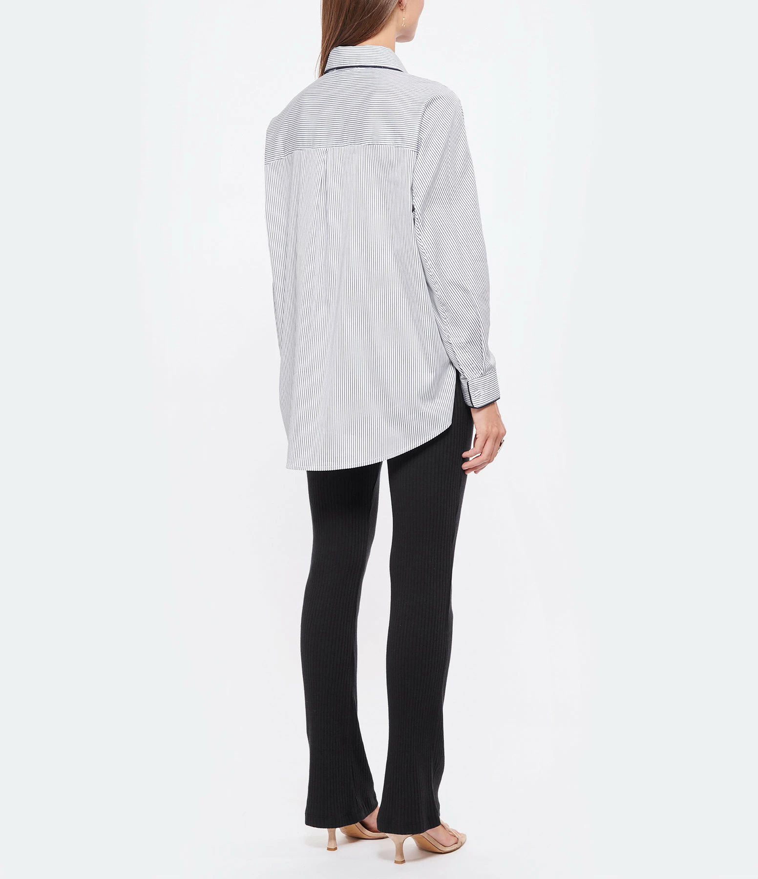 Chemise oversize en coton blanc à rayures bleues. Col chemise. Manches longues. Fermeture boutonnée. Coupe ample. Base arrondie.