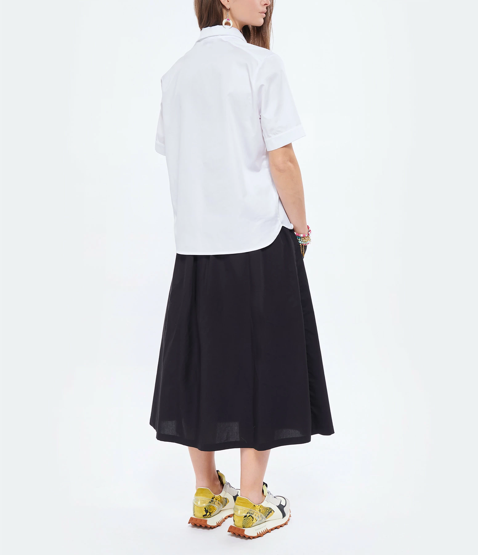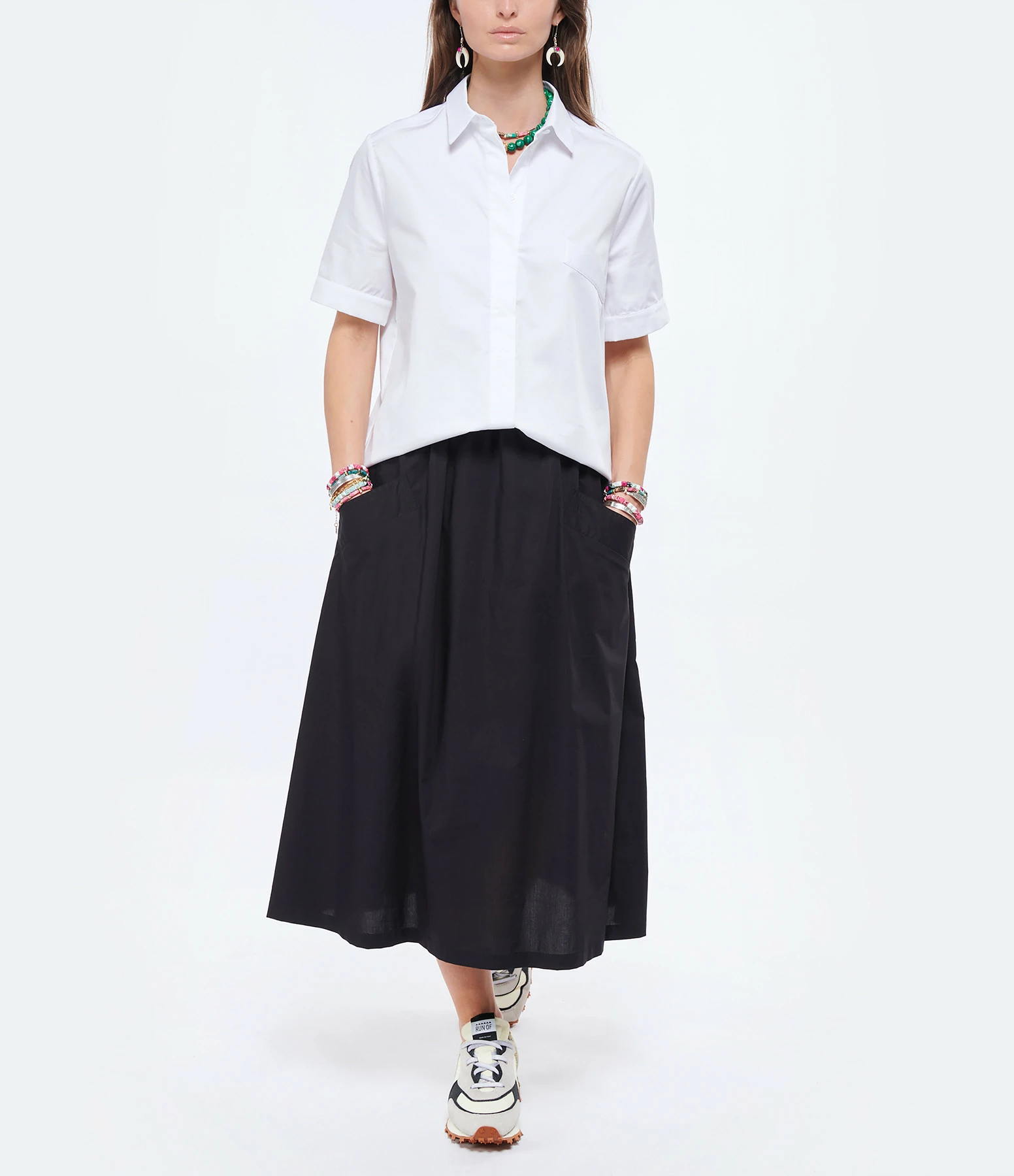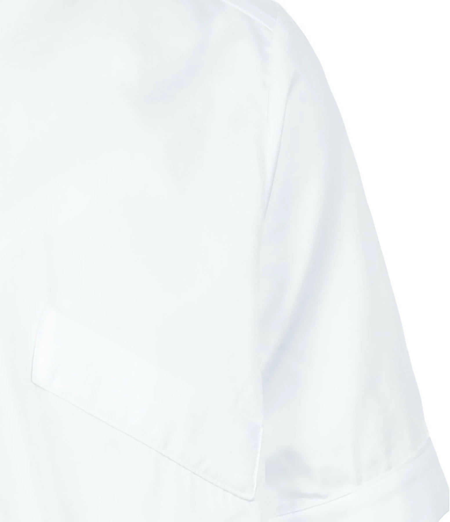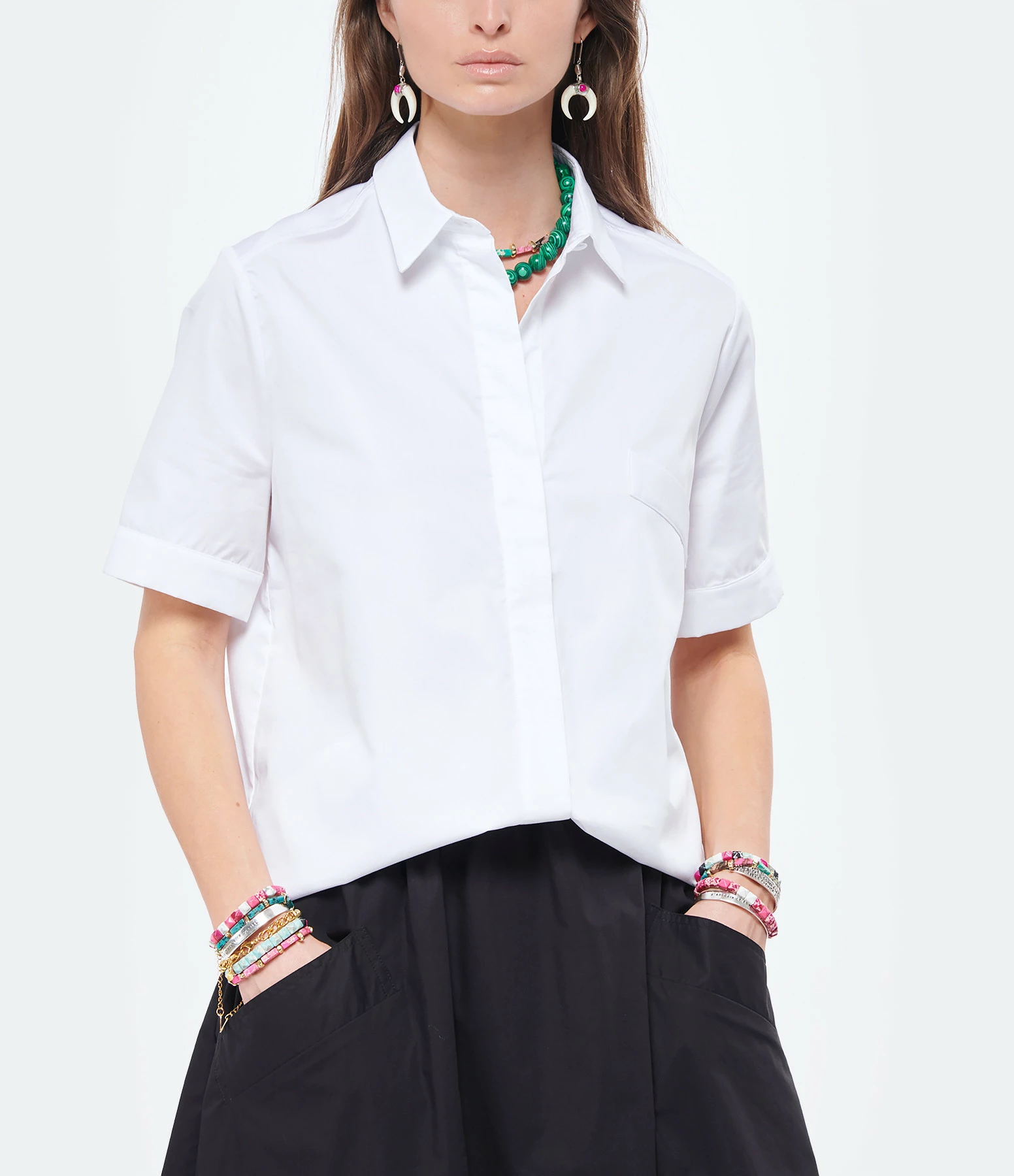 Chemise en coton blanc. Manches courtes. Col chemise. Une poche passepoilée en biais. Fermeture boutonnée. Coupe droite. Base droite.