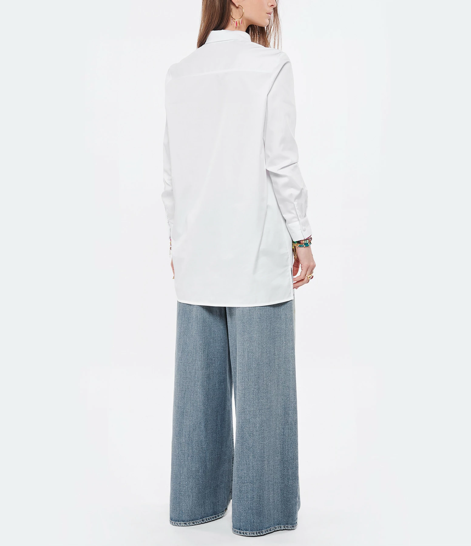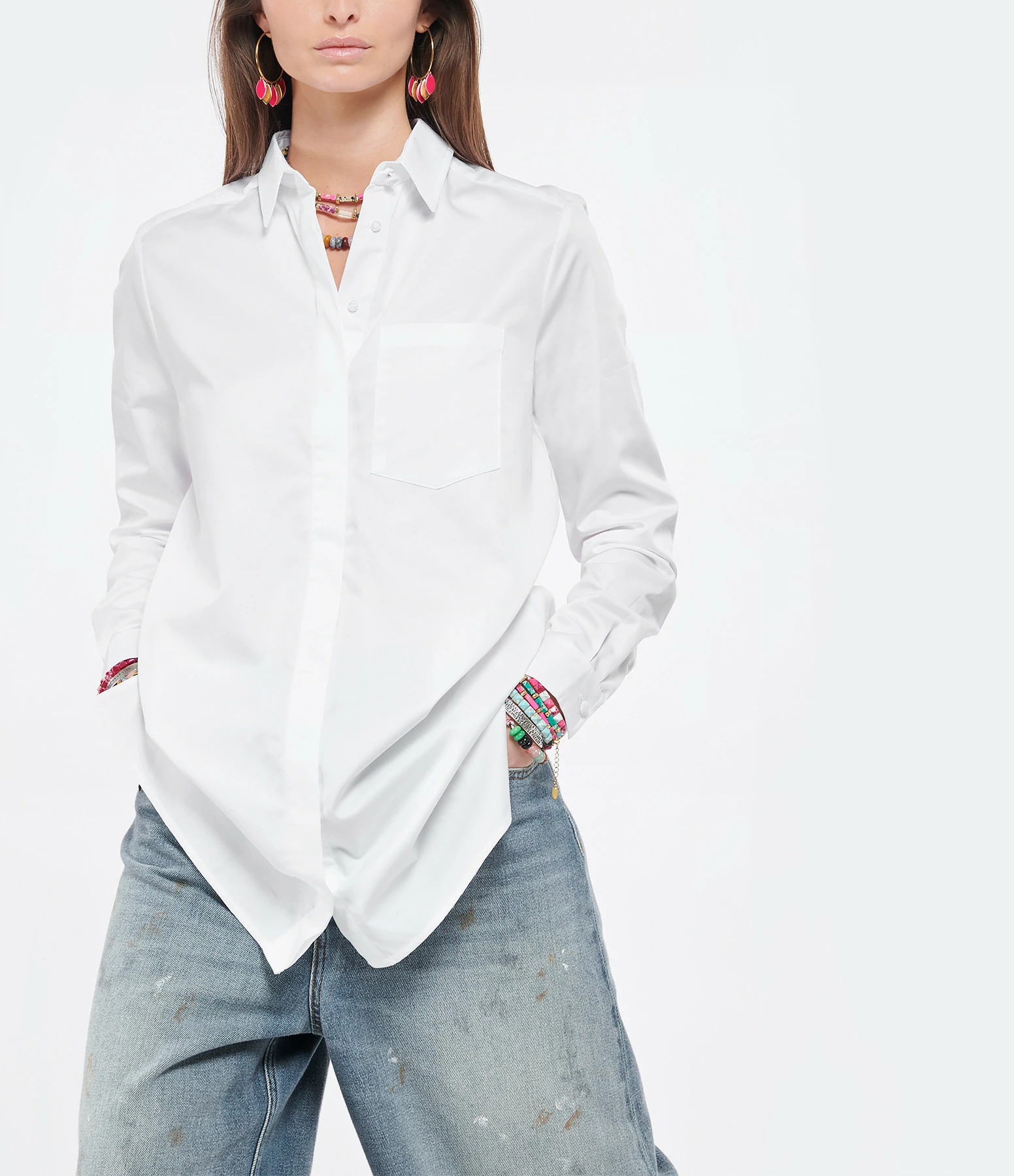Chemise en coton oversize en coton blanc. Col chemise. Manches longues. Une poche plaquée poitrine. Fermeture boutonnée. Coupe ample. Base droite.