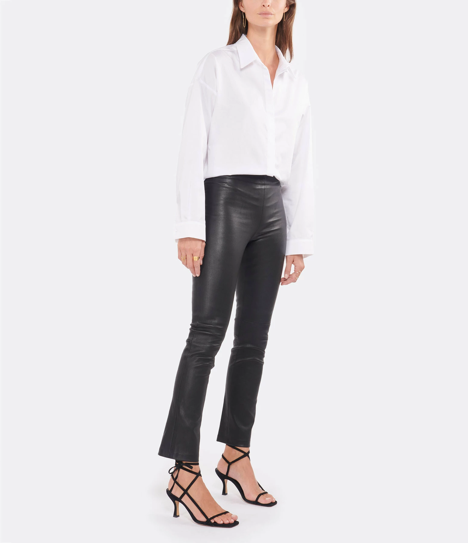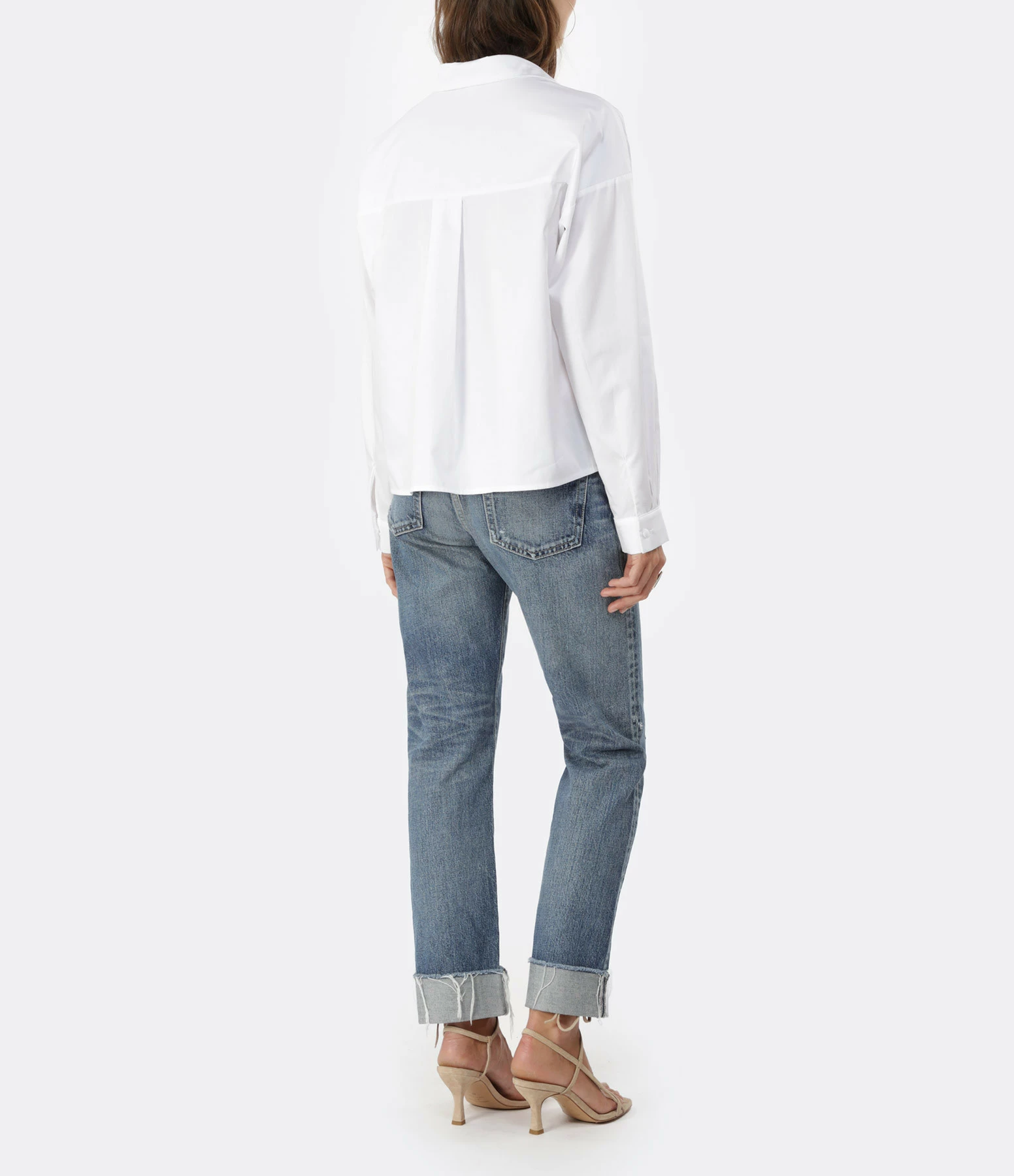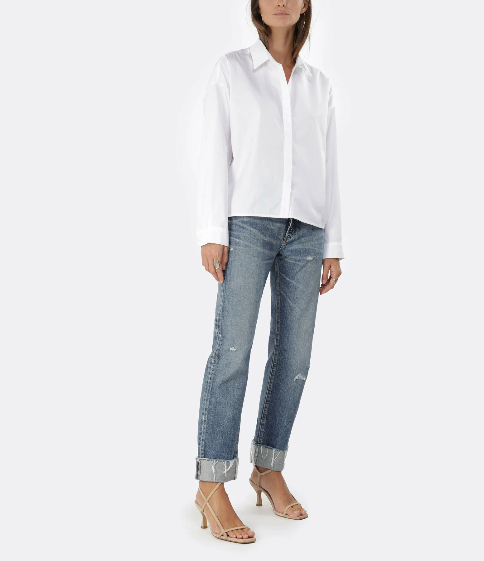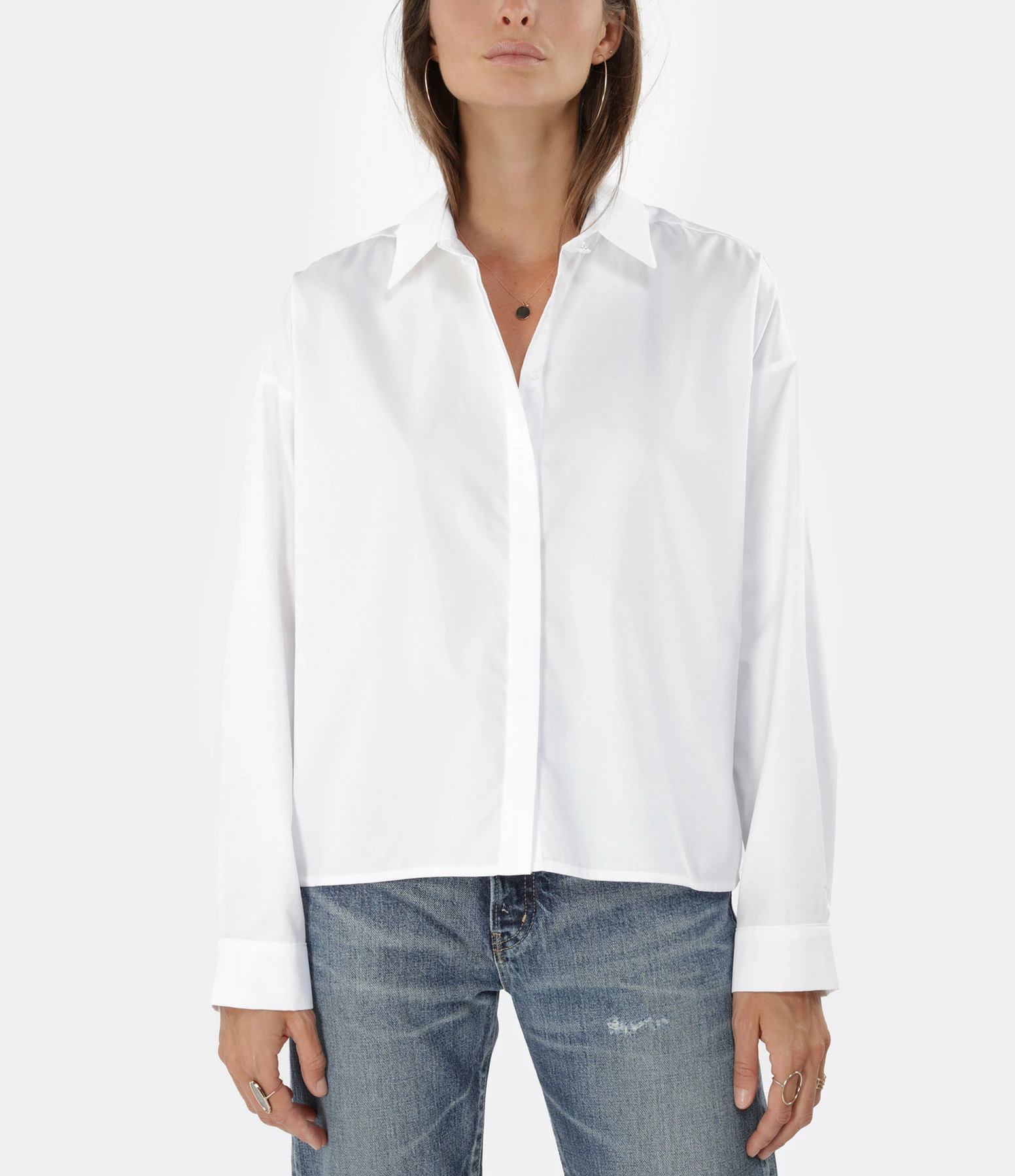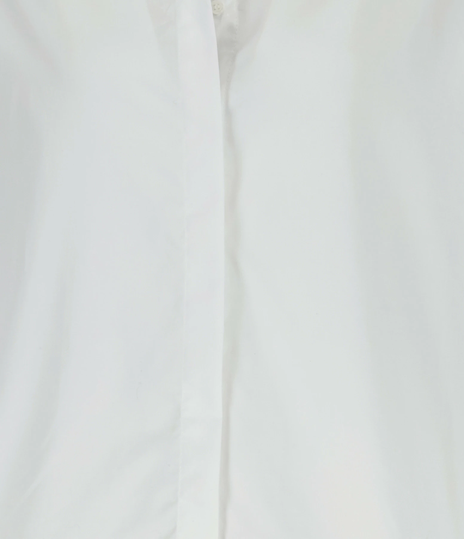 Chemise en coton blanc. Col chemise. Manches longues. Fermeture boutonnée. Coupe droite. Base droite à l’avant et arrondie à l’arrière.