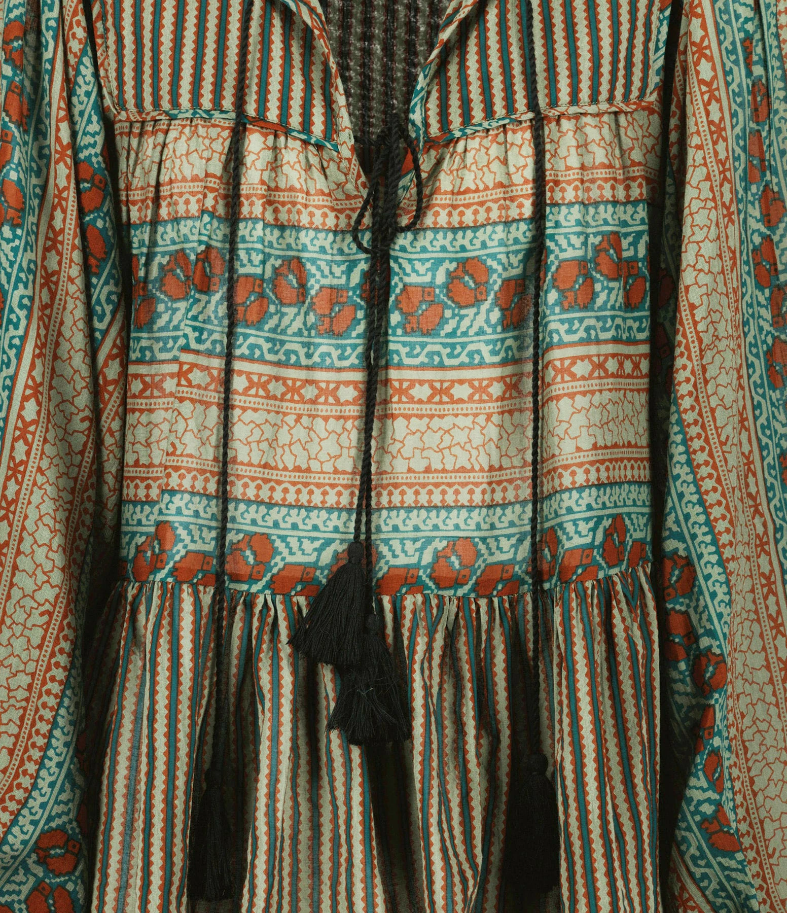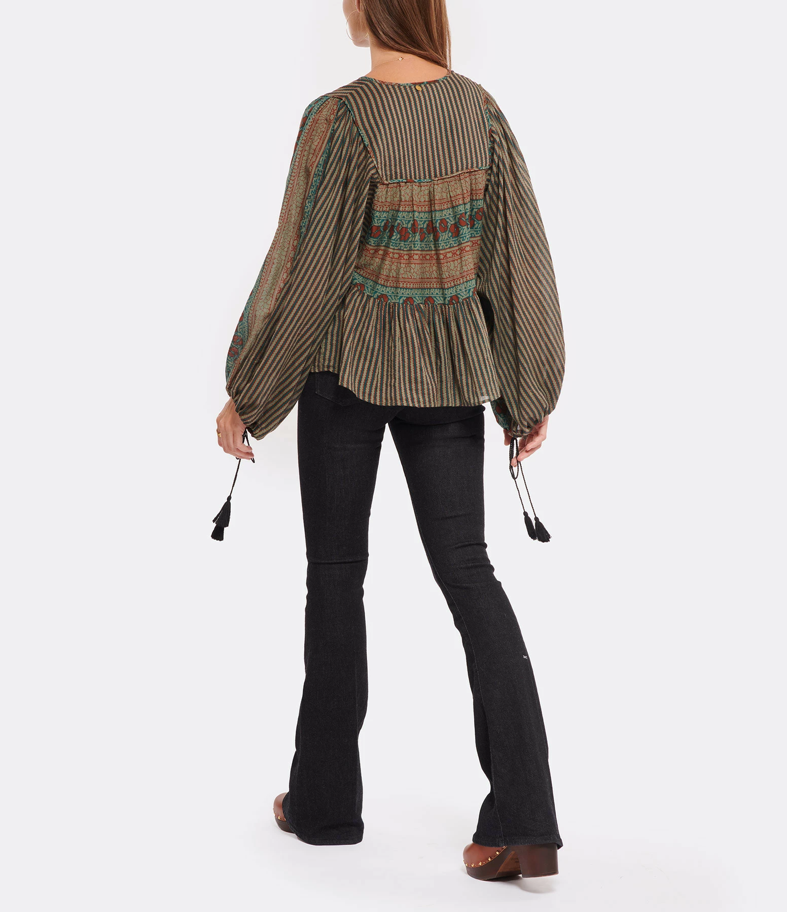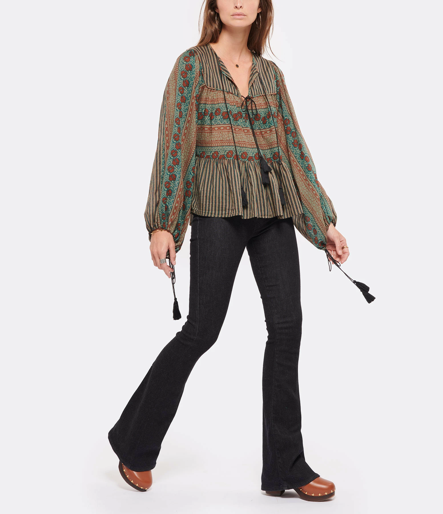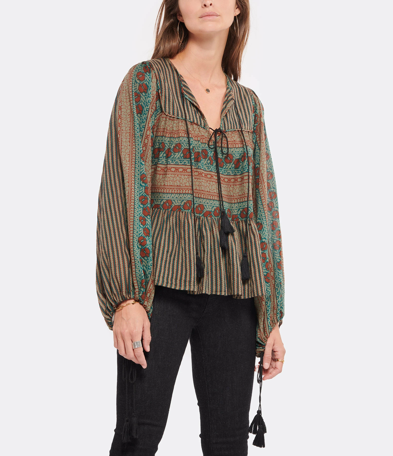 Blouse en coton imprimé dans des tons verts. Encolure en V avec cordons noirs à nouer. Manches longues bouffantes avec cordons de serrage aux extrémités. Coupe droite froncée. Base droite. Non doublée.