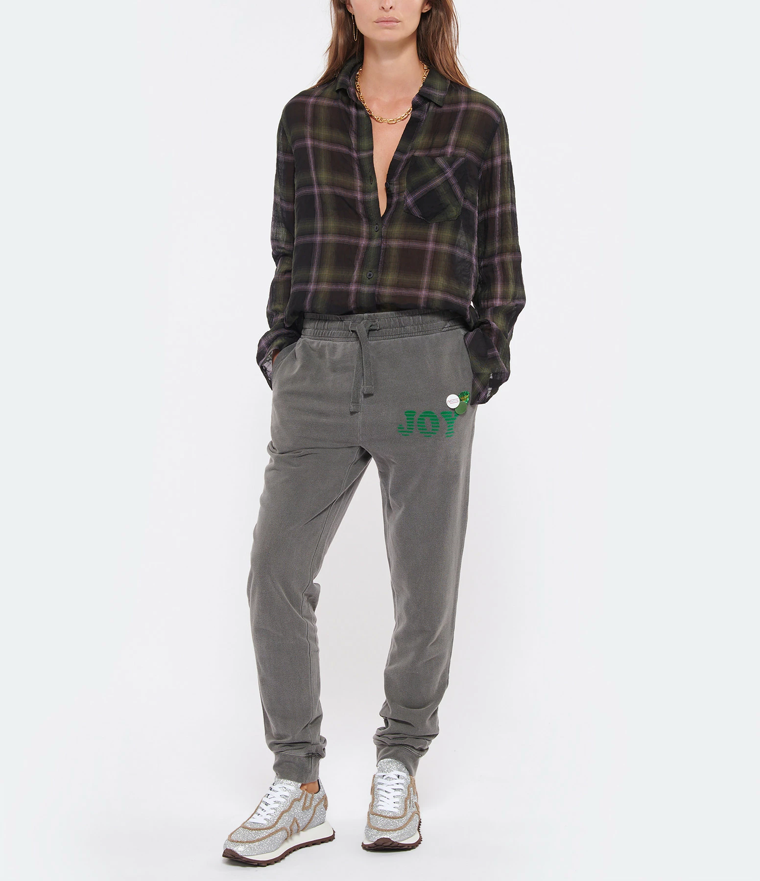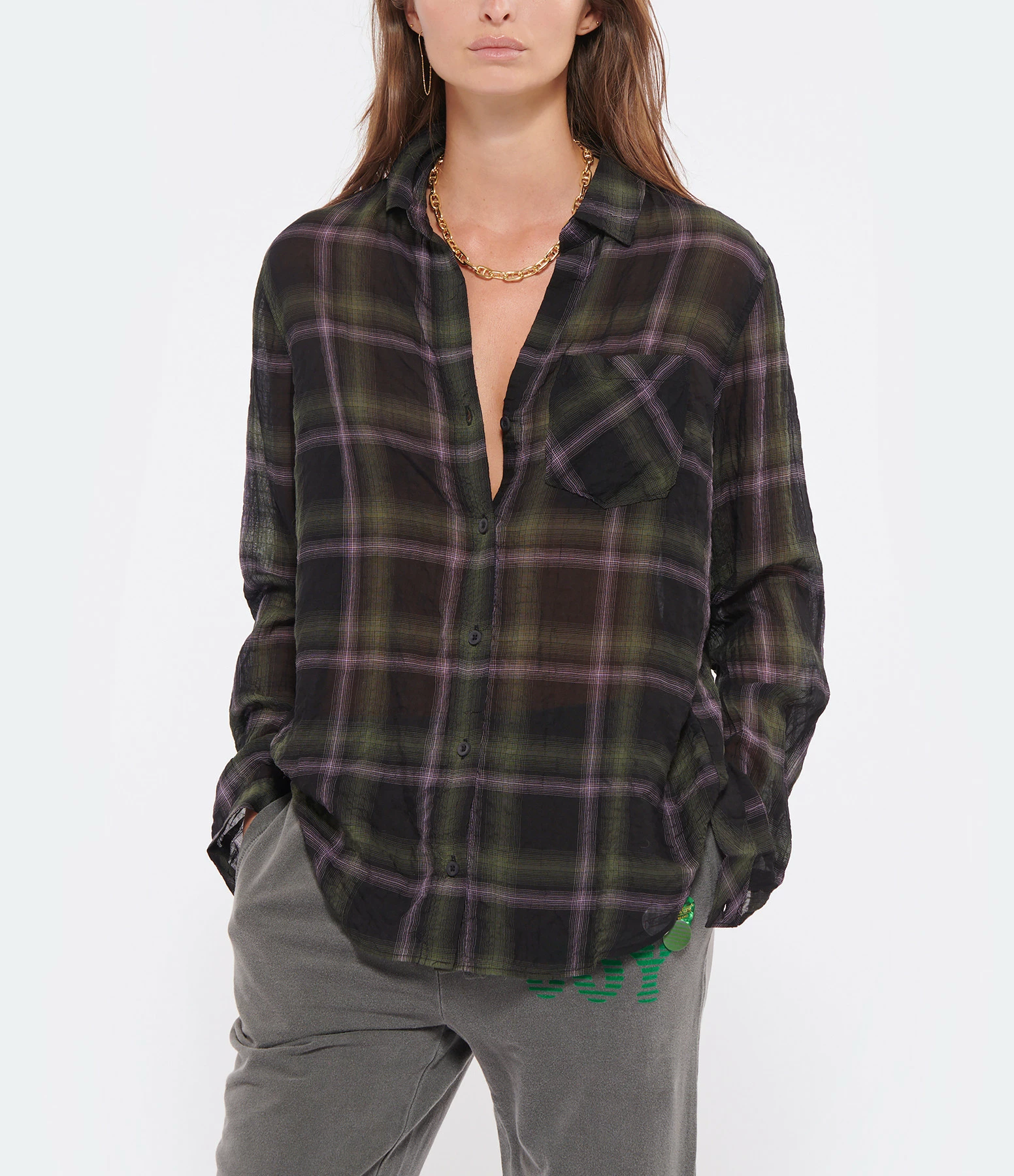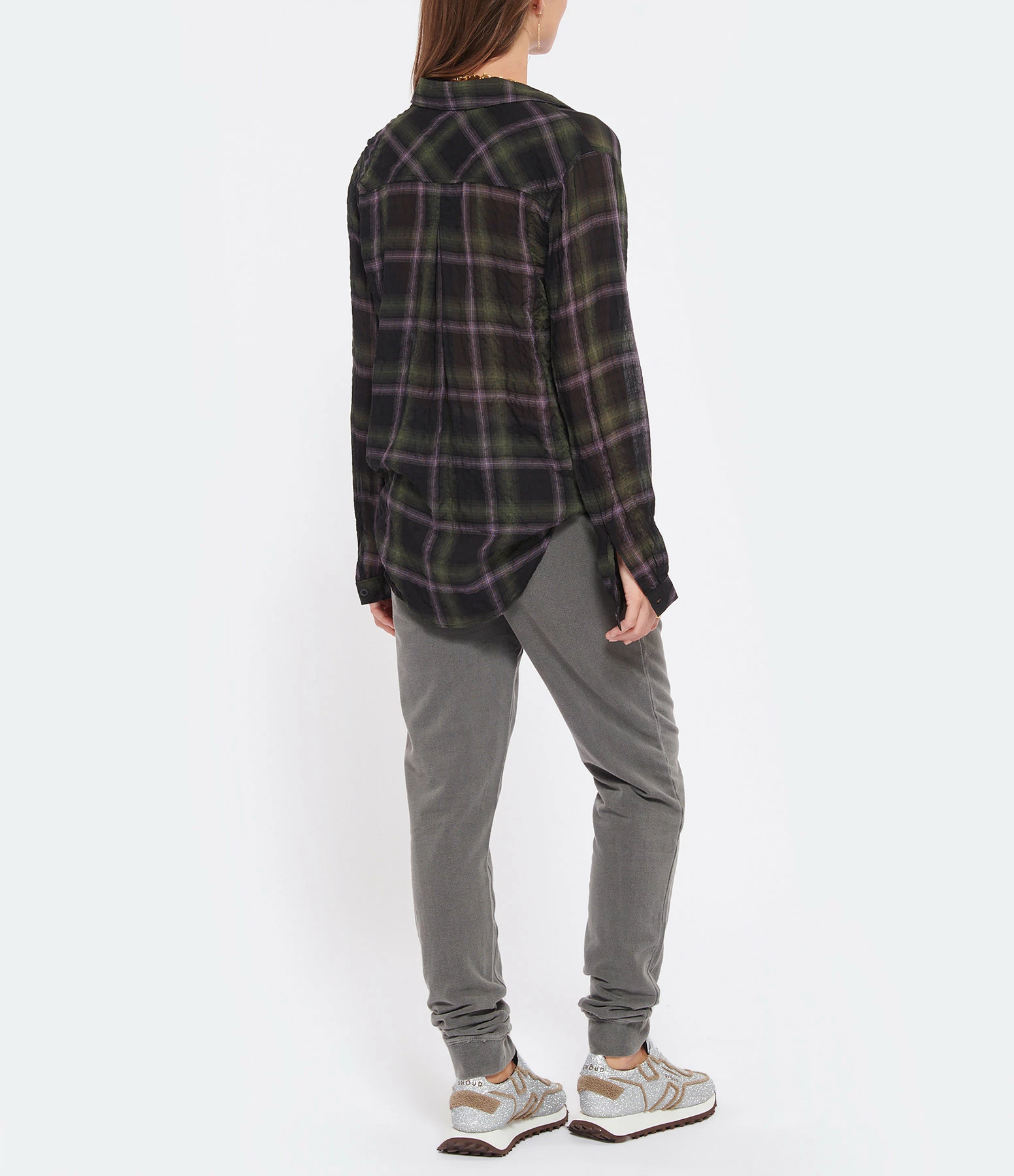 Chemise noire à carreaux vert et violet. Col chemise. Poche plaquée sur la poitrine. Manches longues. Base arrondie plus longue à l’arrière. Légèrement transparente.