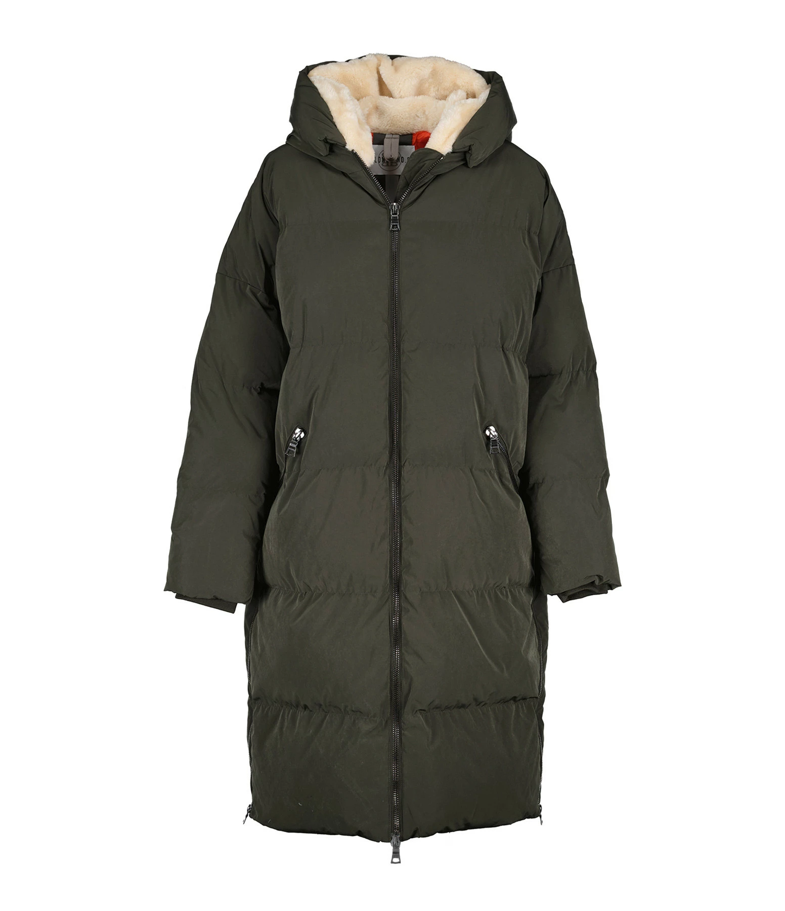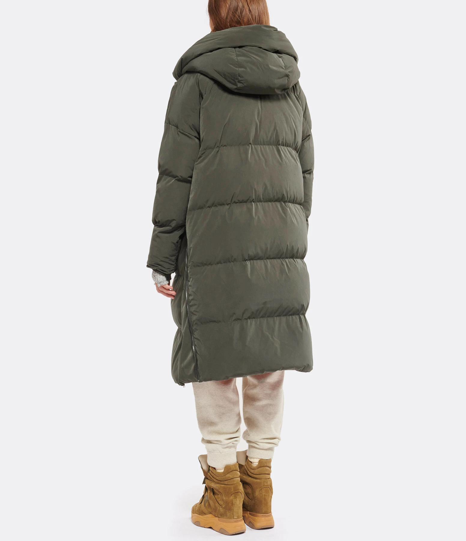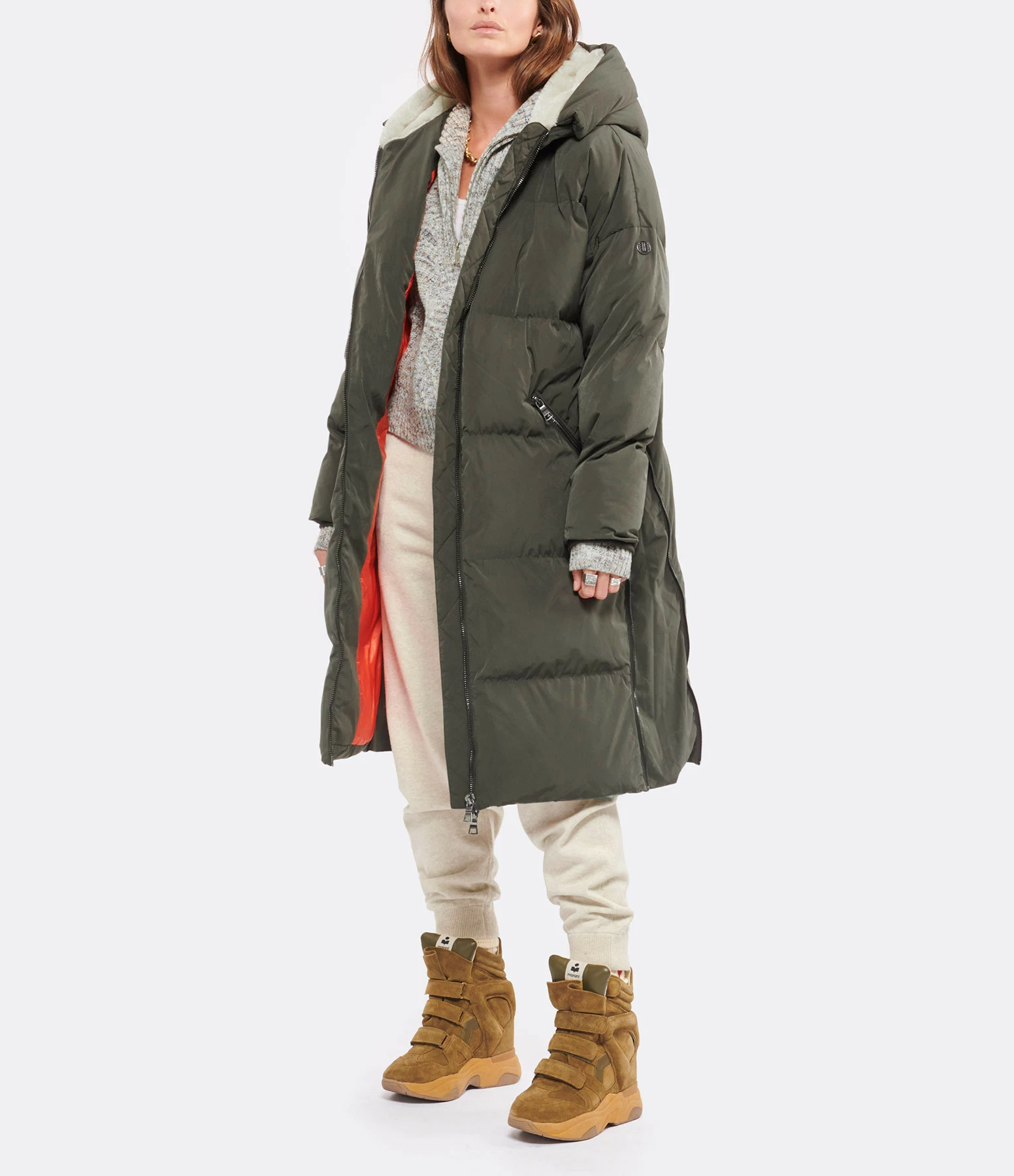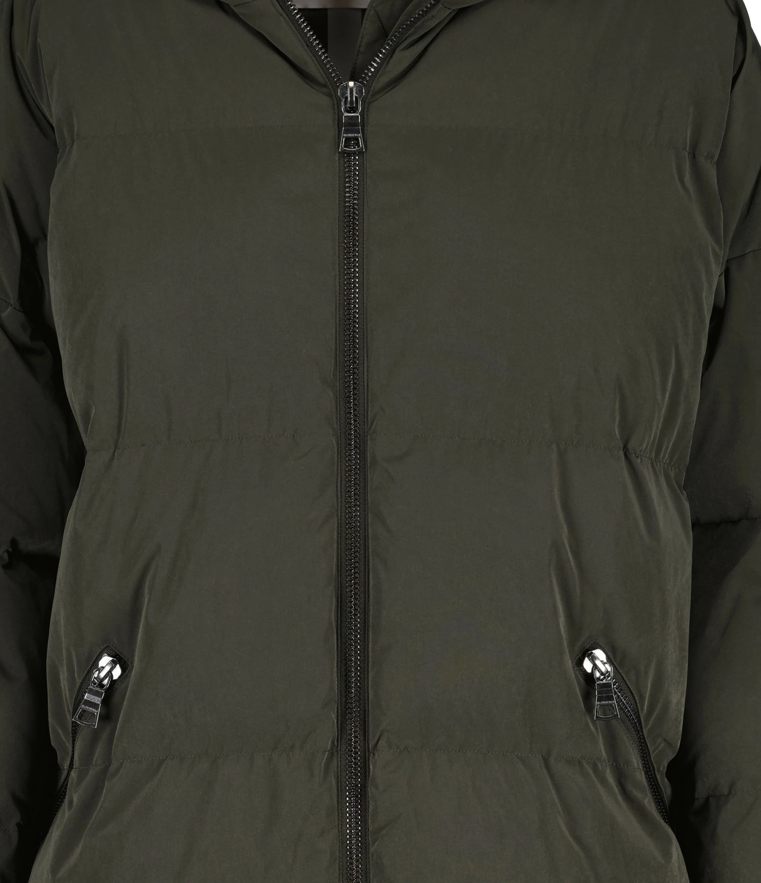 Veste doudoune longue matelassée en tissu technique vert nuit. Col montant à capuche doublée en duvet synthétique. Manches longues avec poignets en coton molletonné côtelé. Détail logo métallique sur la manche gauche. Fermeture zippée sur le devant avec double zip. Deux poches zippées sur le devant. Une poche zippée intérieure. Fermetures zippées latérales pour plus d’aisance au niveau des jambes. Logo gravée sur les curseurs des zips. Coupe droite. Base droite. Doublée.