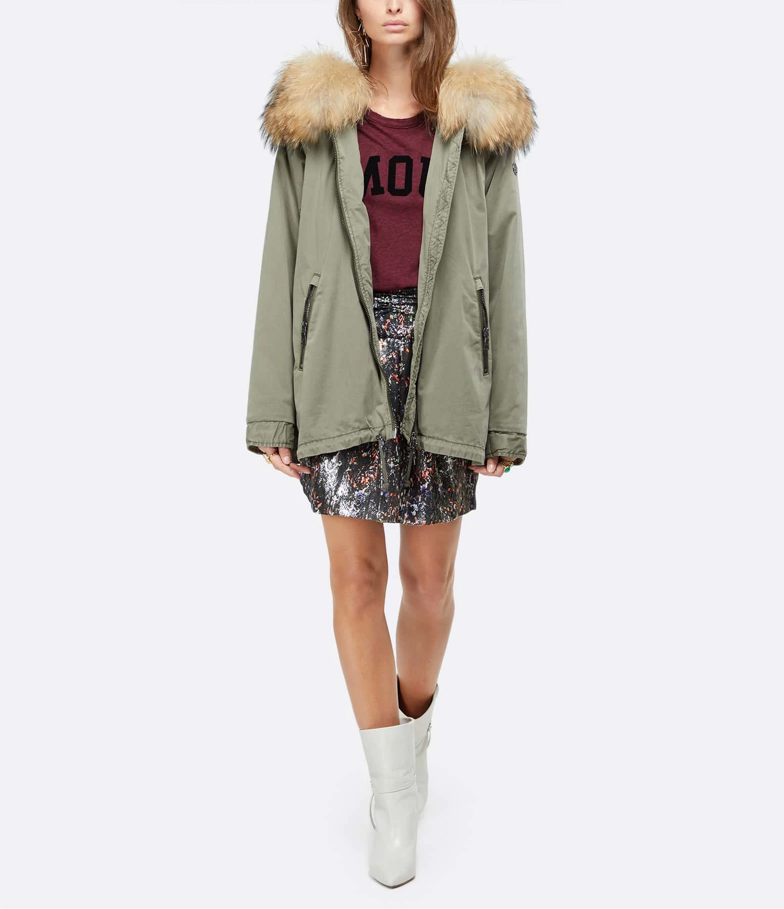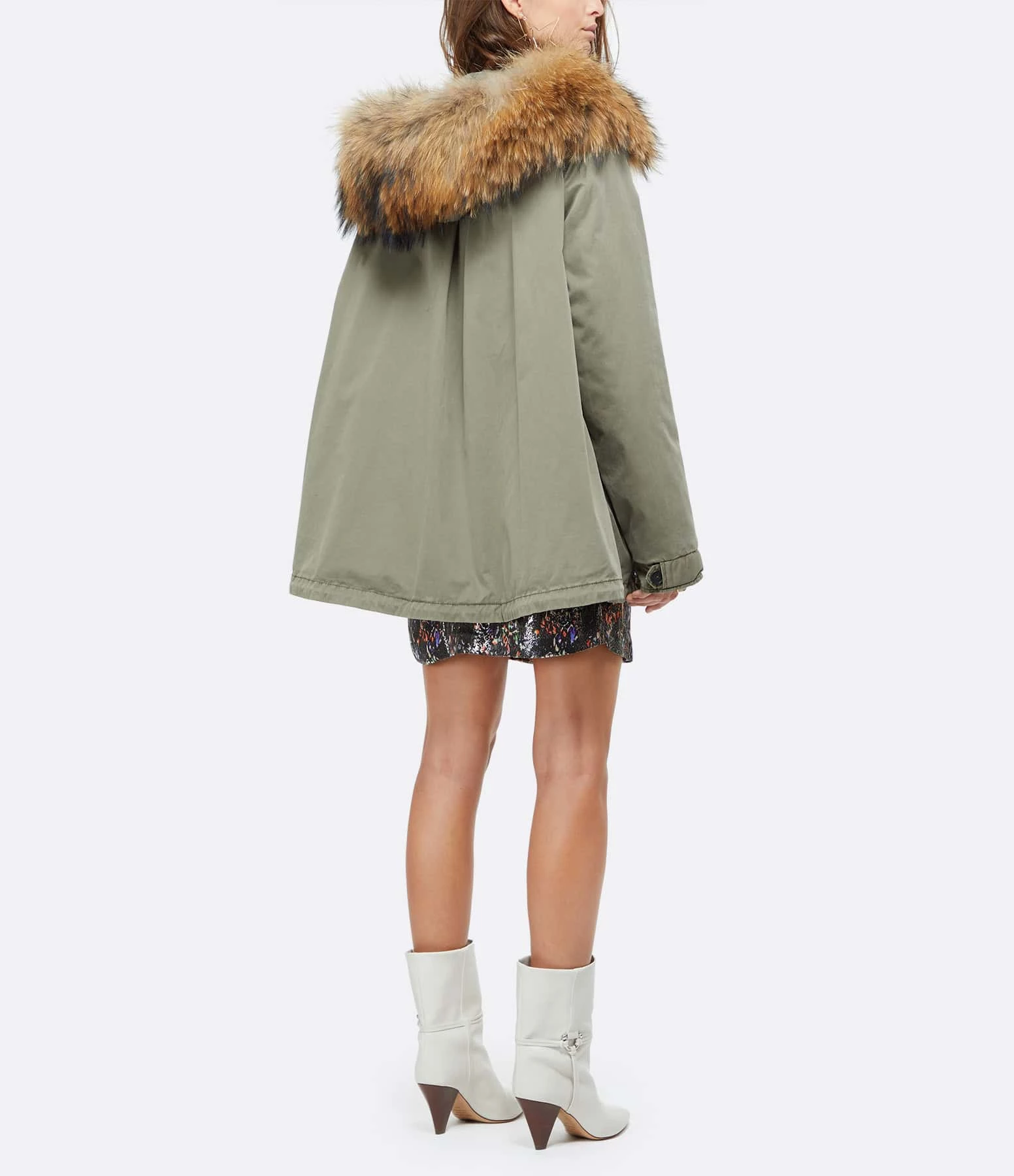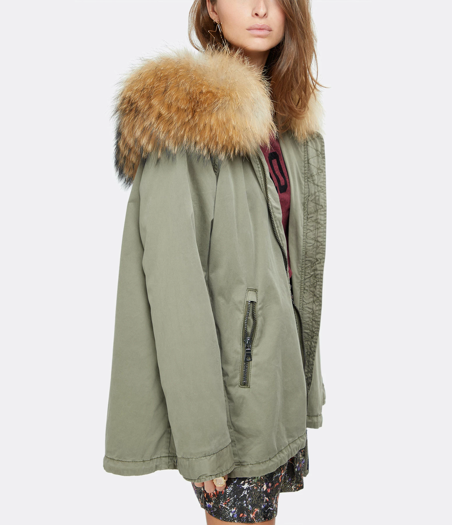 Parka mi-longue très chaude en coton kaki. Capuche avec col en fourrure de raton-laveur amovible par boutons pression. Manches longues avec poignets boutonnés. Petit logo métallique sur la manche gauche. Deux poches zippées sur l’avant. Fermeture par un zip métallique. Base droite, ajustable par cordons sur l’avant. Doublée.