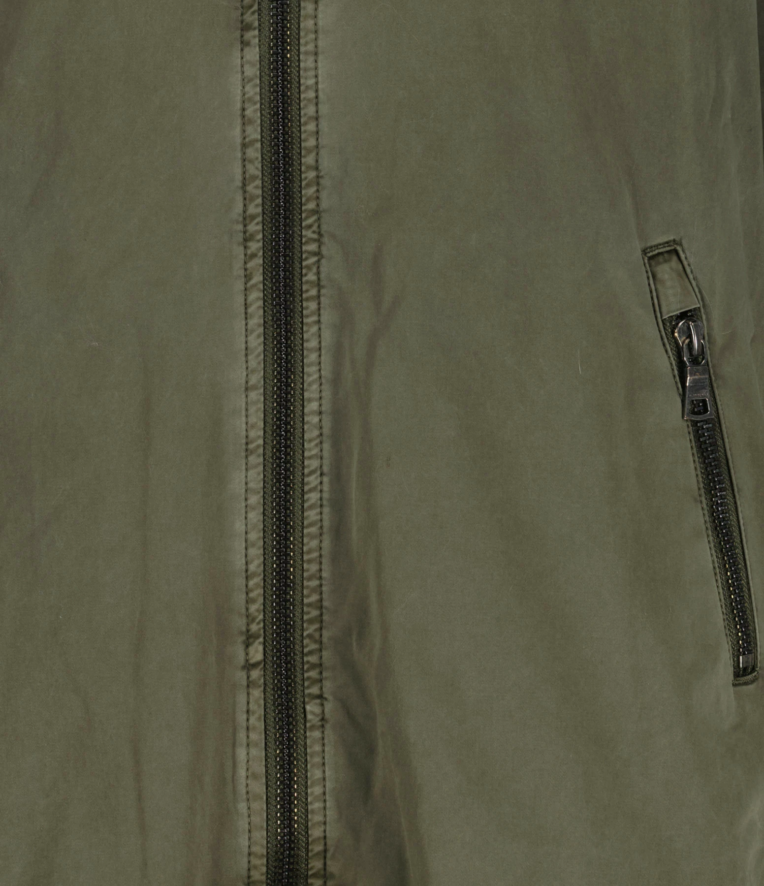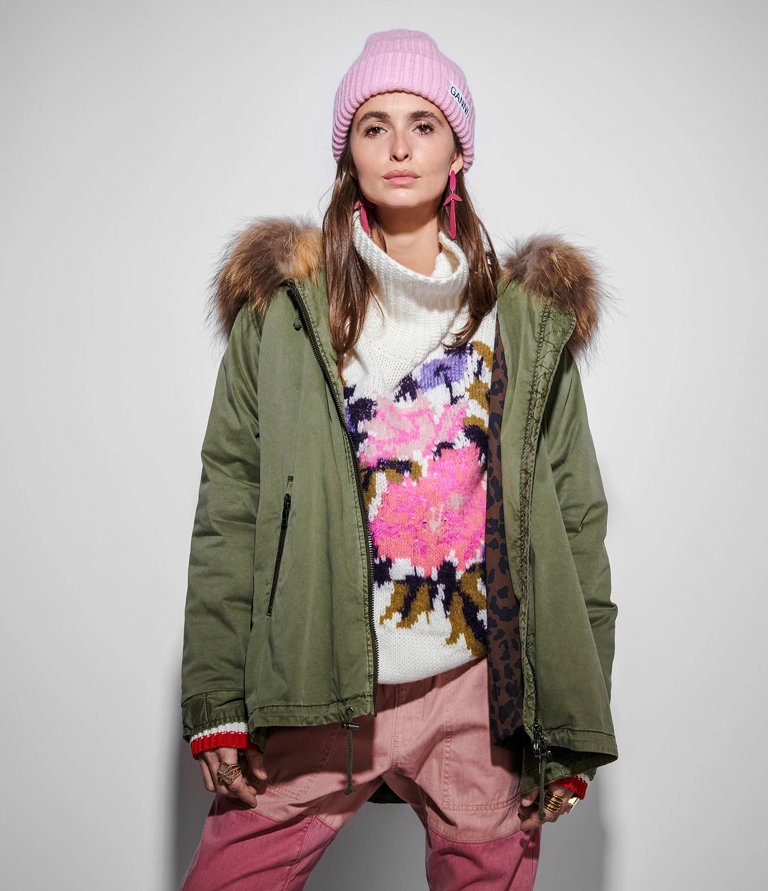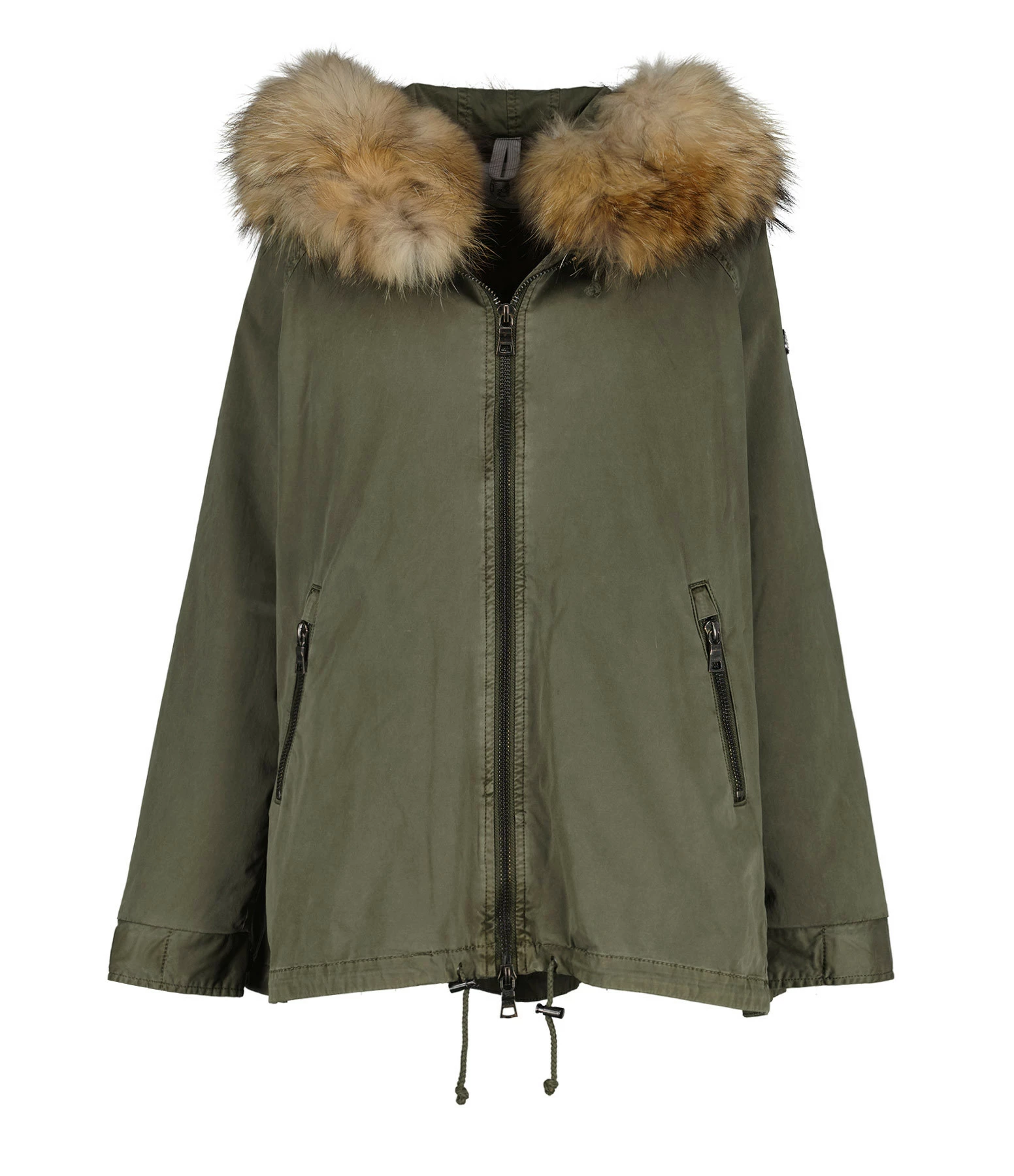 Parka mi-longue très chaude en coton kaki. Capuche avec col en fourrure de raton-laveur amovible par boutons pression. Manches longues avec poignets boutonnés. Petit logo métallique sur la manche gauche. Deux poches zippées sur l’avant. Fermeture par un zip métallique. Base droite, ajustable par cordons sur l’avant. Doublée.