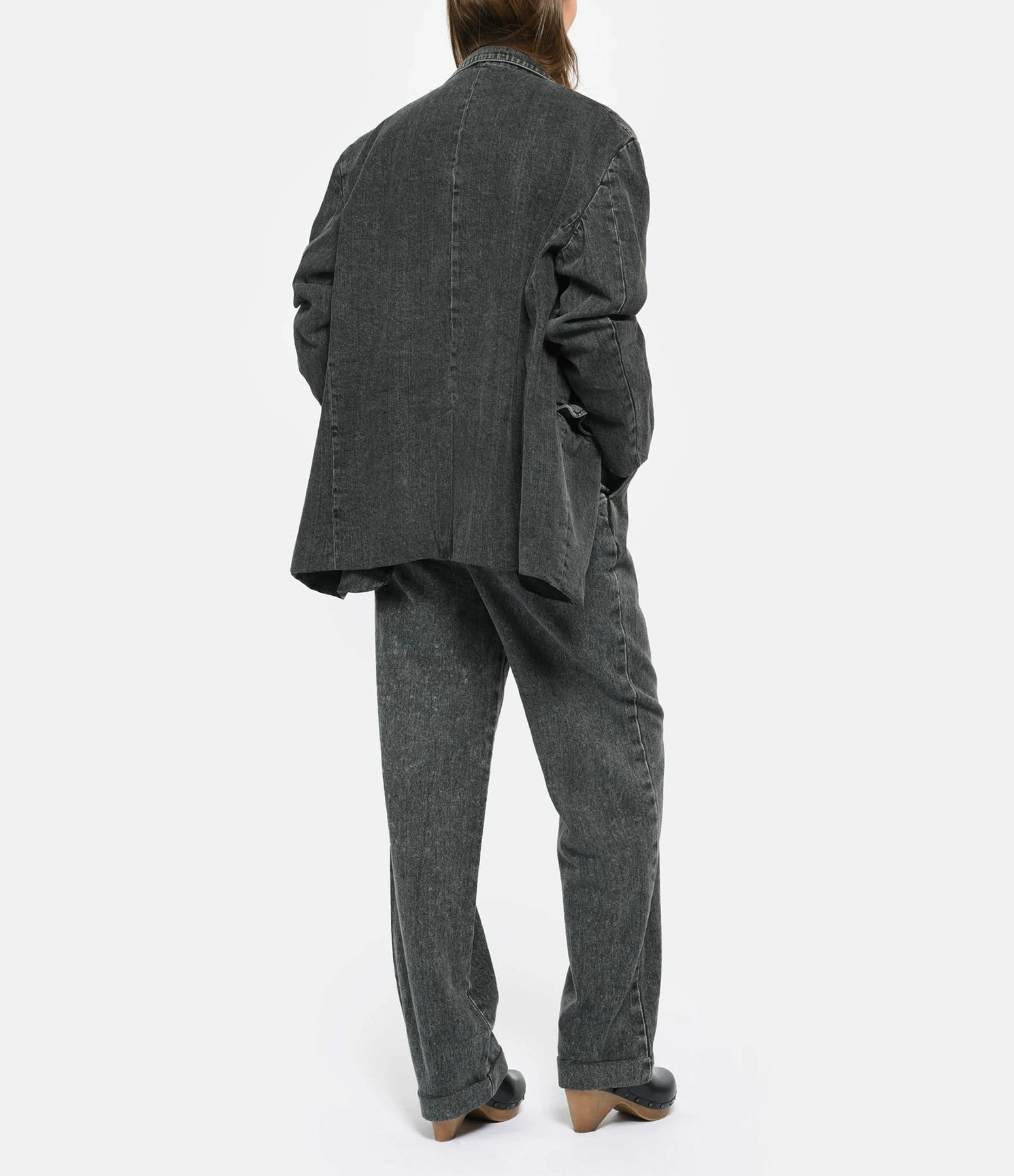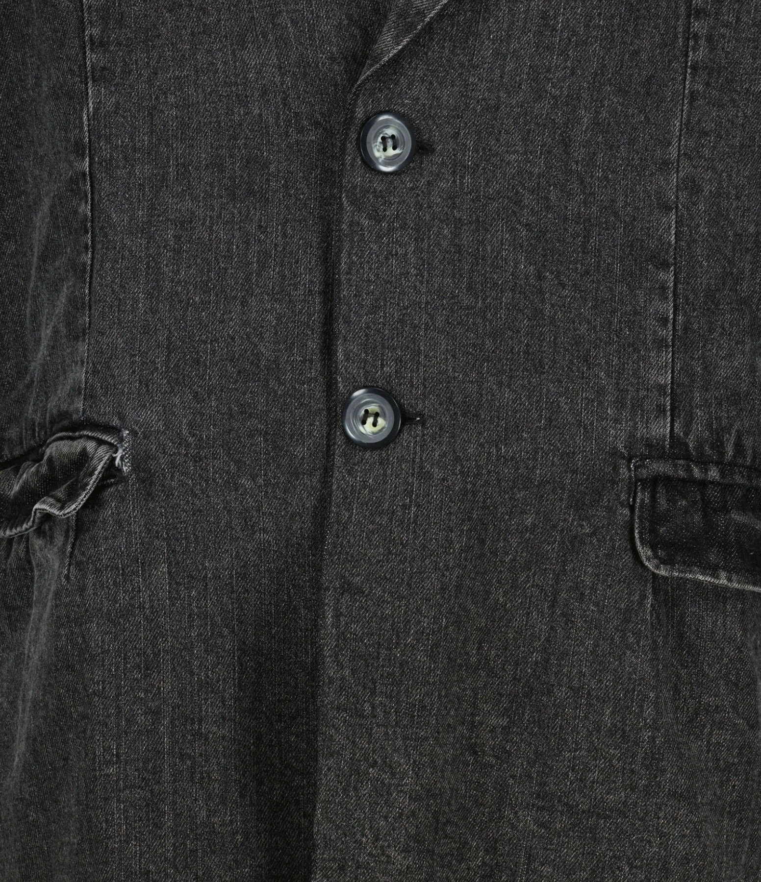 Veste blazer en denim de coton noir délavé. Col tailleur cranté. Manches longues tailleur. Fermeture boutonnée simple sur le devant. Boutons gris effet corne. Deux poches à rabat sur le devant. Une fente milieu dos. Coupe droite large. Base arrondie. Doublée.