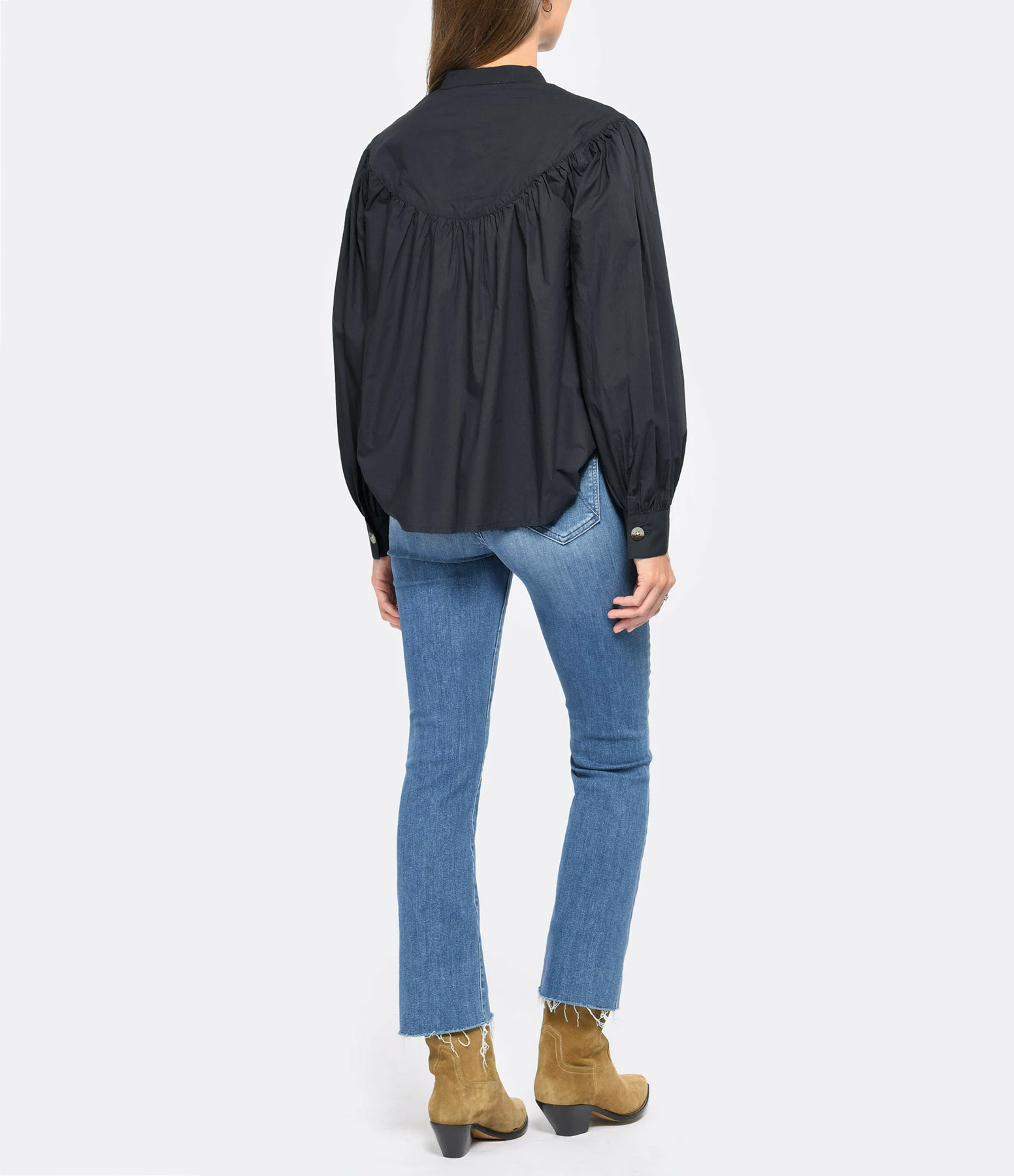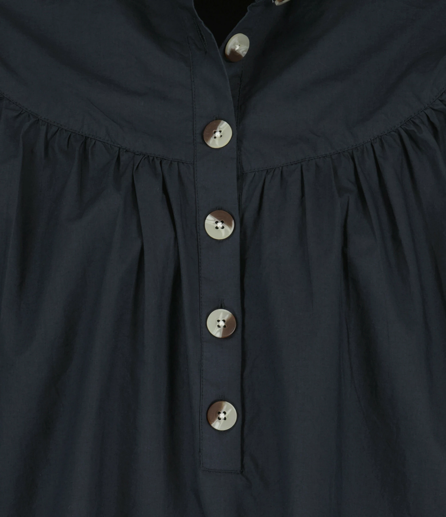 Blouse en coton bleu marine. Col rond. Boutons à l’avant. Manches longues resserrées aux poignets par un bouton. Coupe droite. Base droite.