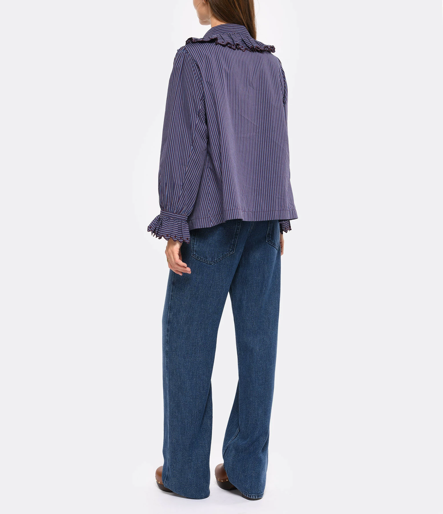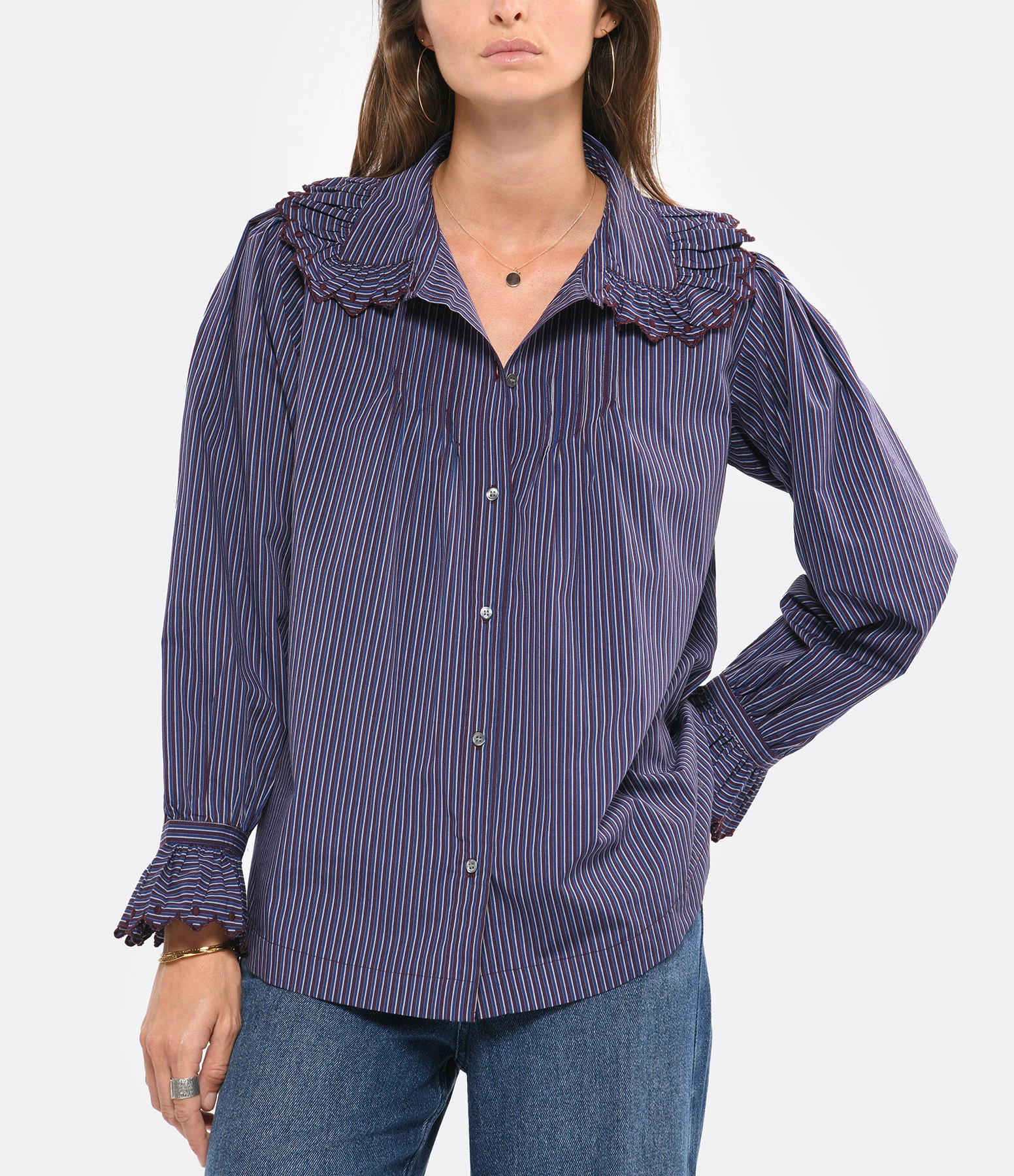 Chemise en coton à rayures bleues et violettes. Col plat orné de volants. Manches longues bouffantes avec poignets volantés. Fermeture boutonnée sur le devant avec boutons nacrés. Détails plissé sur le plastron. Coupe droite ample. Base droite.