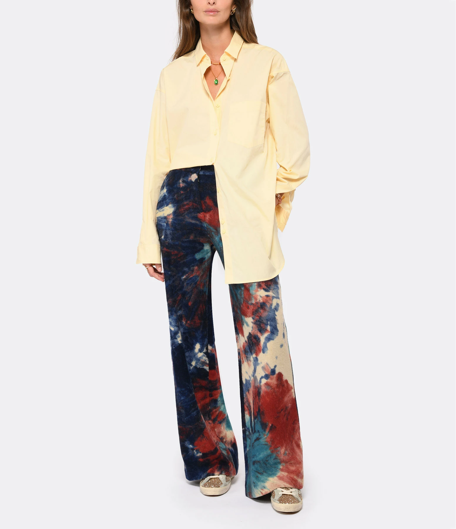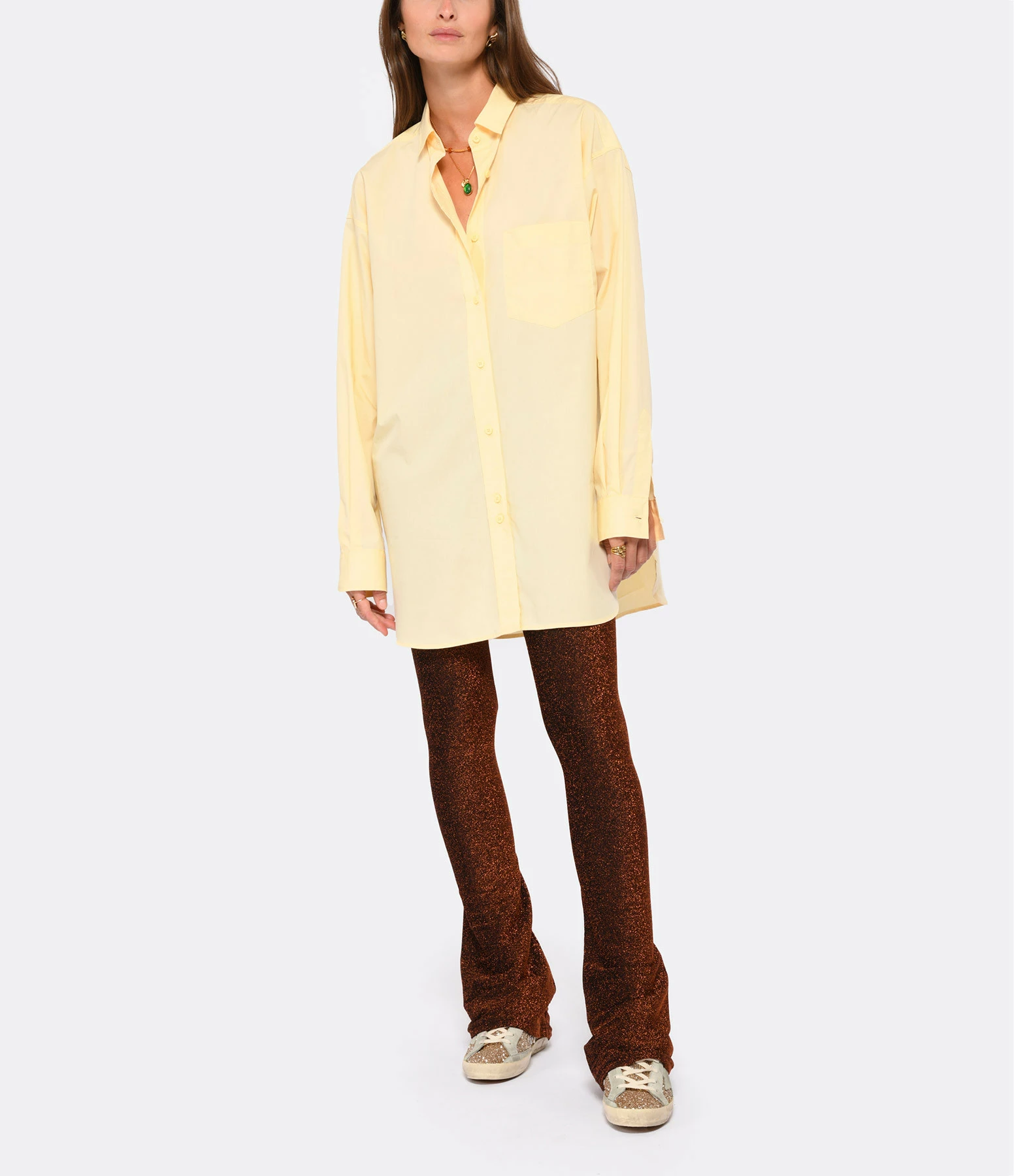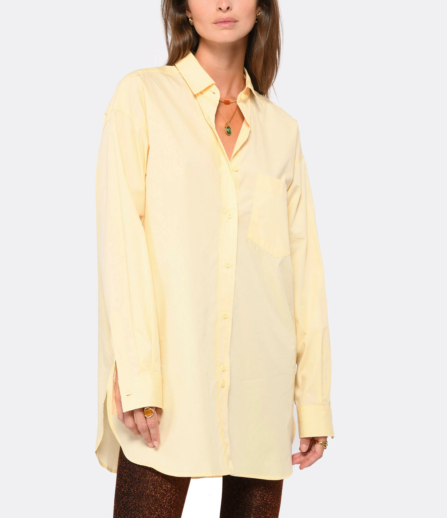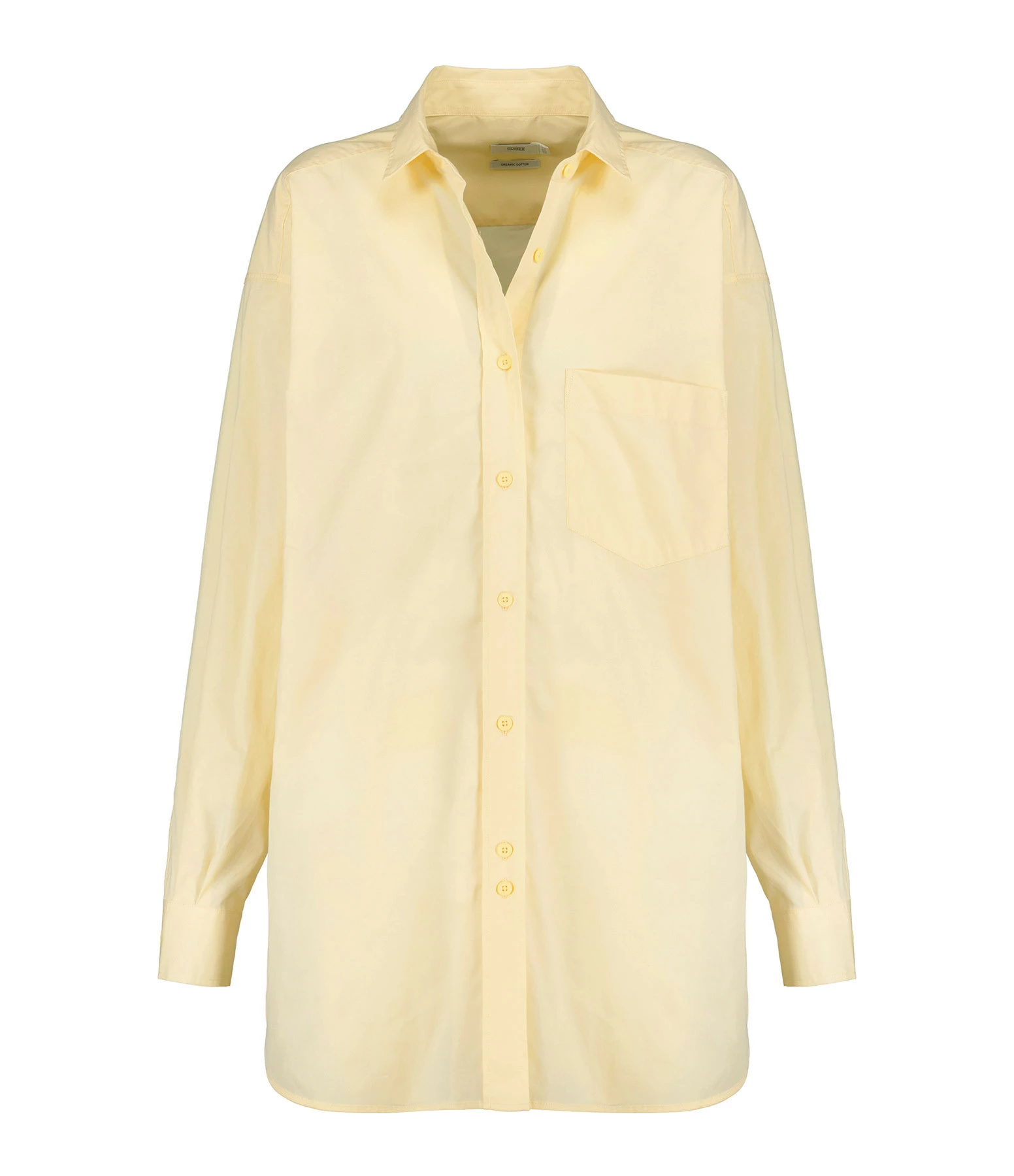 Chemise en coton biologique jaune. Col chemisier. Une poche plaquée à l’avant. Manches longues avec poignets boutonnés. Fermeture boutonné sur le devant. Coupe ample. Base arrondie.