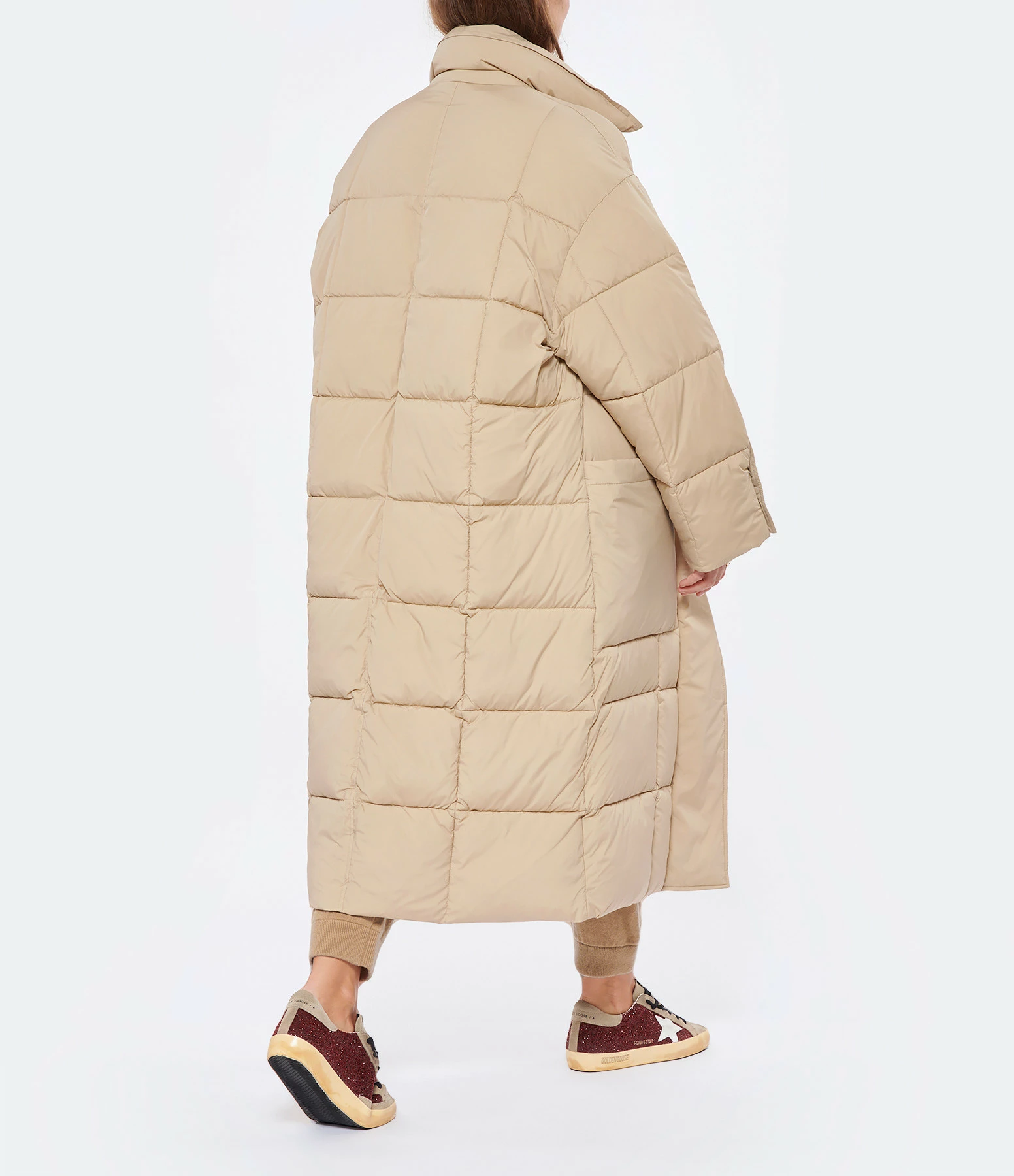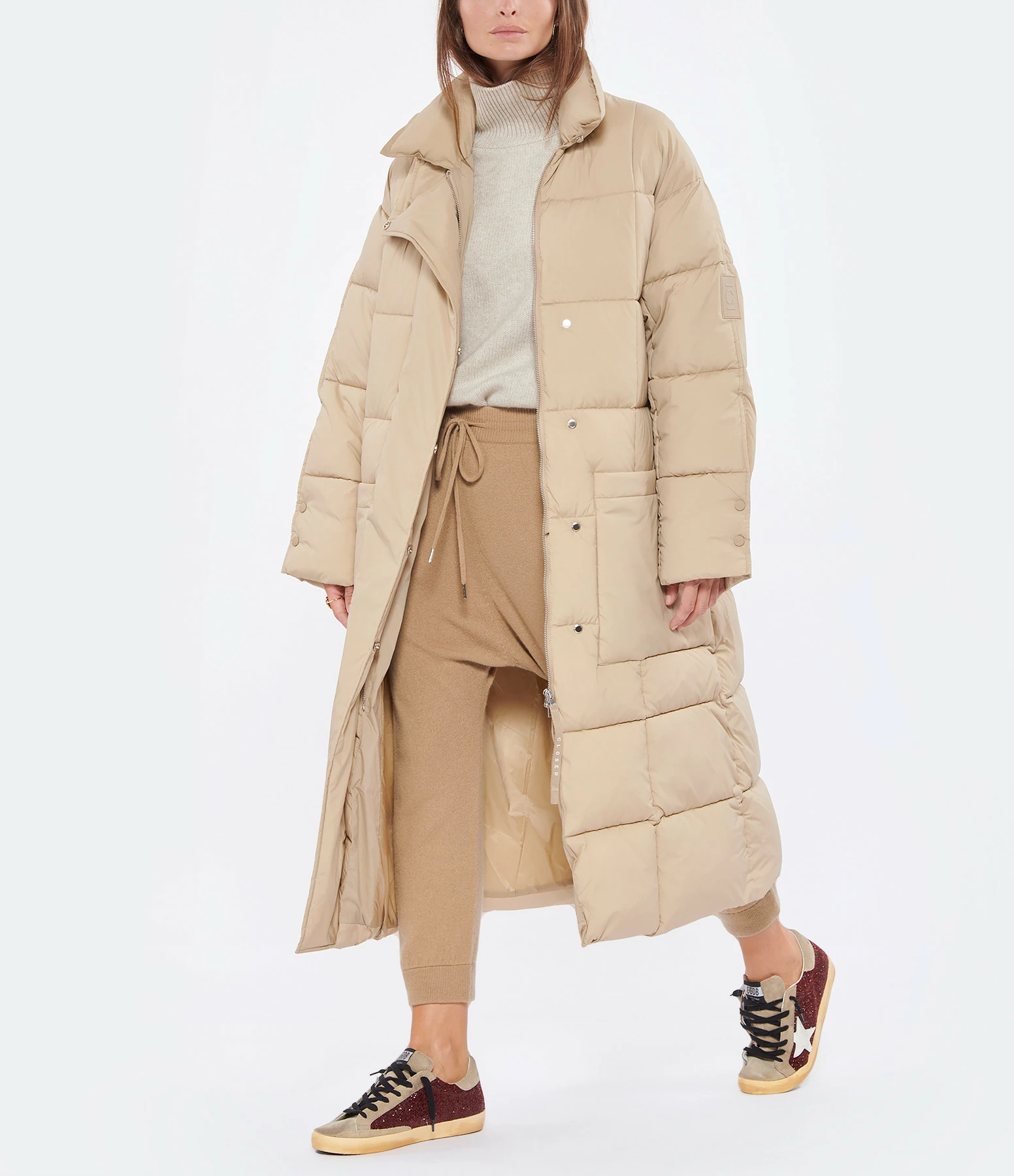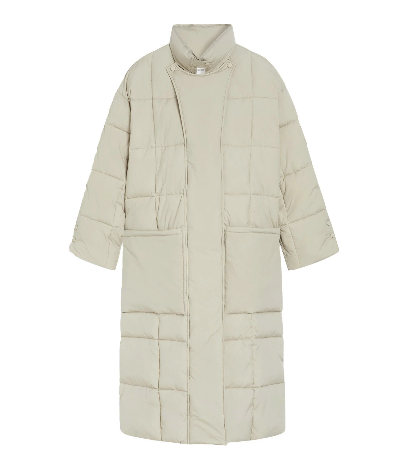 Doudoune beige longue matelassée. Col montant. Patte de boutonnage droite avec fermeture zippée et boutons pressions. Poches latérales. Poche intérieure. Coupe droite ample. Base droite.