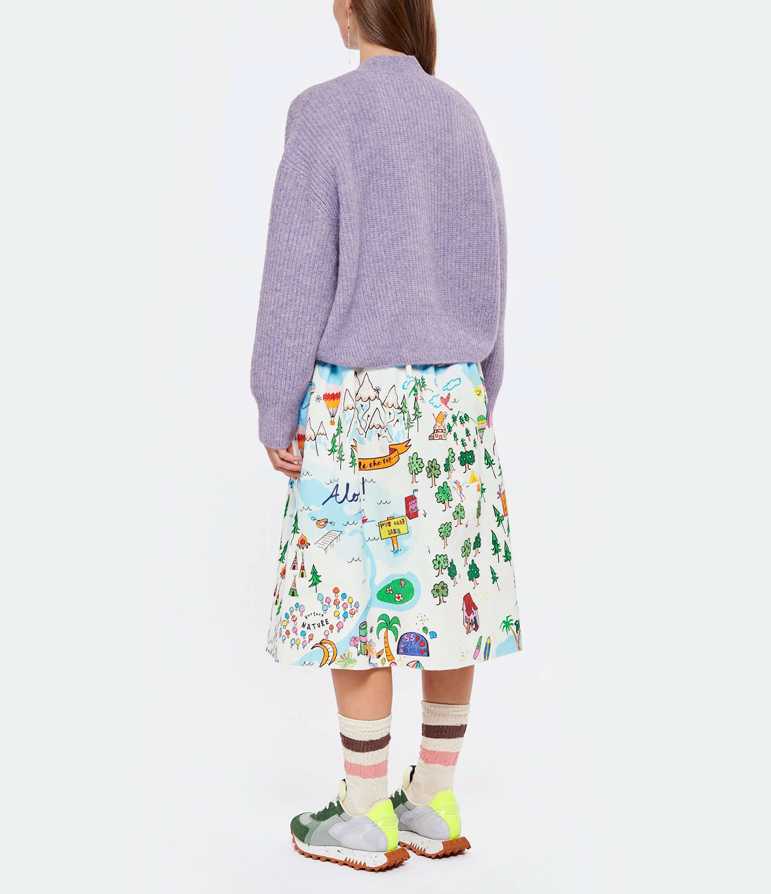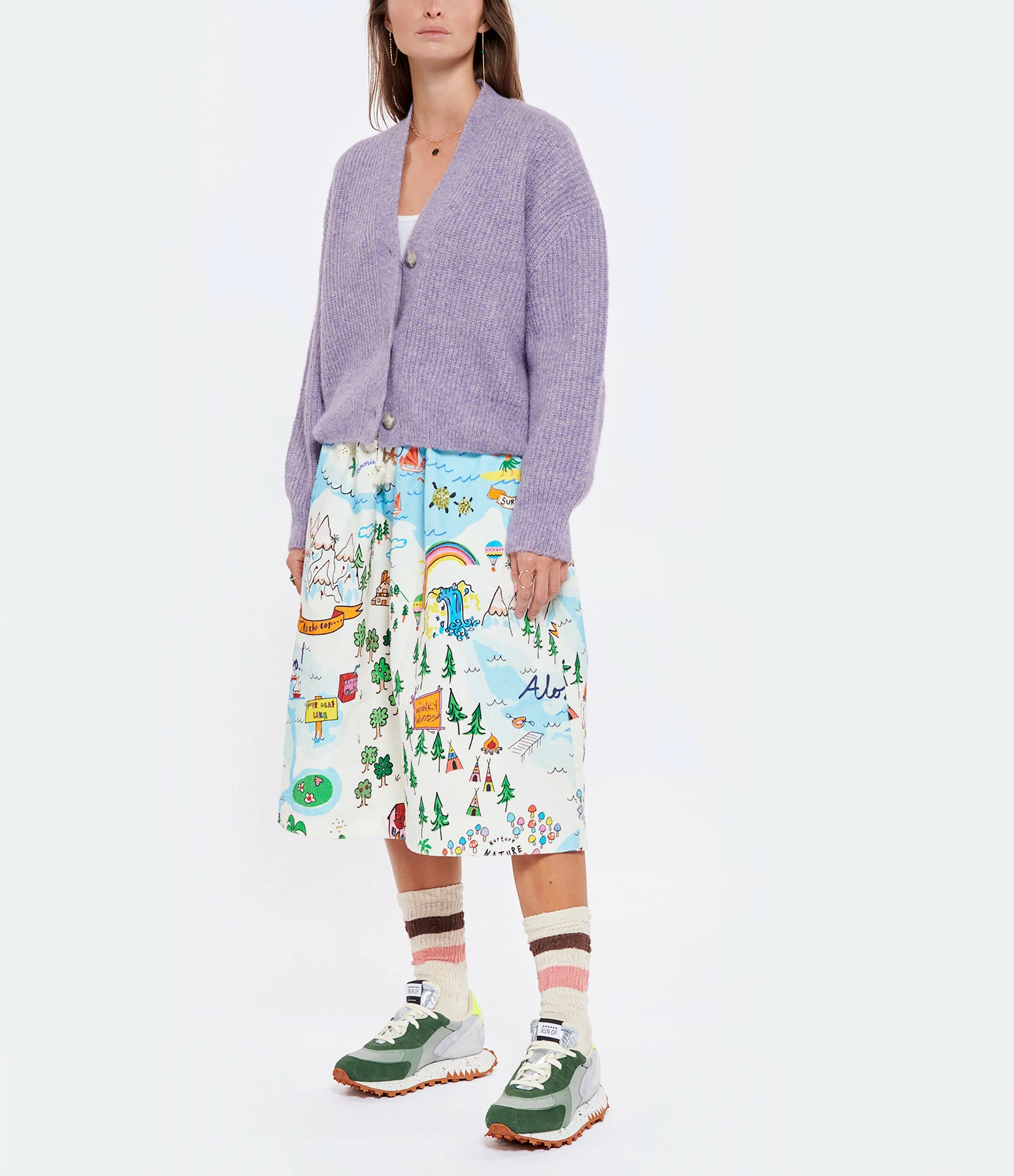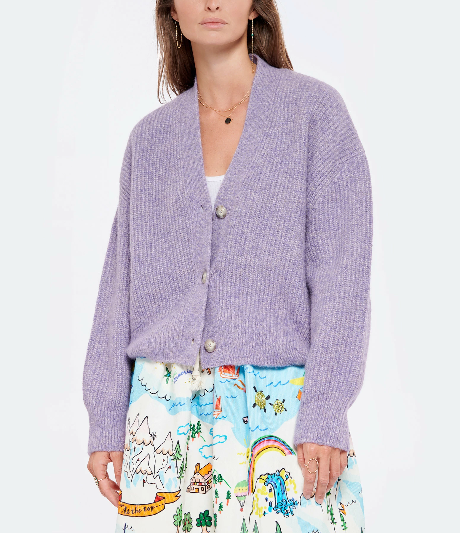 Cardigan en maille côtelée lilas. Encolure en V. Manches longues amples. Fermeture boutonnée sur le devant avec boutons aspect corne. Coupe droite ample. Base droite. Non doublé.