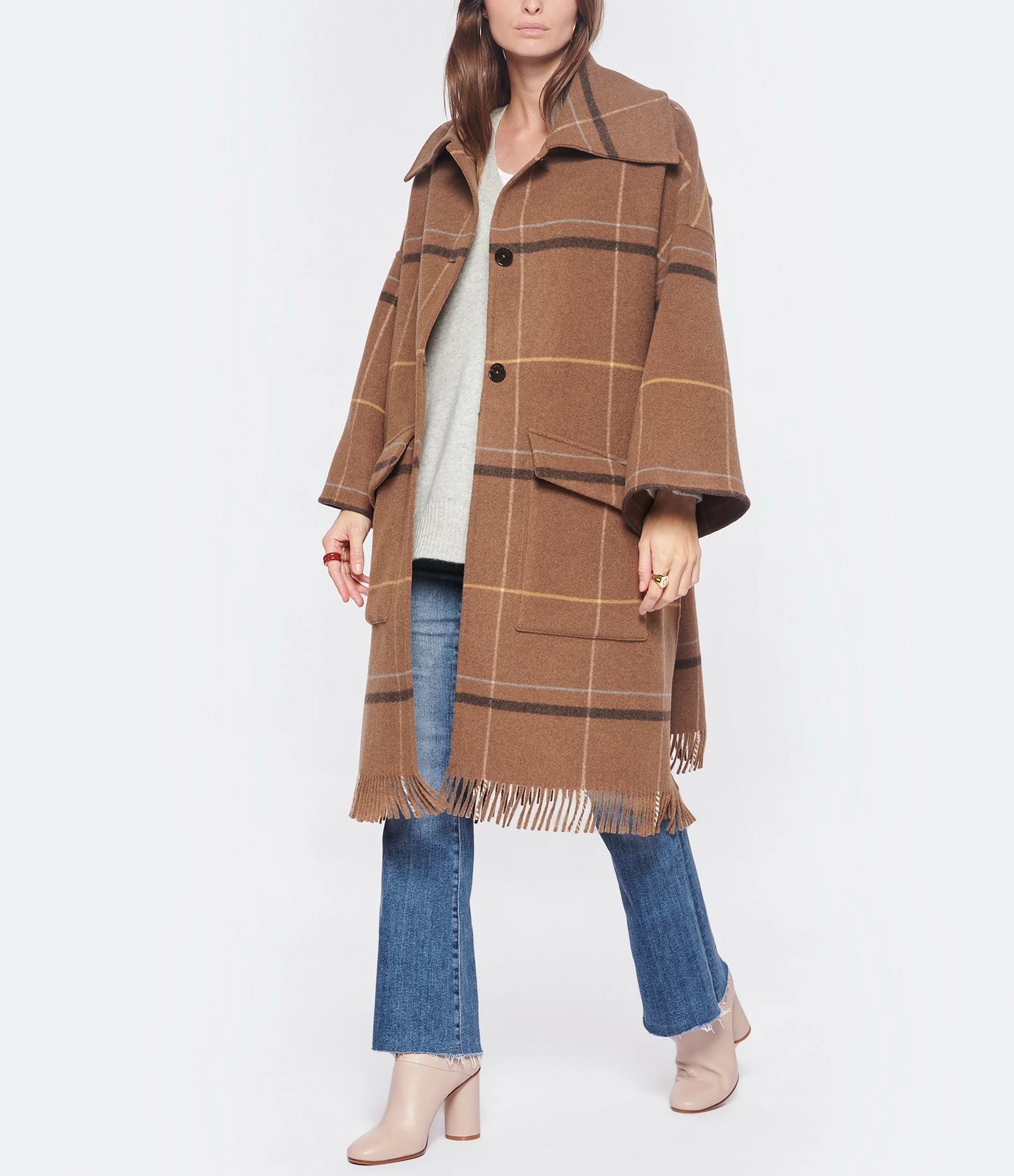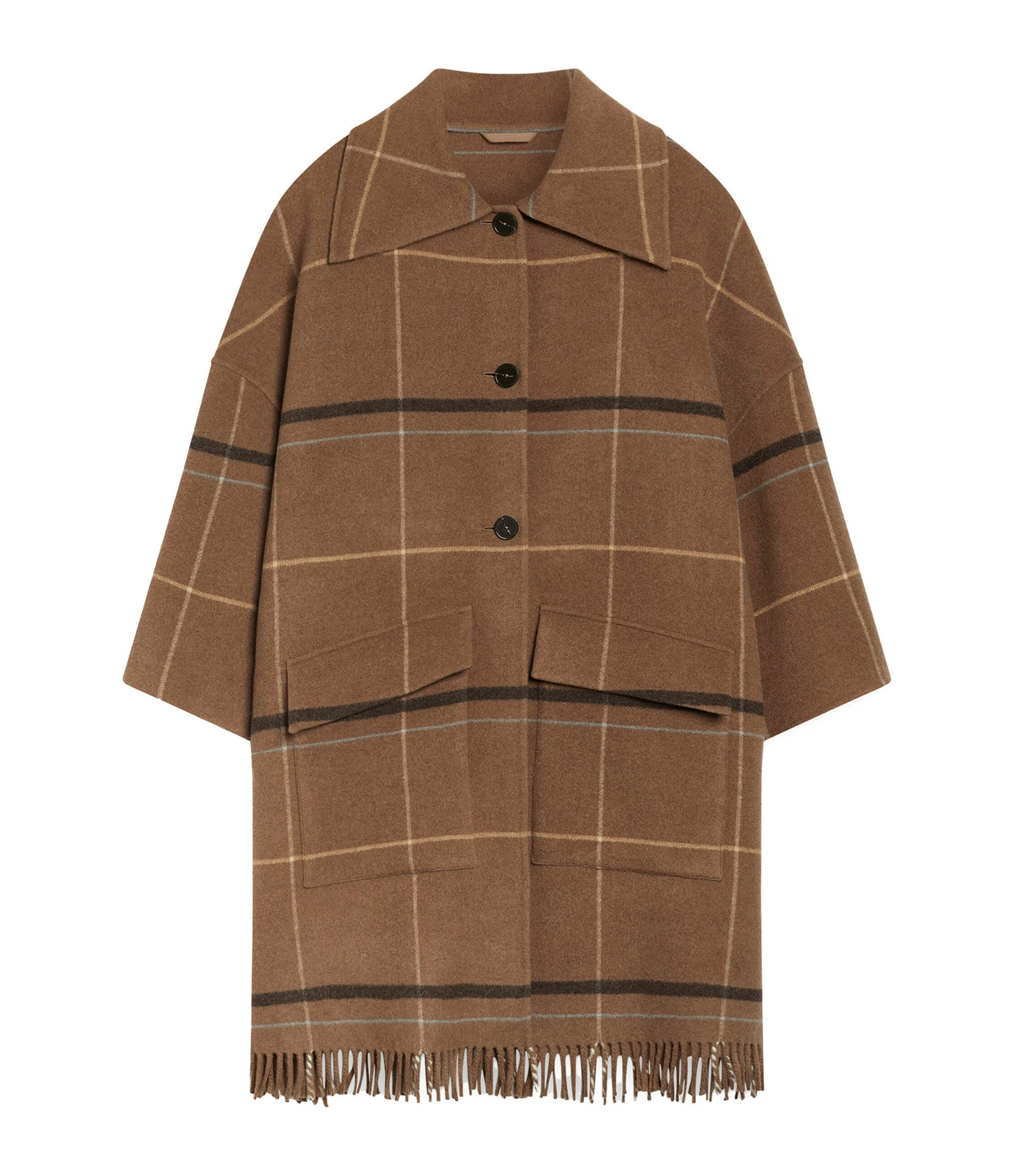 Manteau 3/4 en laine mélangée à carreaux dans des tons marron. Col chemise. Manches longues. Fermeture boutonnée simple sur le devant. Boutons marron effet corne. Deux poches plaquées à rabat sur le devant. Fentes latérales. Coupe large, d’inspiration poncho. Base droit frangée. Non doublé.