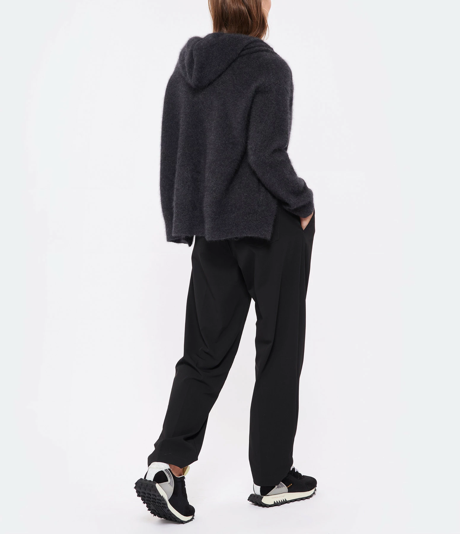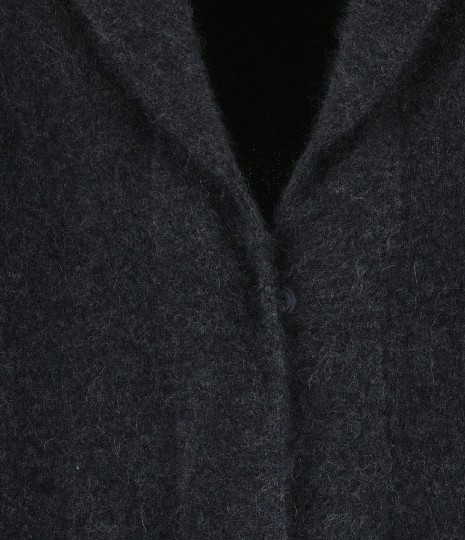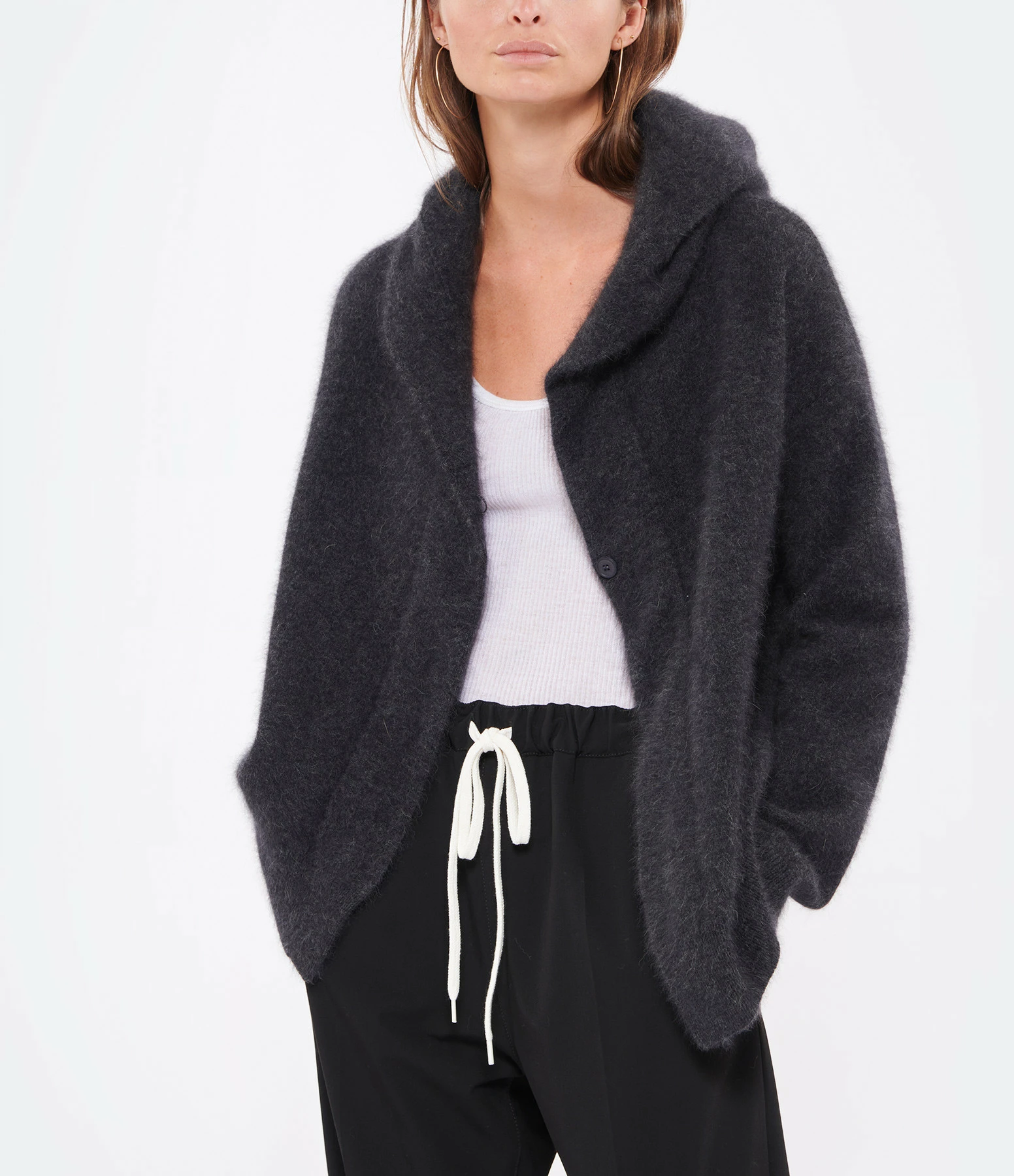 Gilet à capuche en laine de raton laveur asiatique gris. Fermeture boutonnée simple sur le devant. Bouton gris. Manches longues avec poignets côtelés. Deux poches prises dans la couture sur le devant. Coupe droite ample. Base droite côtelée.
