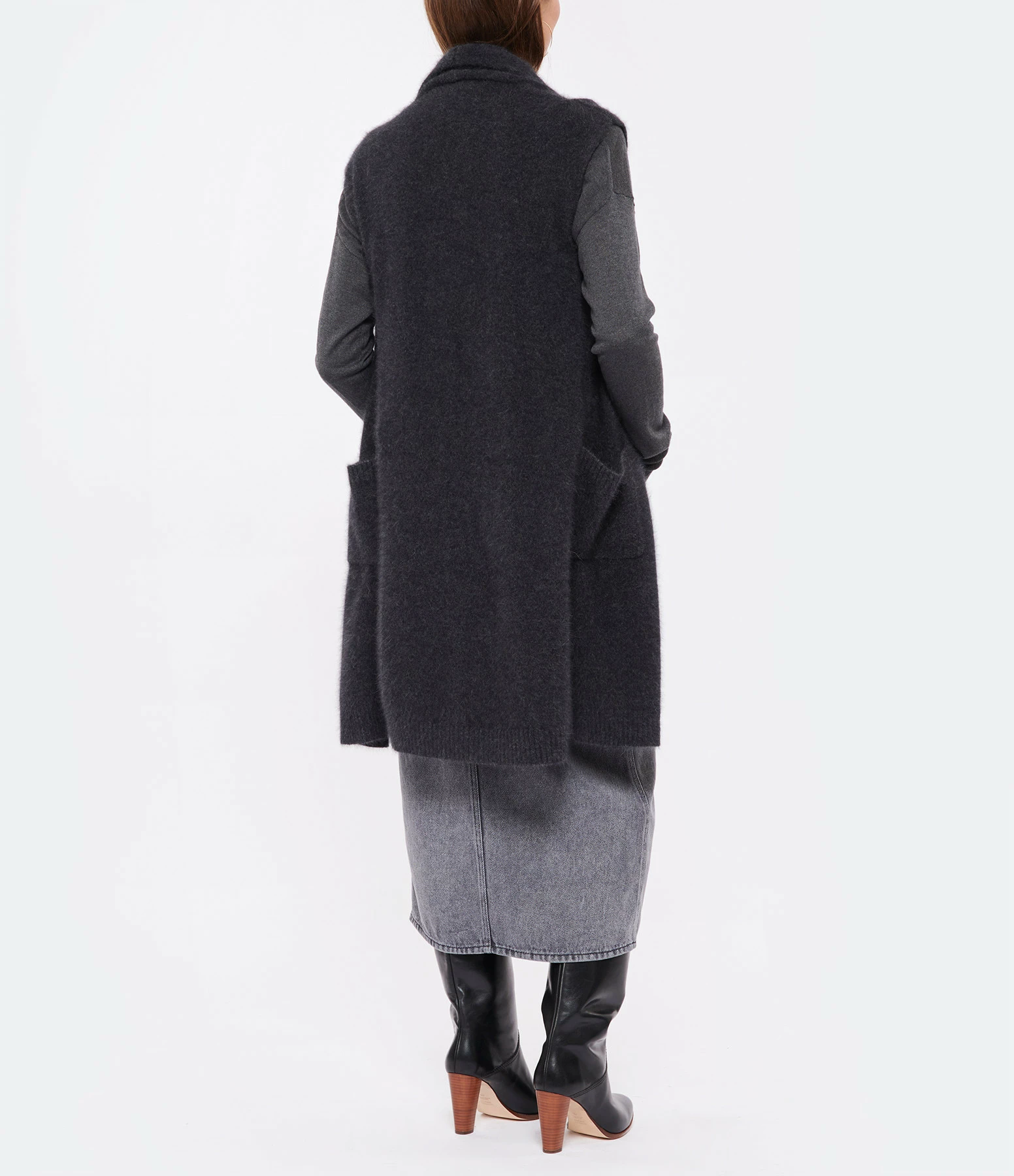 Gillet long en laine gris. Col châle. Sans manches. Fermeture boutonnée simple sur le devant. Deux poches plaquées sur le devant. Fentes latérales. Coupe droite. Base droite côtelée.