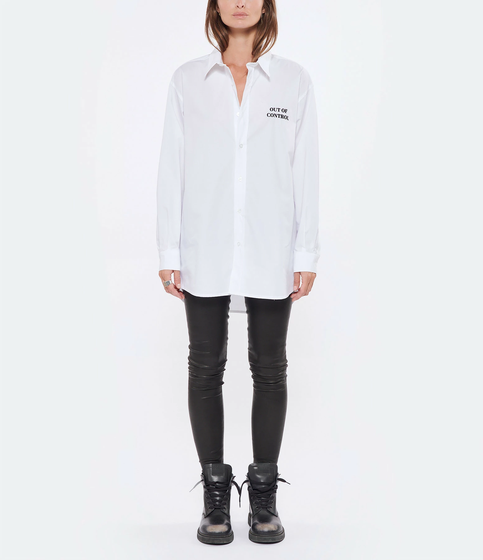Chemise en coton blanc. Inscription brodée noir “OUT OF CONTROL” sur la poitrine. Col chemisier. Fermeture boutonnée. Manches longues. Coupe ample. Base droite.
