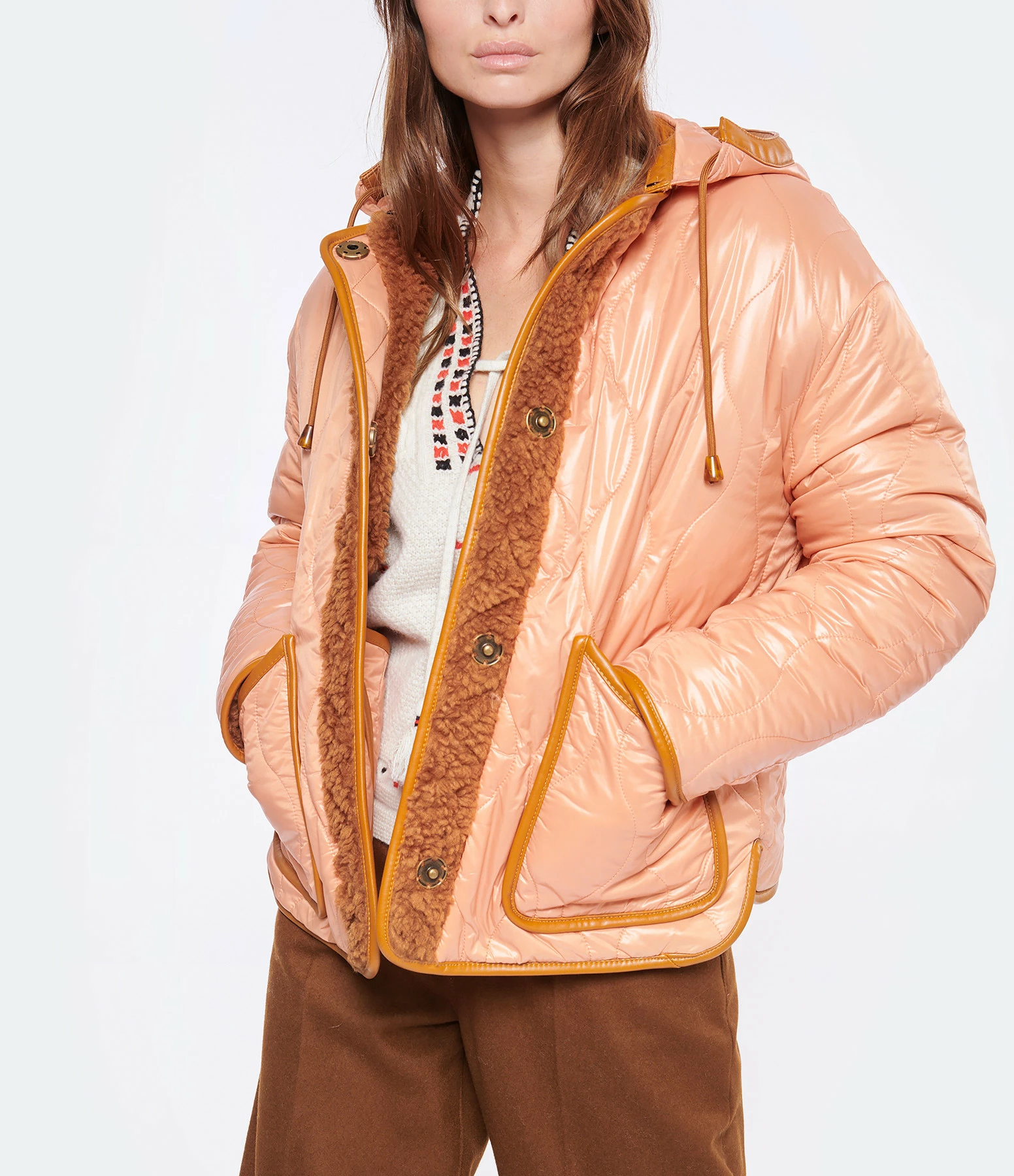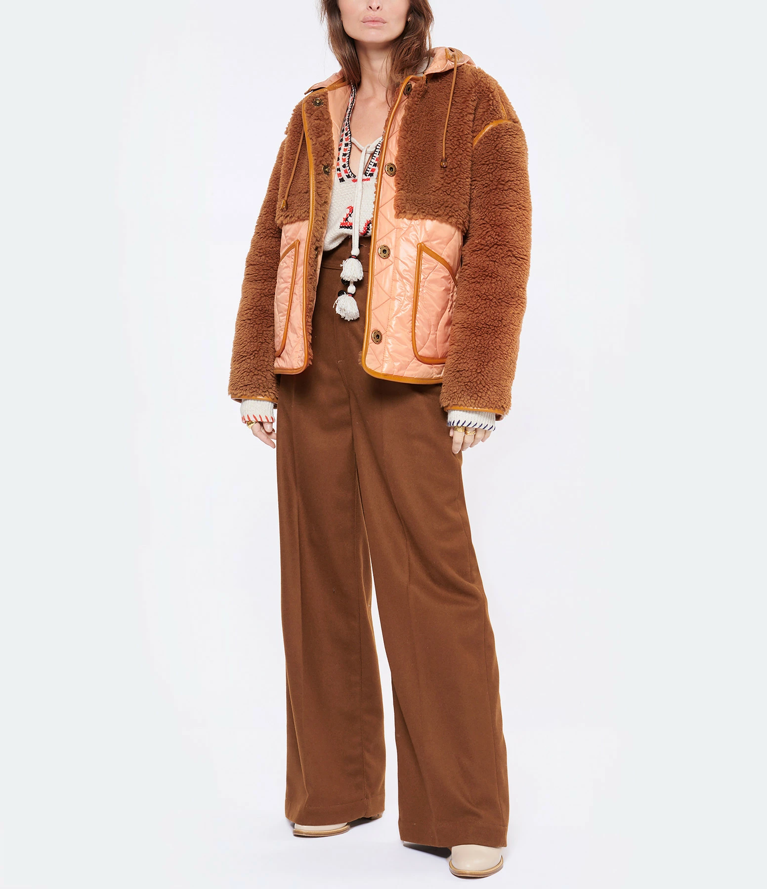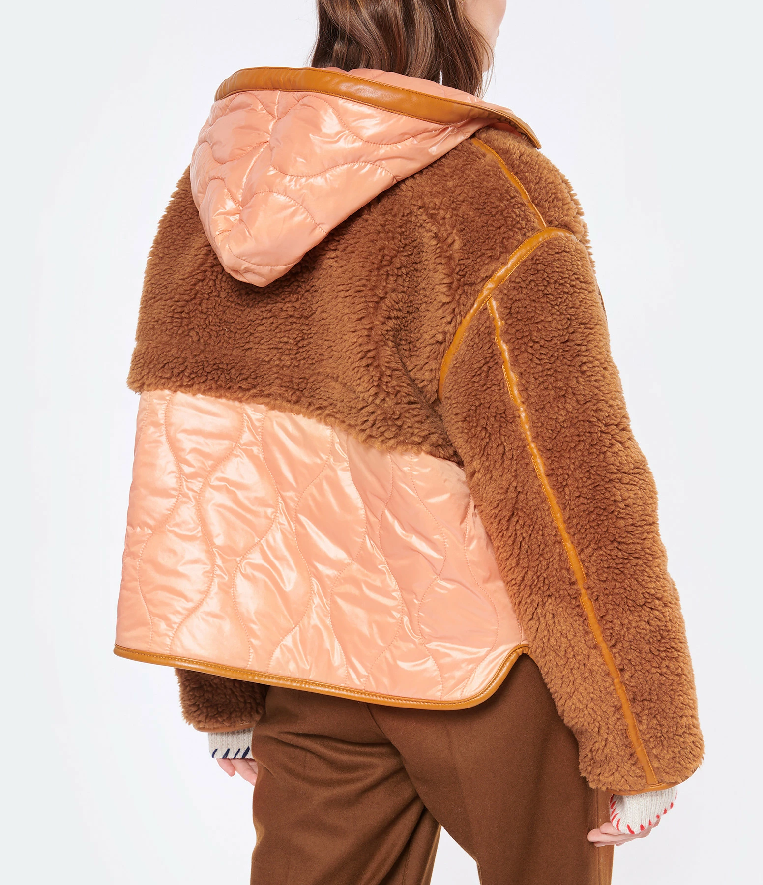 Veste courte bi-matière : une partie en fausse peau lainée marron et une partie matelassée en tissu technique couleur saumon. Encolure arrondie. Capuche amovible par boutons avec cordons de serrage. Manches longues. Épaules tombantes. Fermeture pressionnée sur le devant à patte cachée. Deux poches plaquées sur le devant. Petites fentes latérales. Coupe large. Base arrondie.
