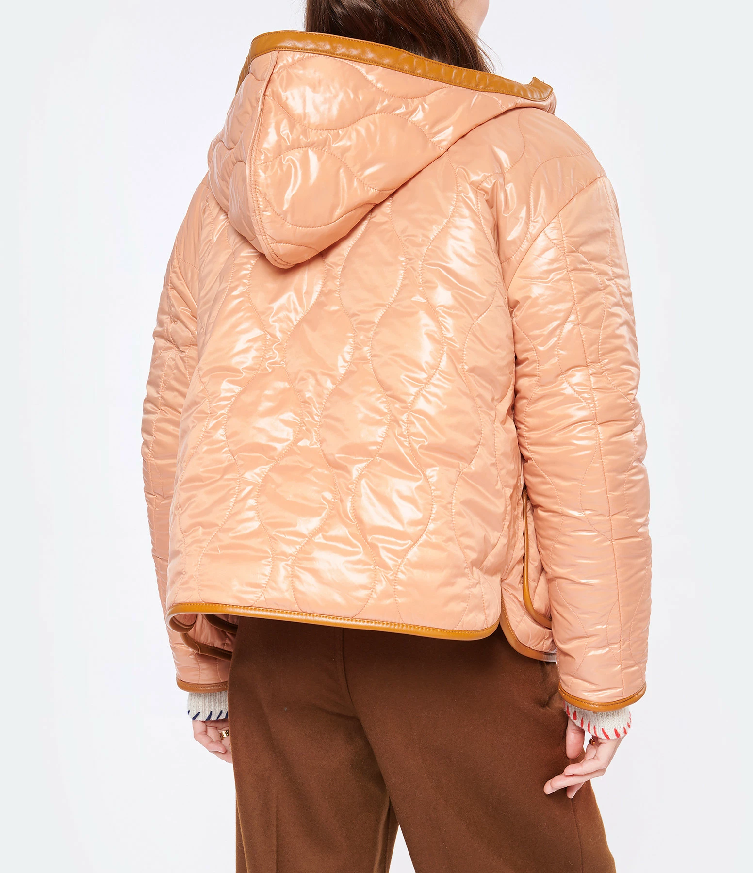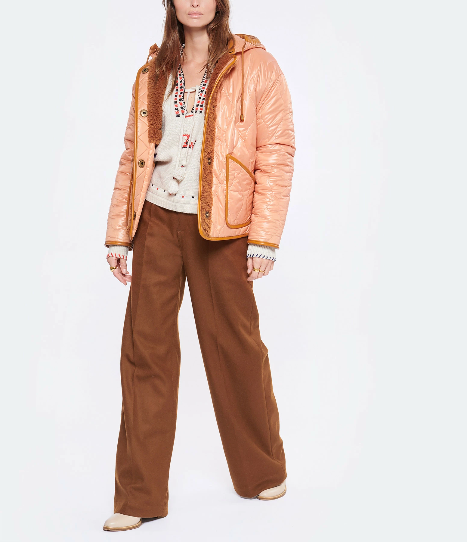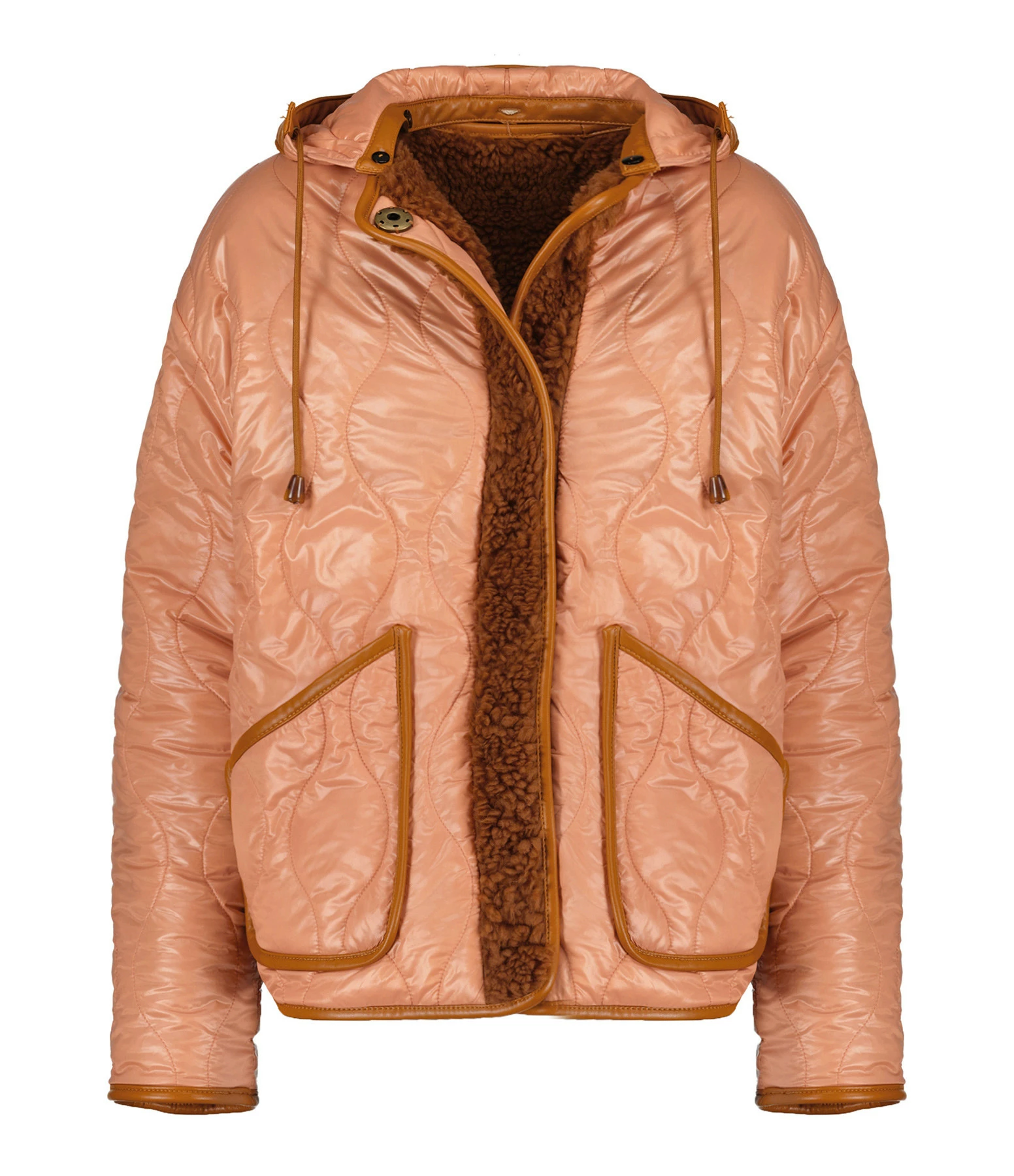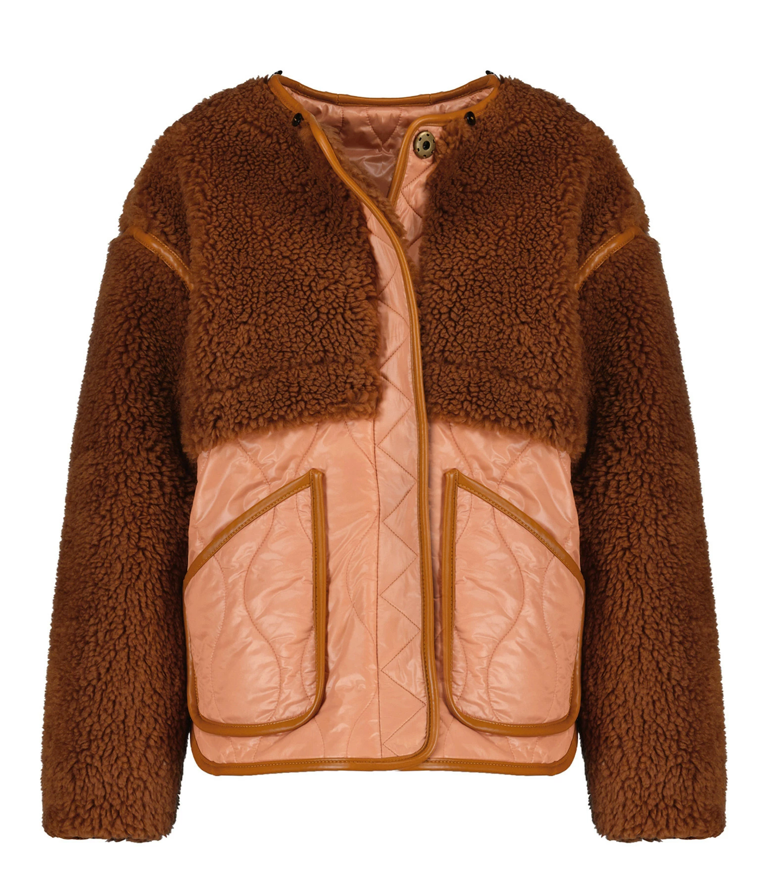 Veste courte bi-matière : une partie en fausse peau lainée marron et une partie matelassée en tissu technique couleur saumon. Encolure arrondie. Capuche amovible par boutons avec cordons de serrage. Manches longues. Épaules tombantes. Fermeture pressionnée sur le devant à patte cachée. Deux poches plaquées sur le devant. Petites fentes latérales. Coupe large. Base arrondie.