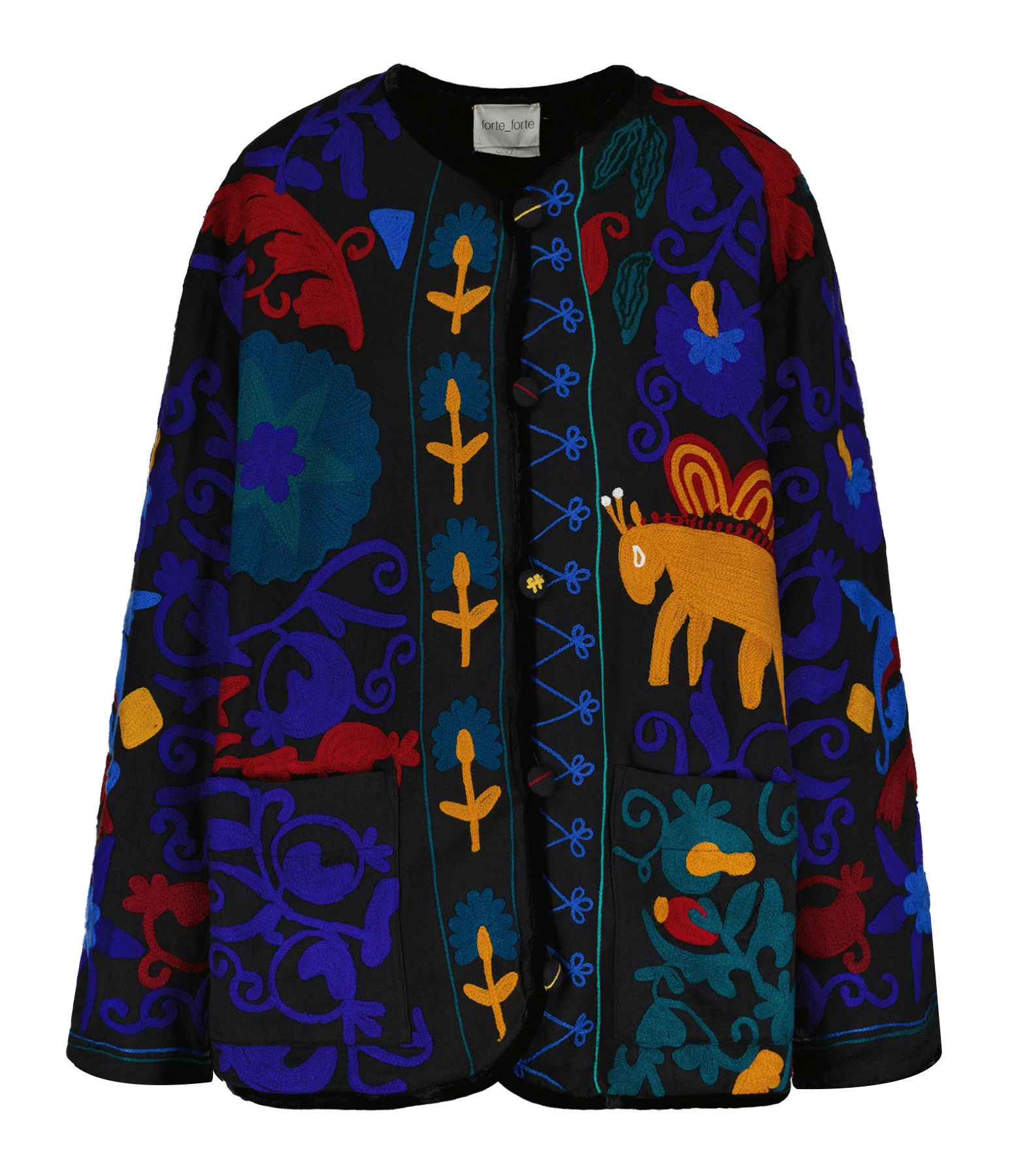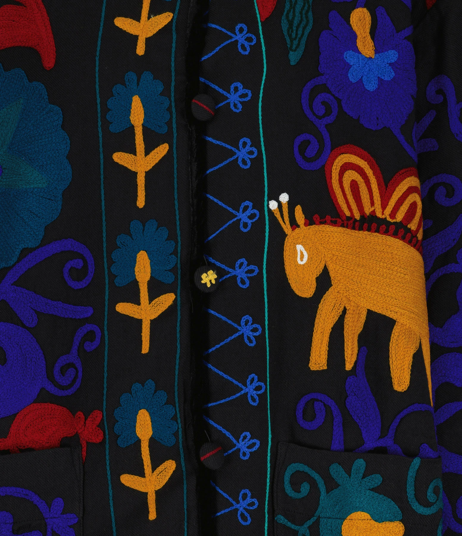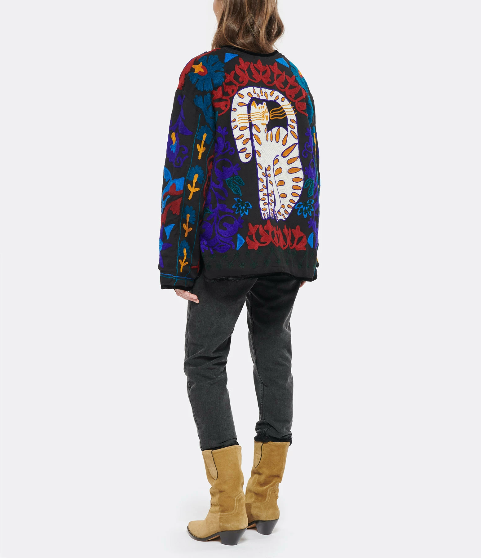 Veste légère en laine noire à broderie colorée. Col arrondi. Manches longues et amples. Fermeture boutonnée. Deux poches plaquée sur le devant. Broderie jaguar au dos. Fentes latérales. Coupe droite large. Base arrondie.