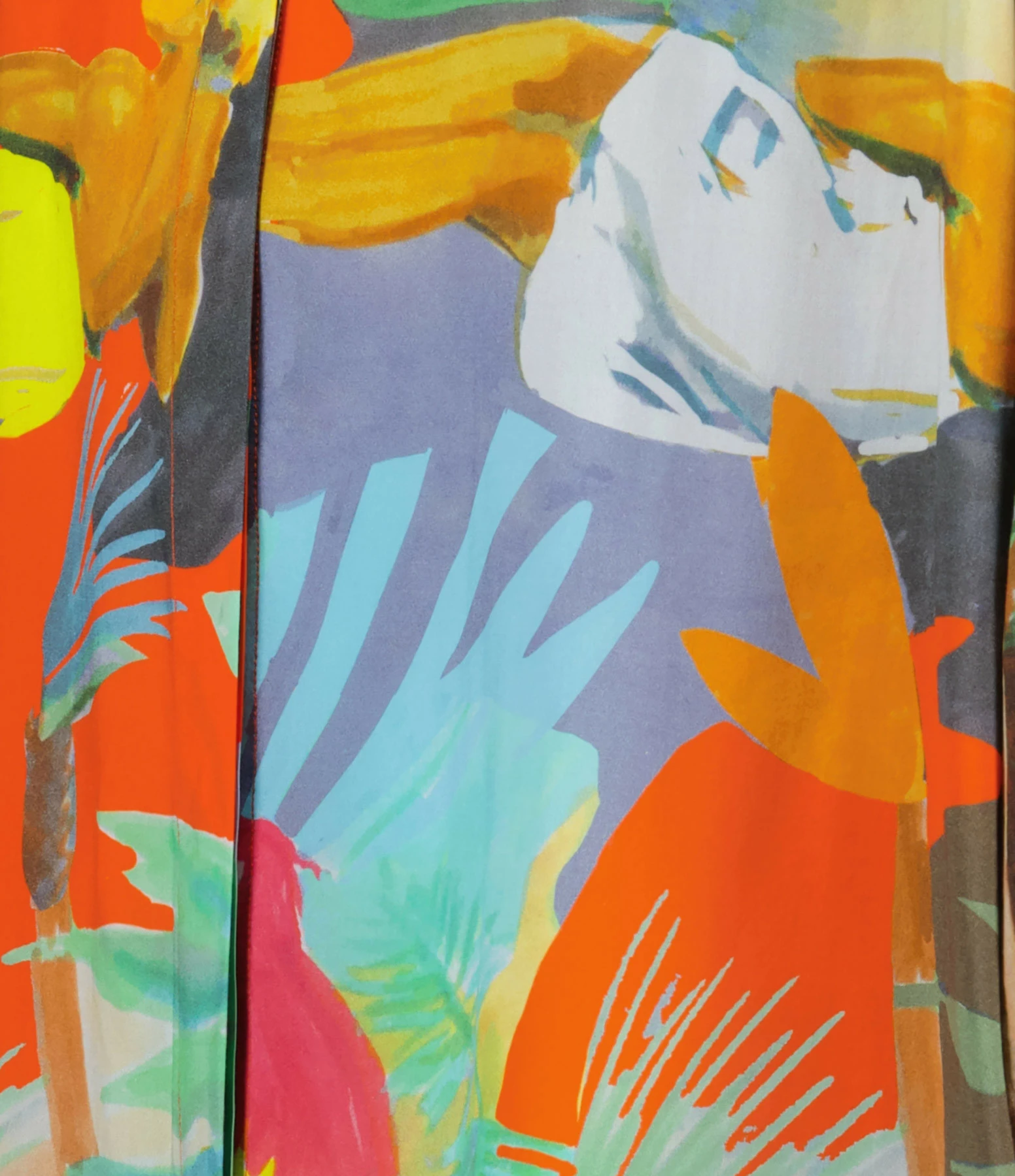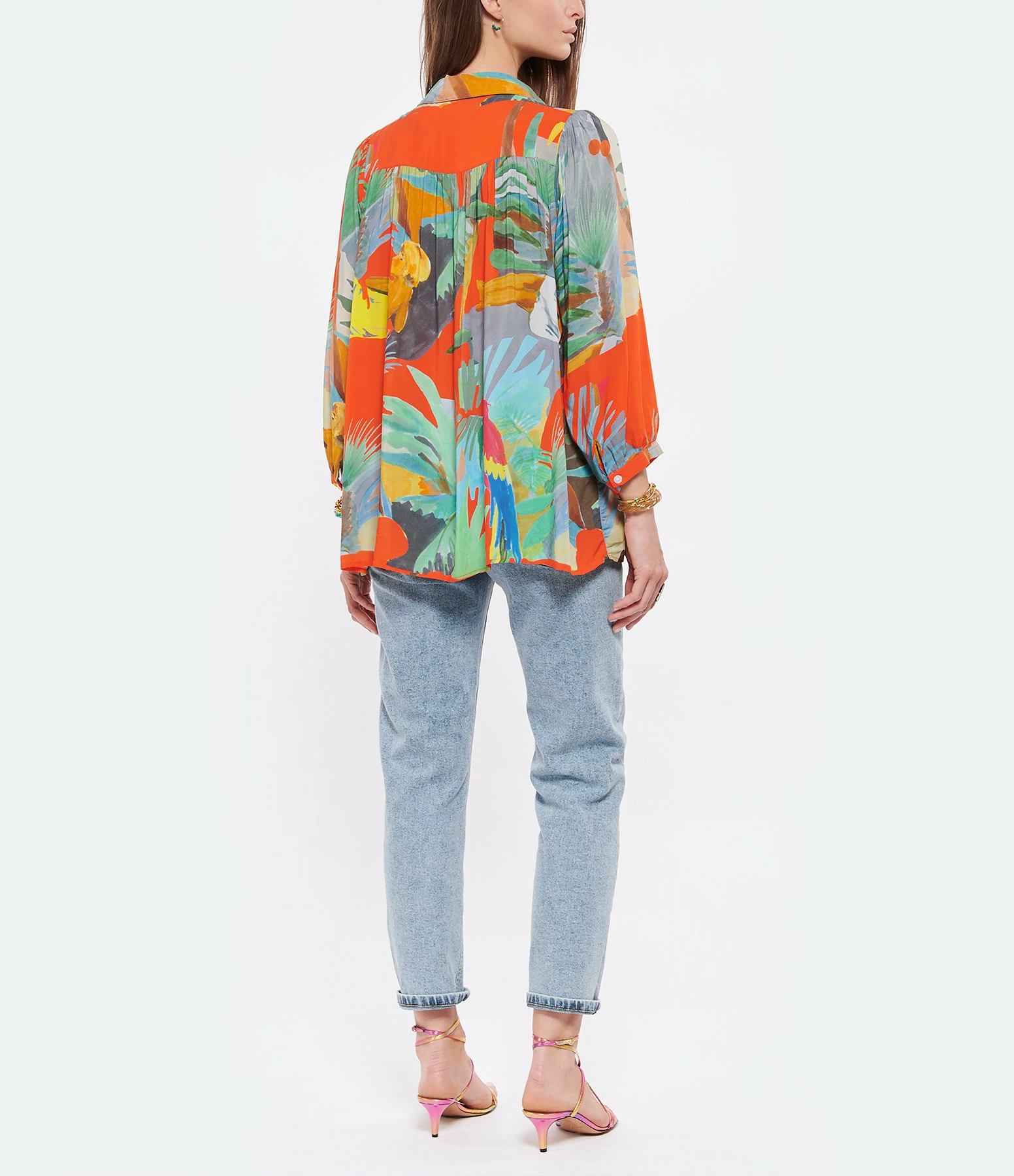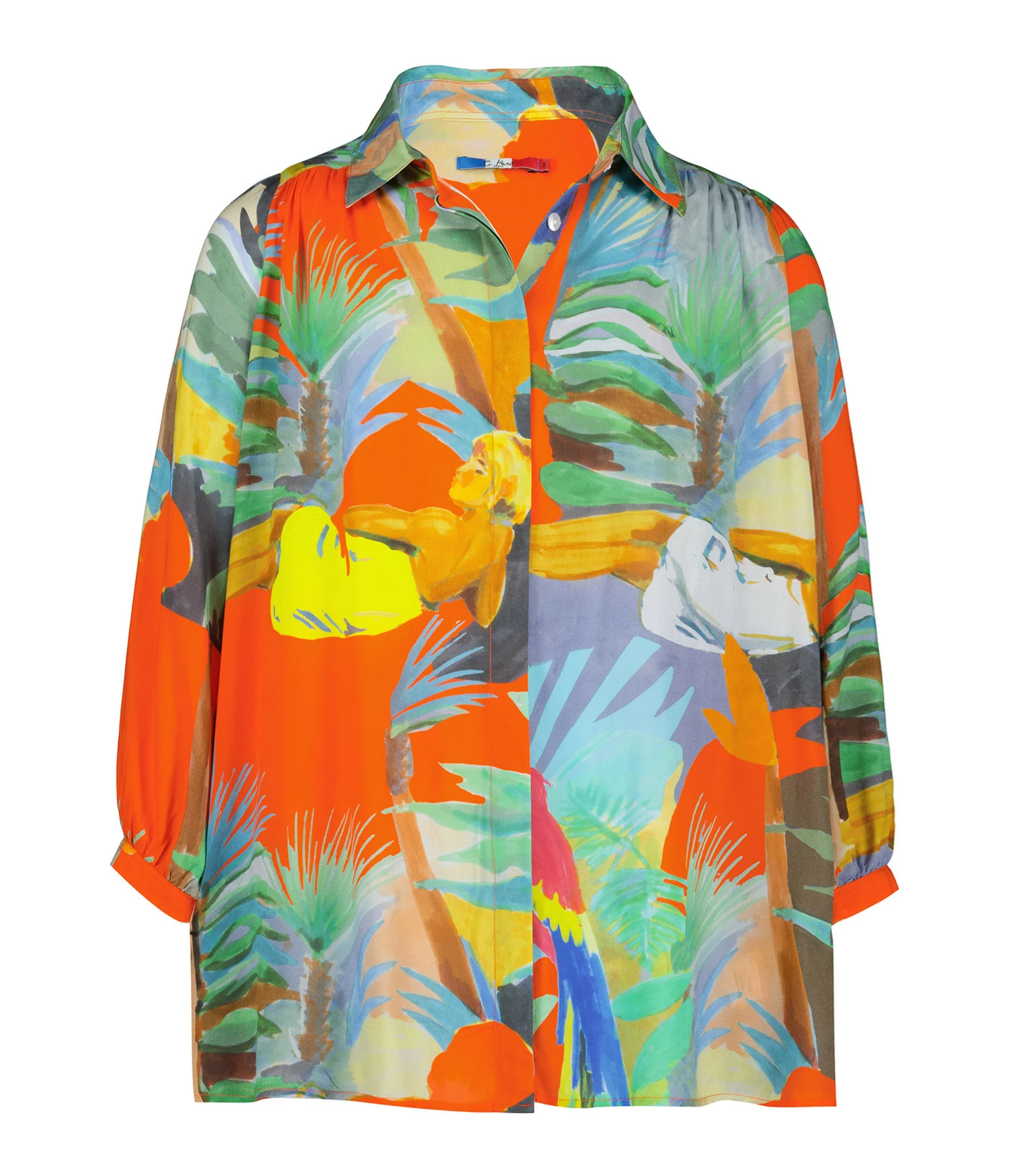 Blouse imprimée tropical effet aquarellé. Col chemisier. Manches 3/4 froncées. Fermeture boutonnée. Coupe ample. Base droite.