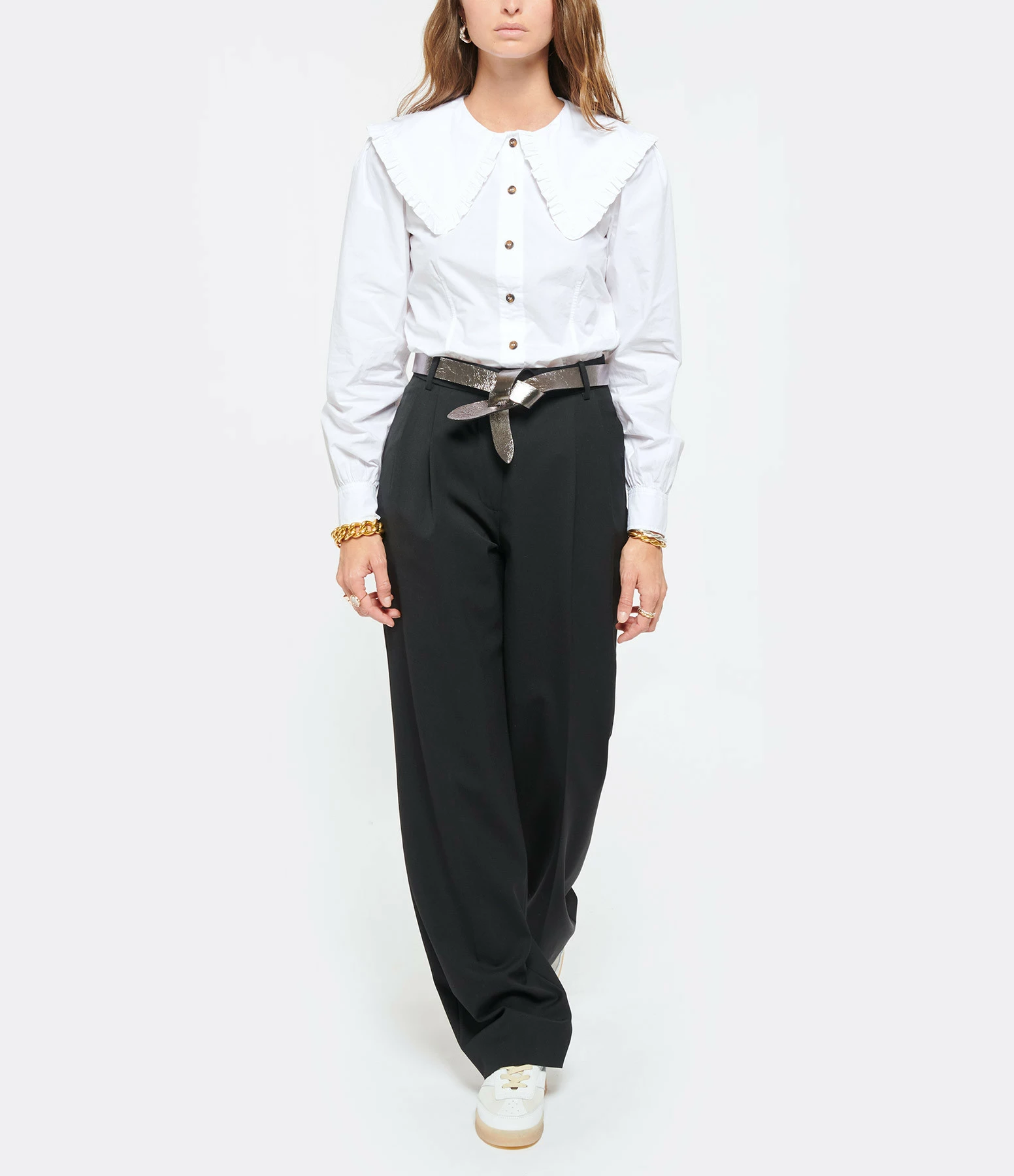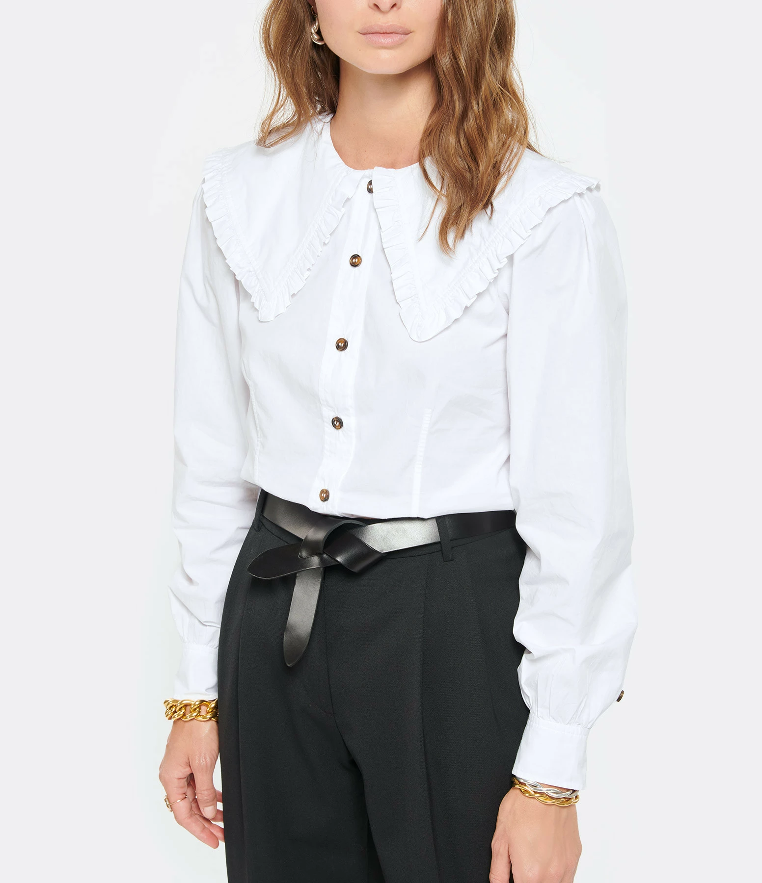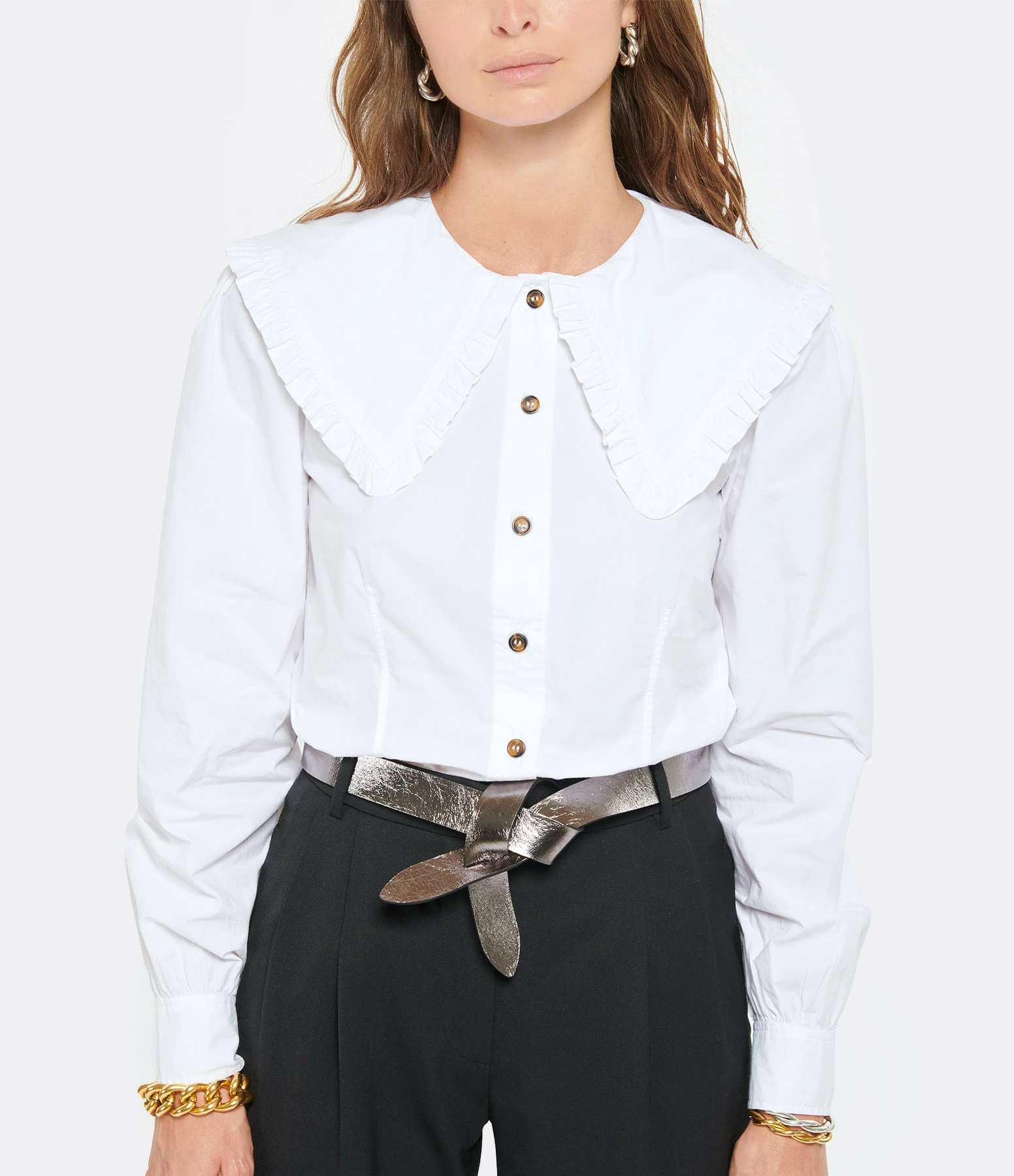 Chemise en coton biologique blanc. Col pelle à tarte volanté. Fentes latérales incurvées. Fermeture par boutons. Manches longues. Coupe droite. Base arrondie. Non doublée.