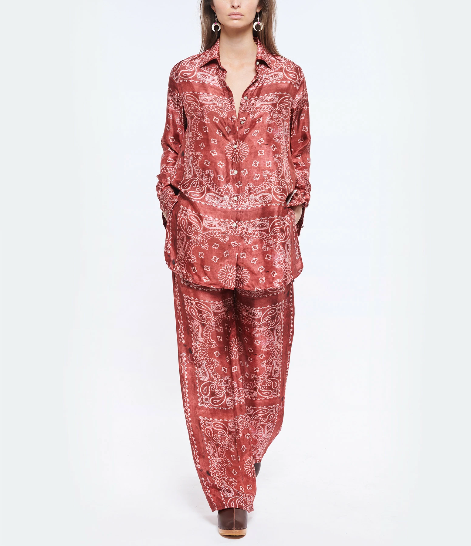Chemise longue à imprimé bandana rouge. Col chemise. Manches longues. Fermeture boutonnée. Coupe droite et fluide. Base droite avec fentes de 24 cm sur les côtés.