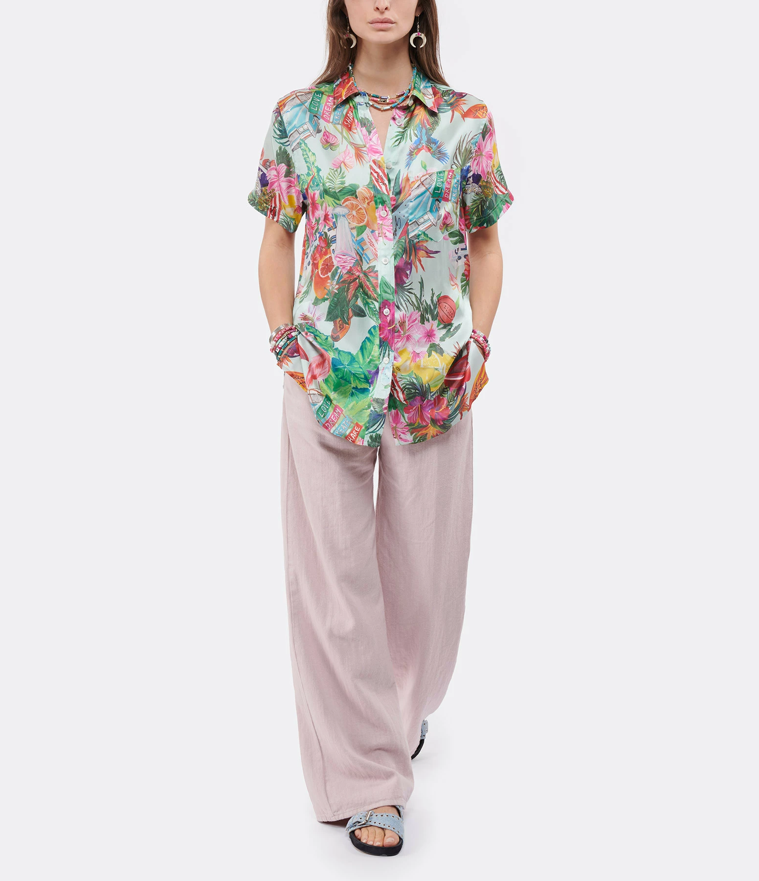 Chemise fluide et satiné à imprimé floral multicolore, pour femme. Fermeture par boutons. Col chemisier. Manches courtes. Base arrondie légèrement plus longue à l’arrière. Non doublée.