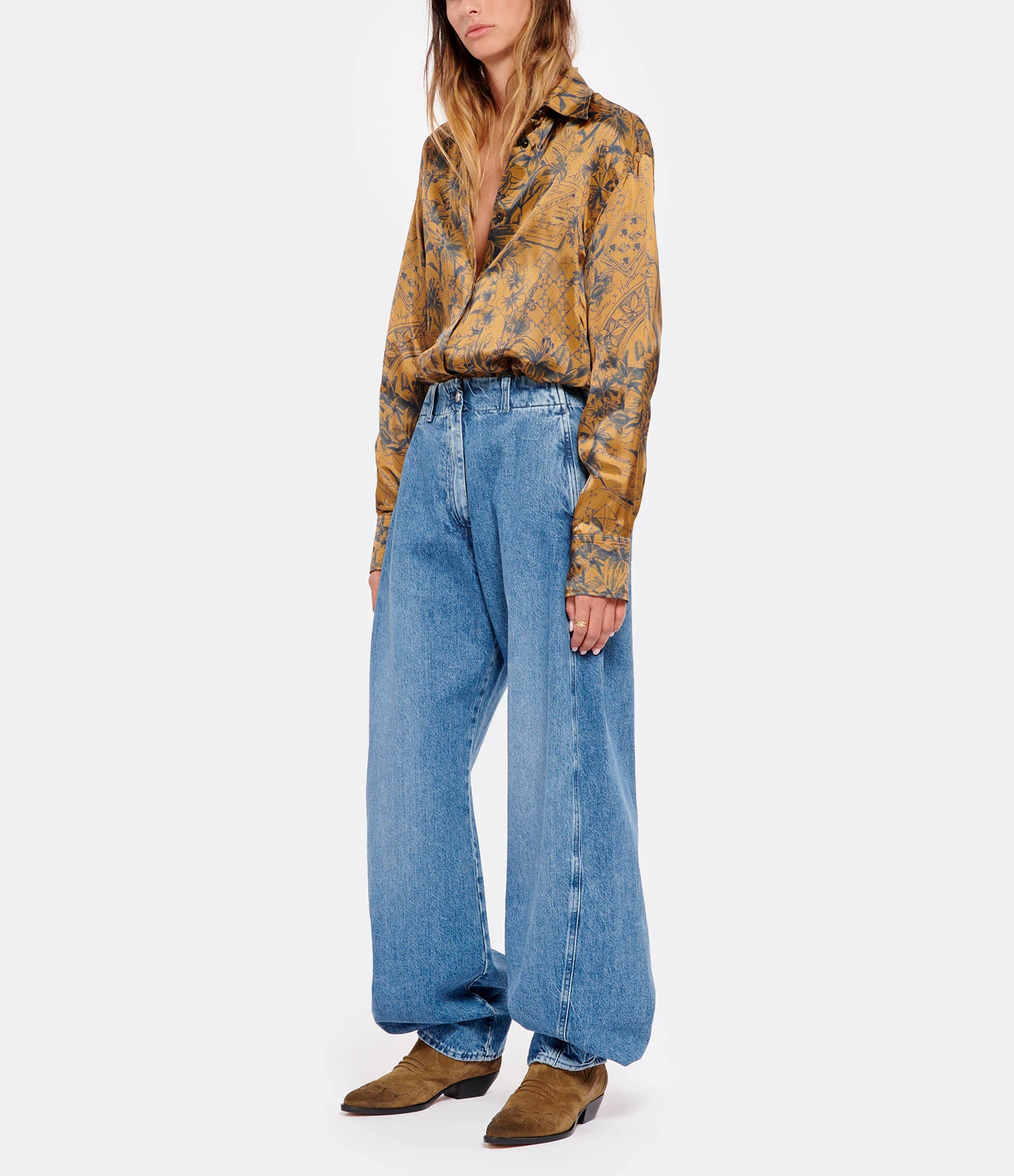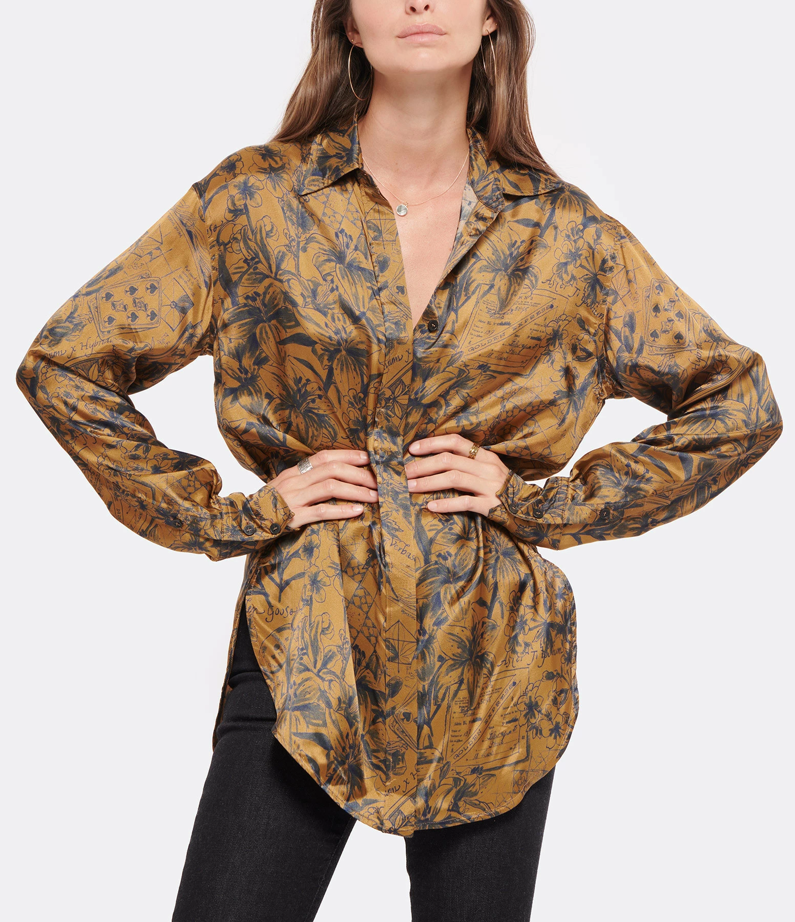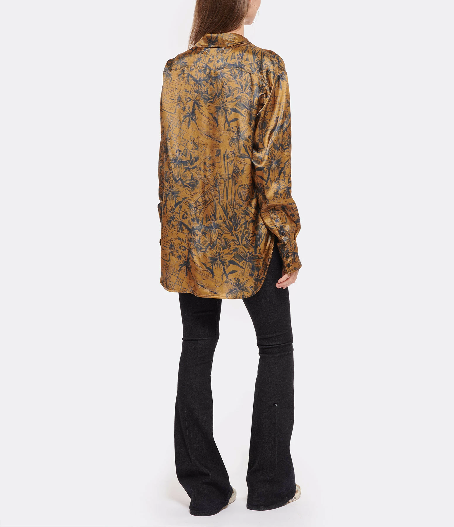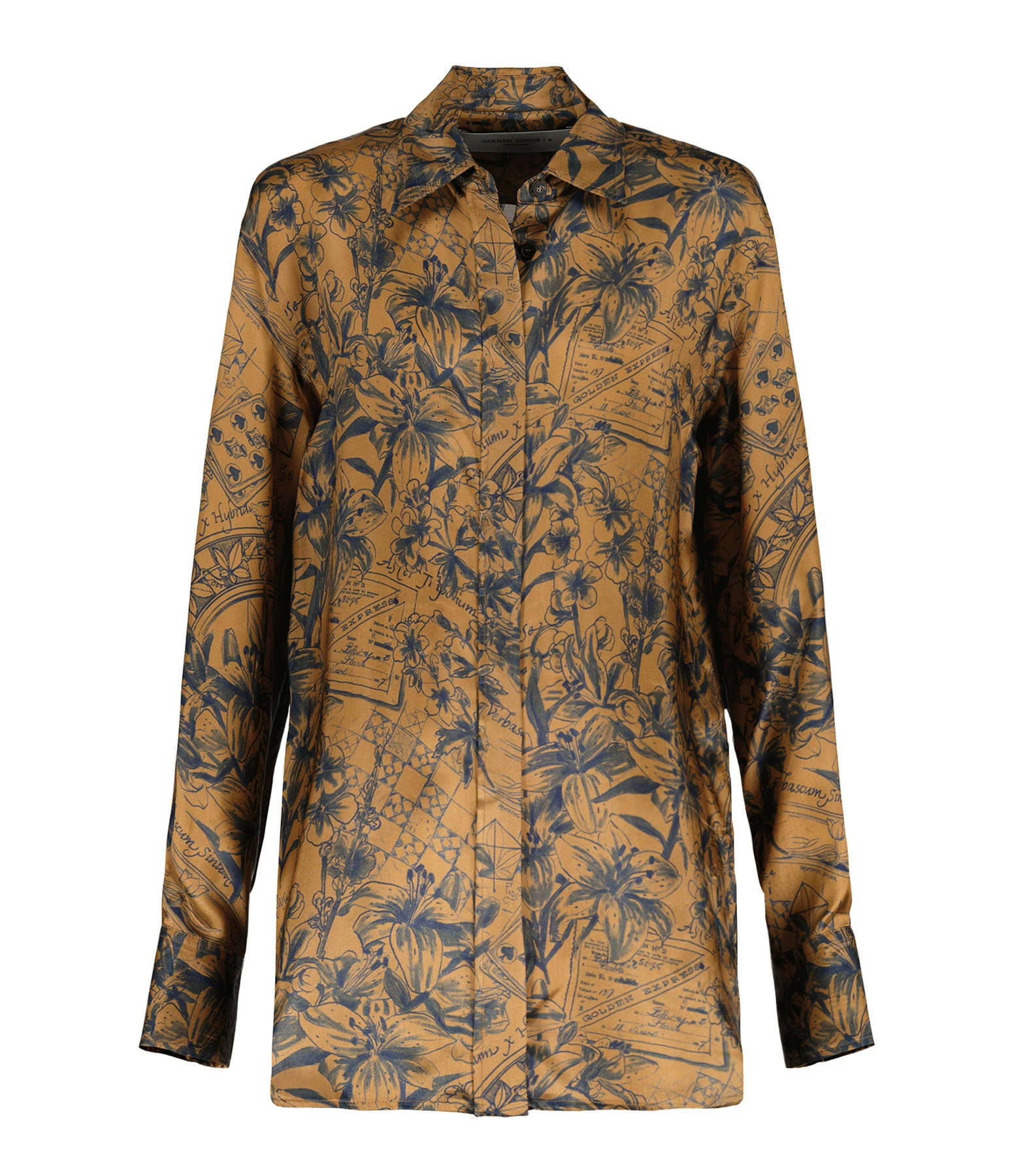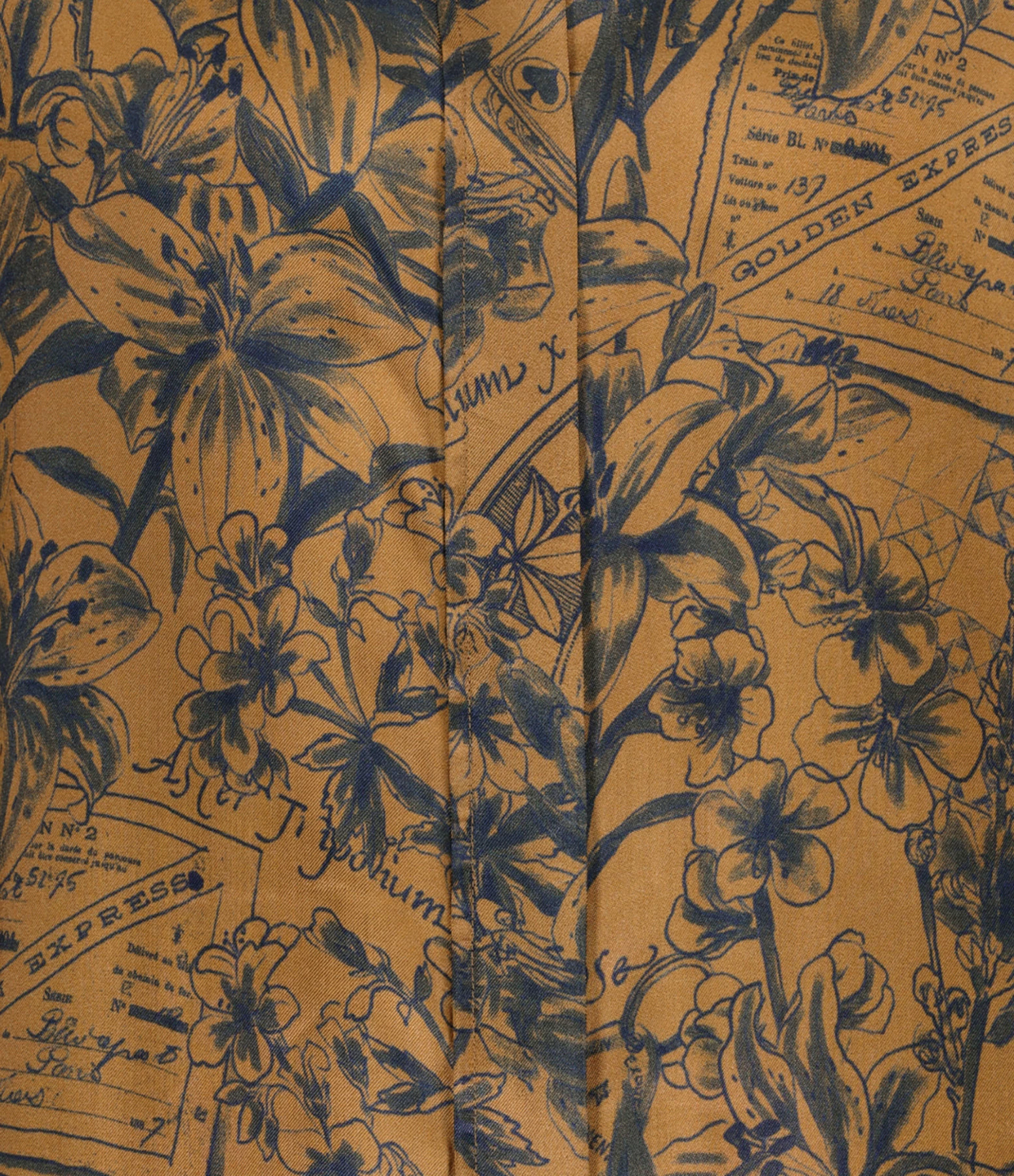 Chemise en tissu fluide marron doré imprimé de motifs inspirés des journaux intimes des voyageurs bleu encre. Col chemise. Manches longues avec fentes et poignets boutonnés. Fermeture boutonnée à patte de boutonnage cachée sur le devant. Double étoile en métal doré dans le dos. Fentes latérales. Coupe droite longue. Base arrondie. Non doublée.