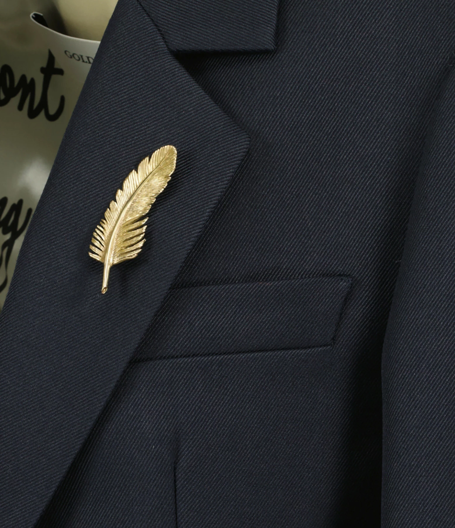 Veste blazer en laine mélangée bleue foncée. Col tailleur cranté. Manches longues avec fentes boutonnées. Pièce amovible blanche avec la lettre “G” brodée en rouge sur la manche gauche. Détail broche métallique en forme de plume dorée. Double logo “étoile” en métal doré dans le dos. Une fausse poche passepoilée poitrine et deux poches à rabat sur le devant. Fermeture boutonnée simple sur le devant. Coupe cintrée. Base arrondie. Doublée dans un tissu beige avec des inscriptions imprimées.