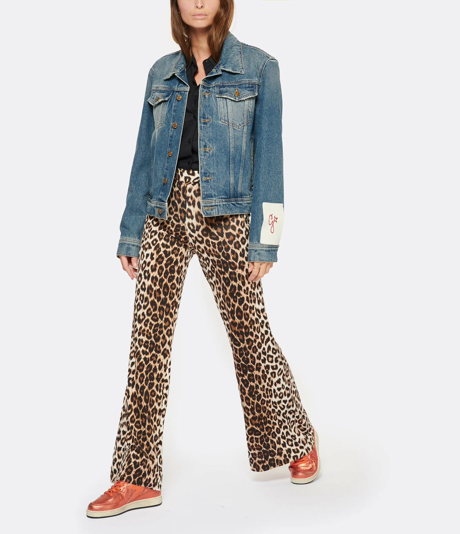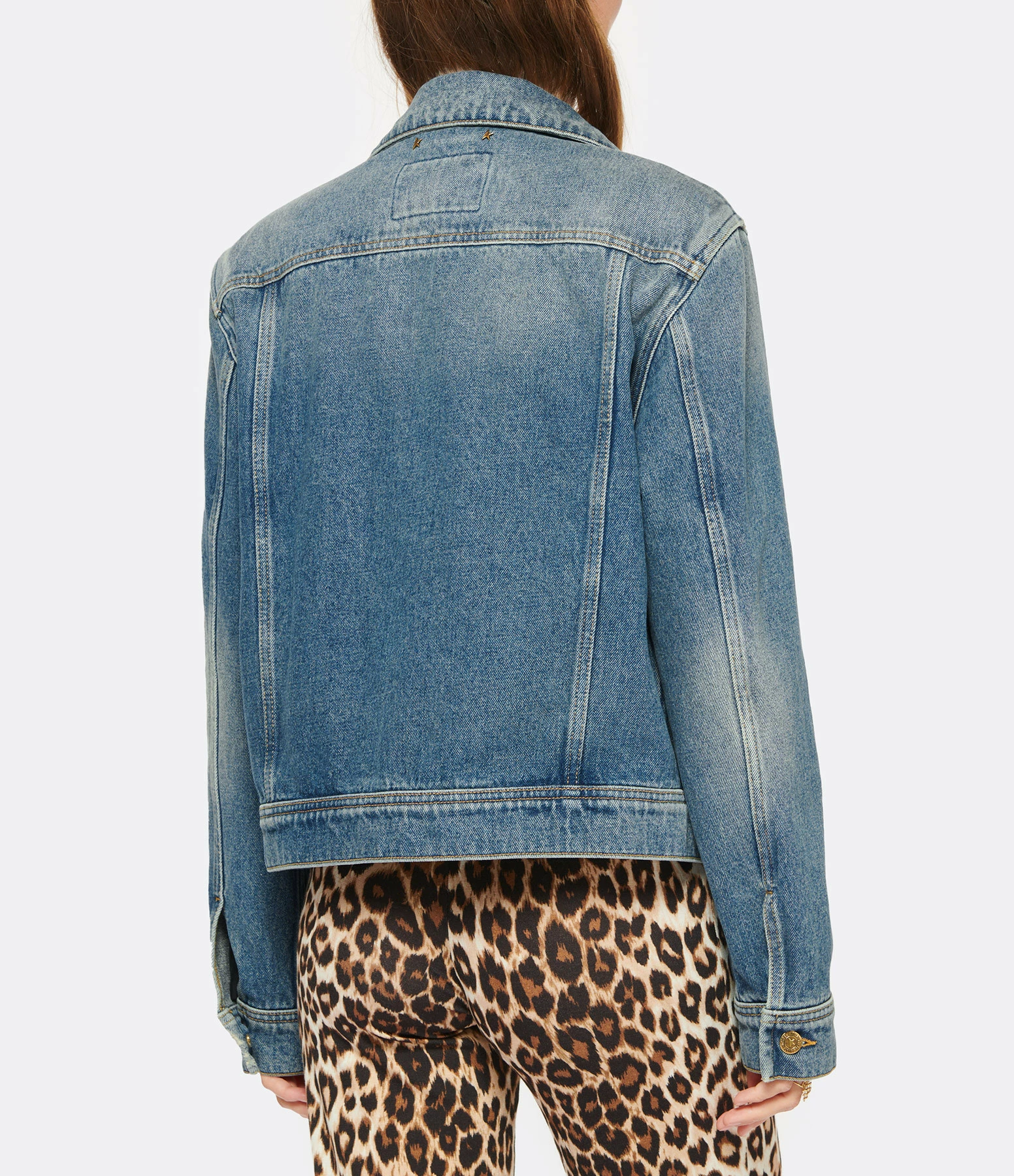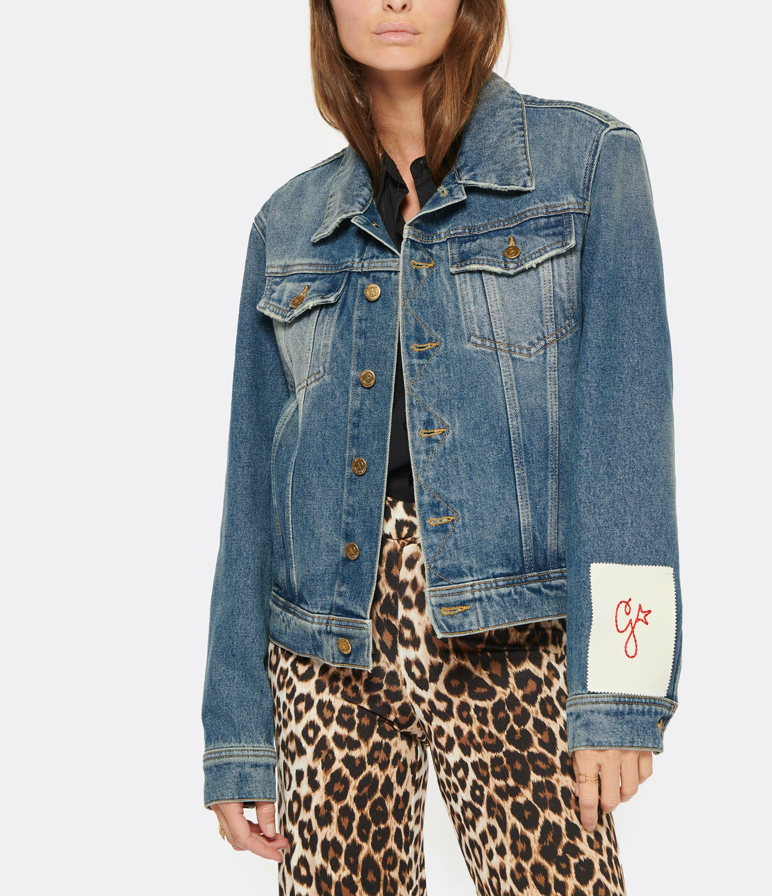 Veste en denim de coton bleu délavé. Col chemisier. Manches longues avec fentes et poignets boutonnés. Un patch amovible blanc avec lettre G brodée en rouge sur la manche gauche. Fermeture boutonnée sur le devant. Boutons métalliques estampillés Golden Goose. Deux poches à rabat boutonné et deux poches passepoilées sur le devant. Double étoile métallique dorée dans le dos. Coupe droite. Base droite.