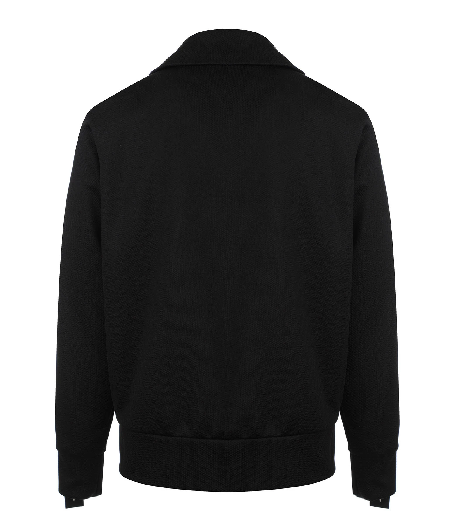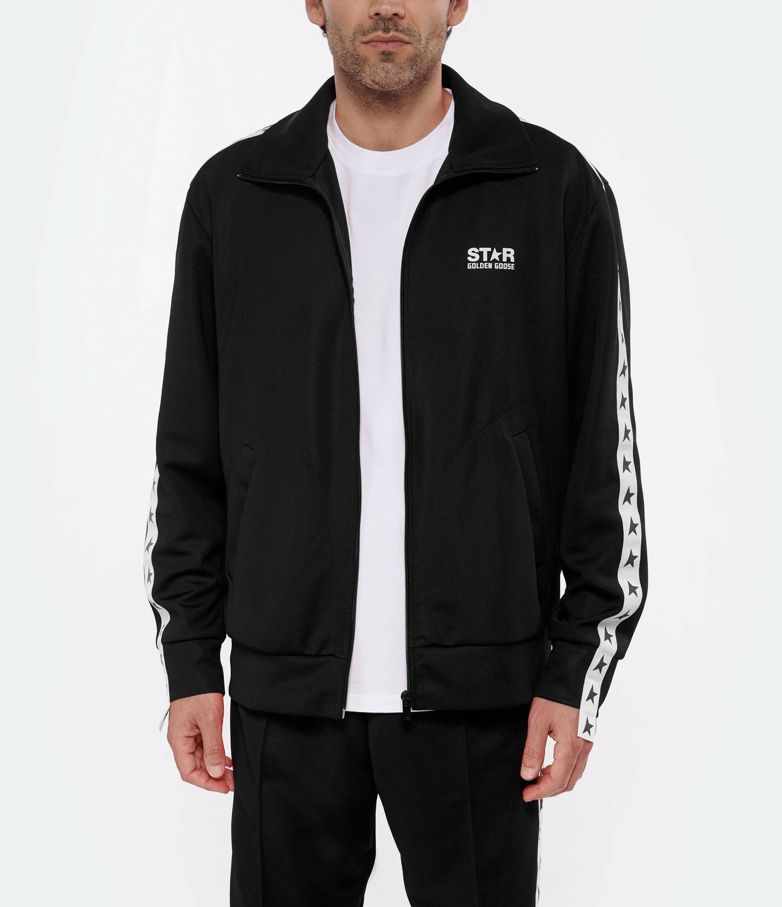 Veste sportwear noire pour homme. Bandes noires avec étoiles blanches sur les manches. Inscription poitrine “STAR GOLDEN GOOSE”. Bords côtés aux poignets. Deux poches à l’avant. Fermeture par zip. Base droite et élastiquée.