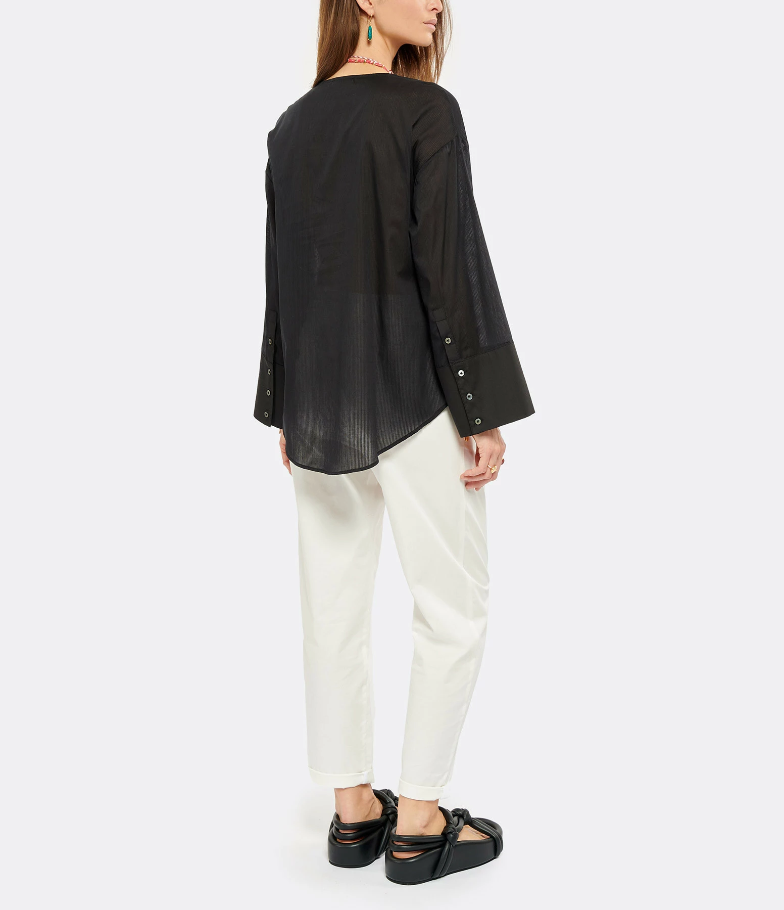 Blouse en coton à fines rayures noires transparentes. Manches longues ample, tissus opaque aux poignets. Boutons aux poignets. Col en coton opaque plongeant en V. Coupe droite. Base arrondie. Non doublé.