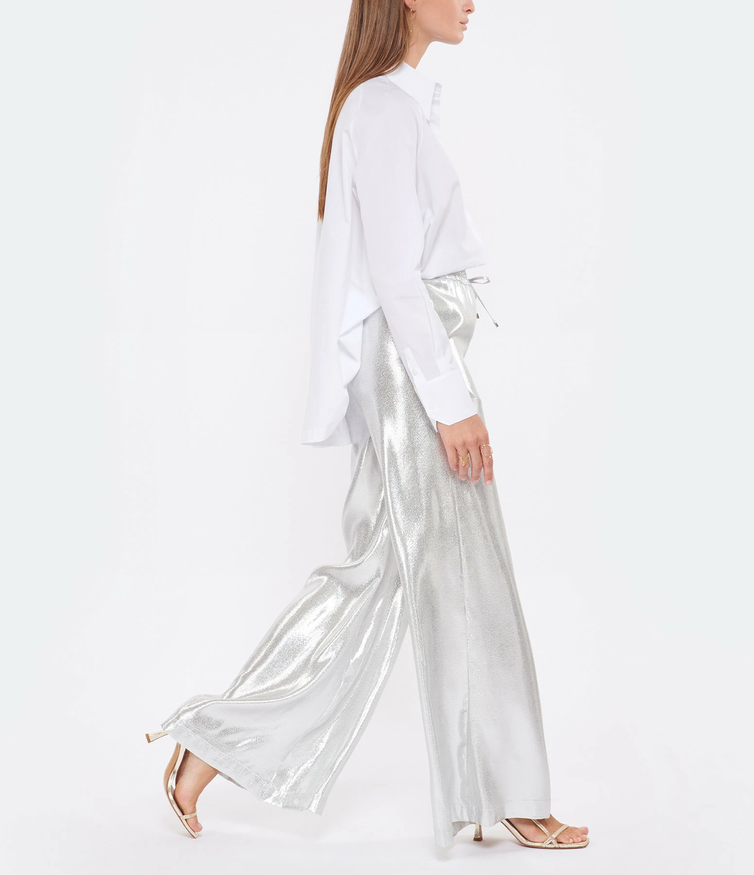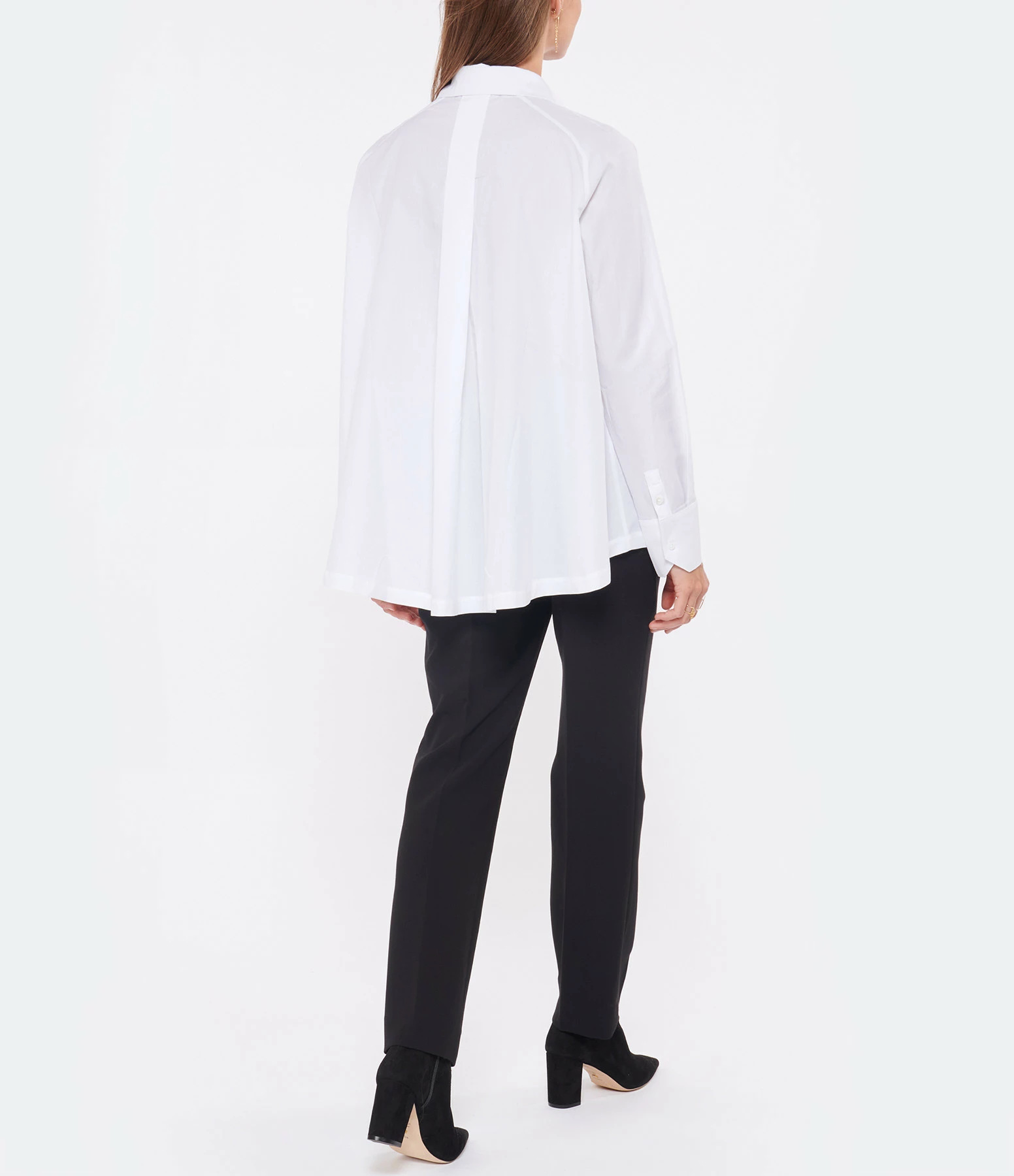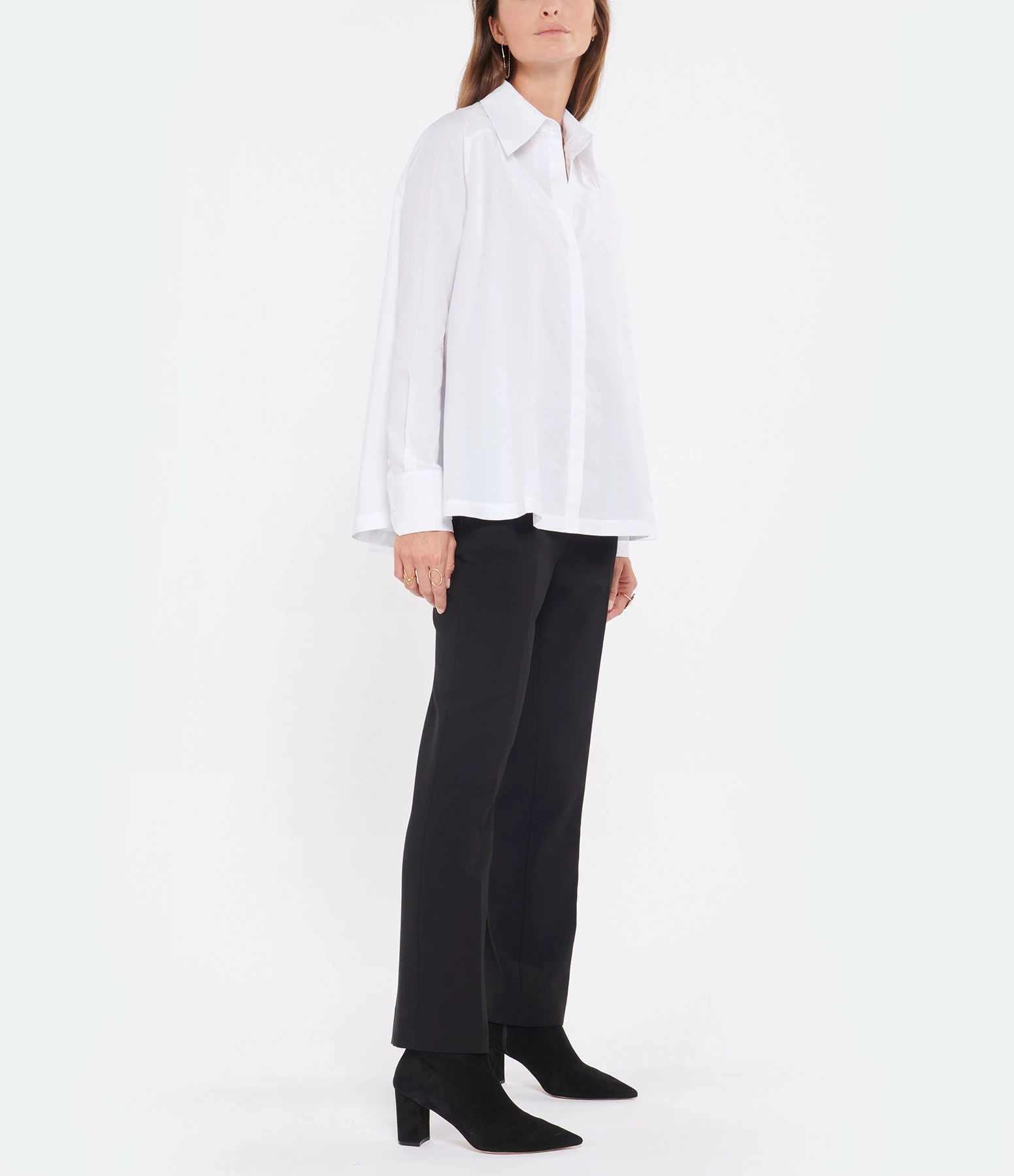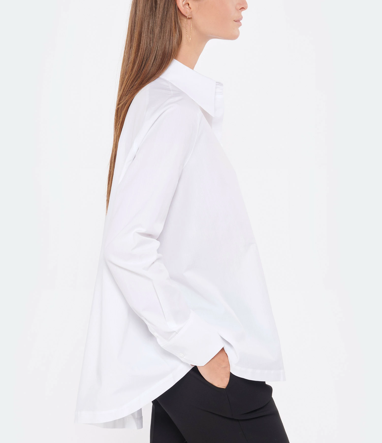 Chemise blanche en coton. Col chemise. Manches longues. Fermeture par boutons. Coupe ample. Base arrondie, plus longue à l’arrière.