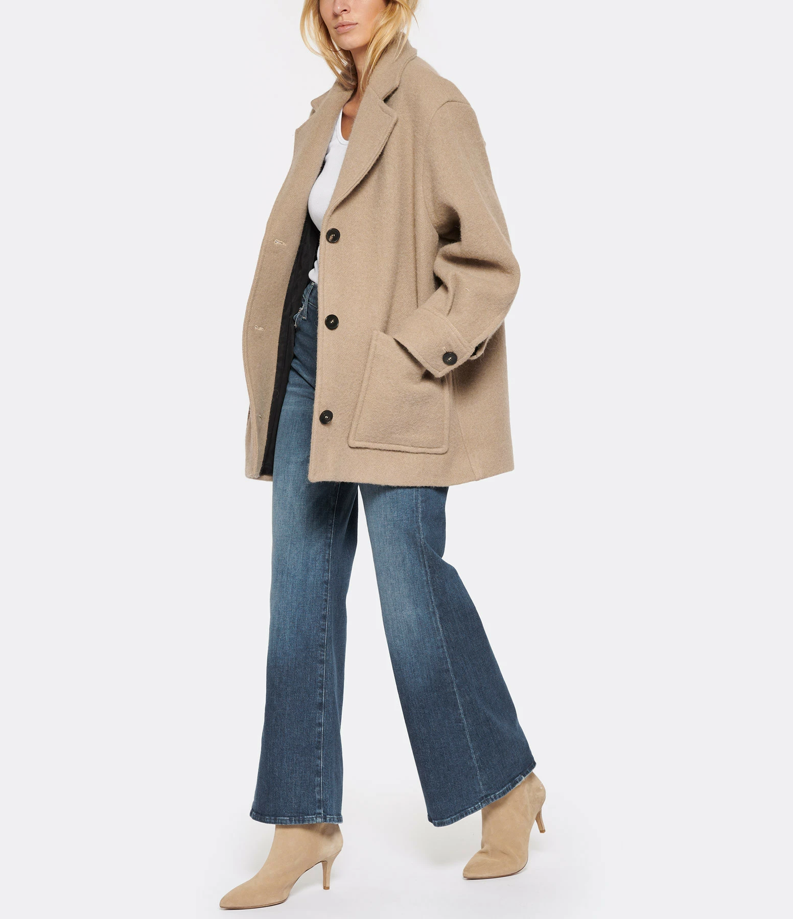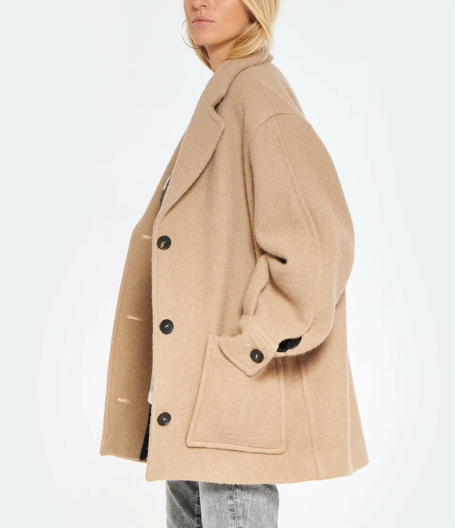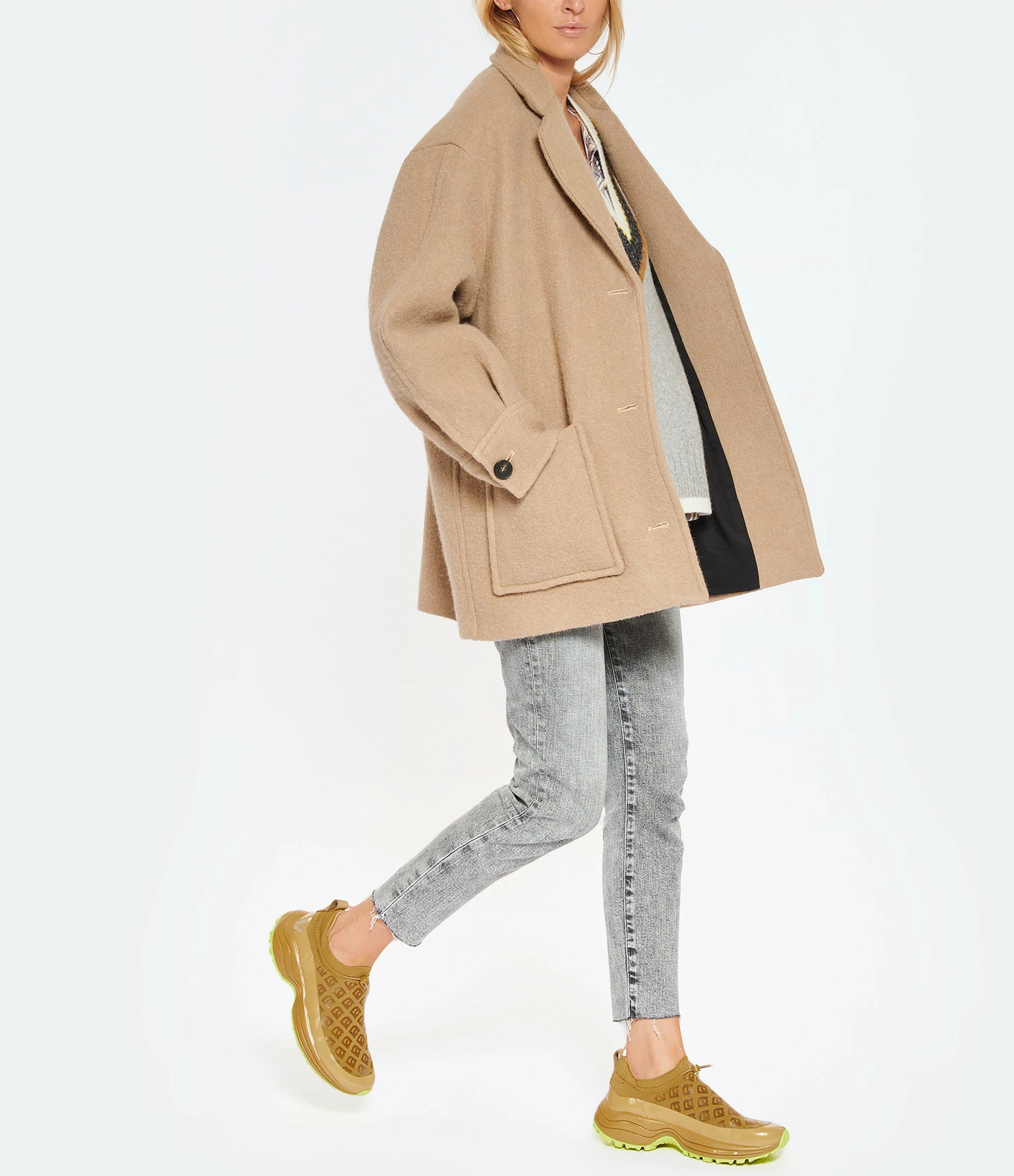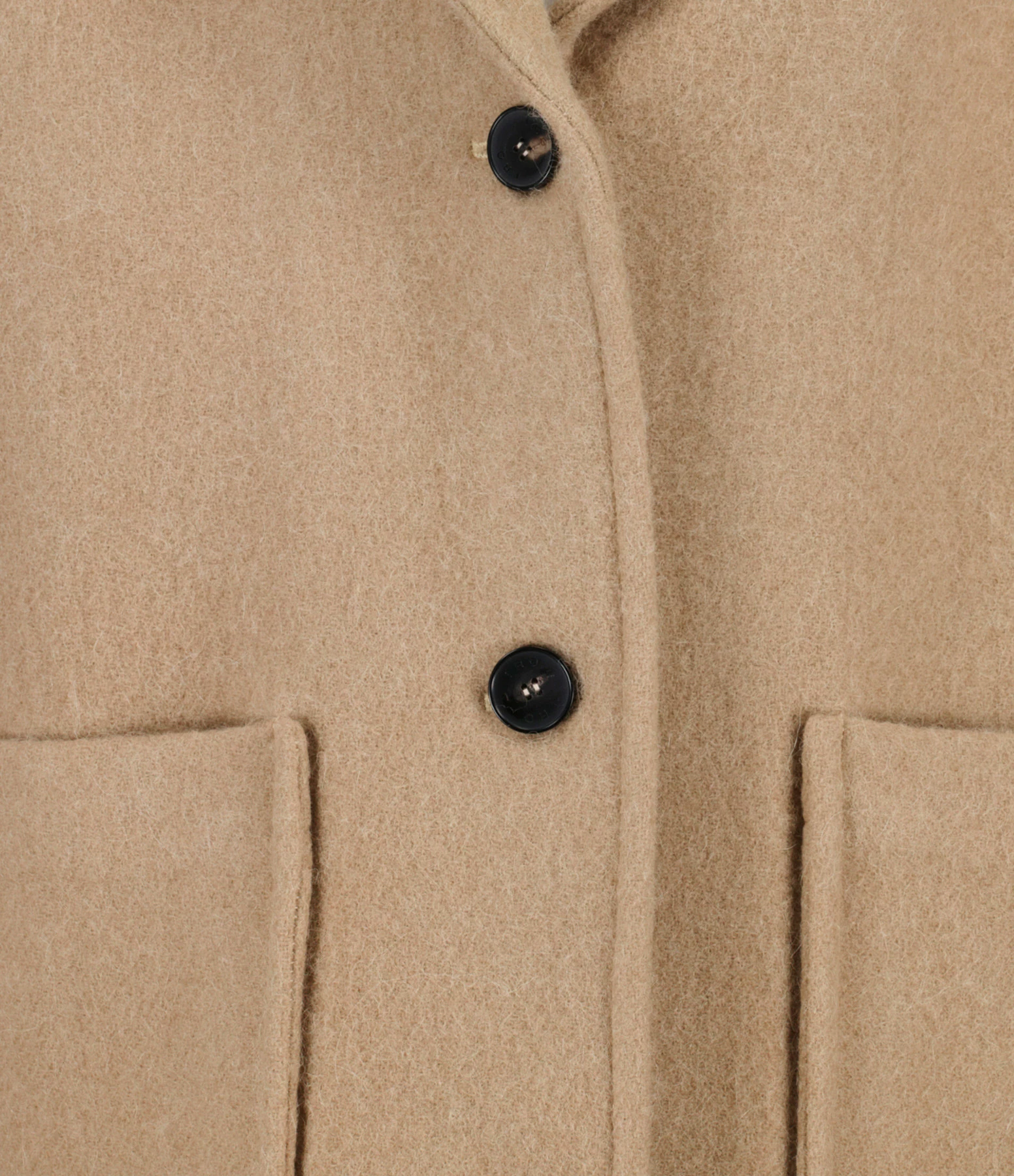 Manteau court en laine et alpaga taupe. Col tailleur cranté. Manches longues avec fentes et poignets boutonnés. Fermeture boutonnée simple sur le devant. Boutons noirs effet corne. Deux poches plaquées sur le devant. Coupe ample. Base droite. Doublé.