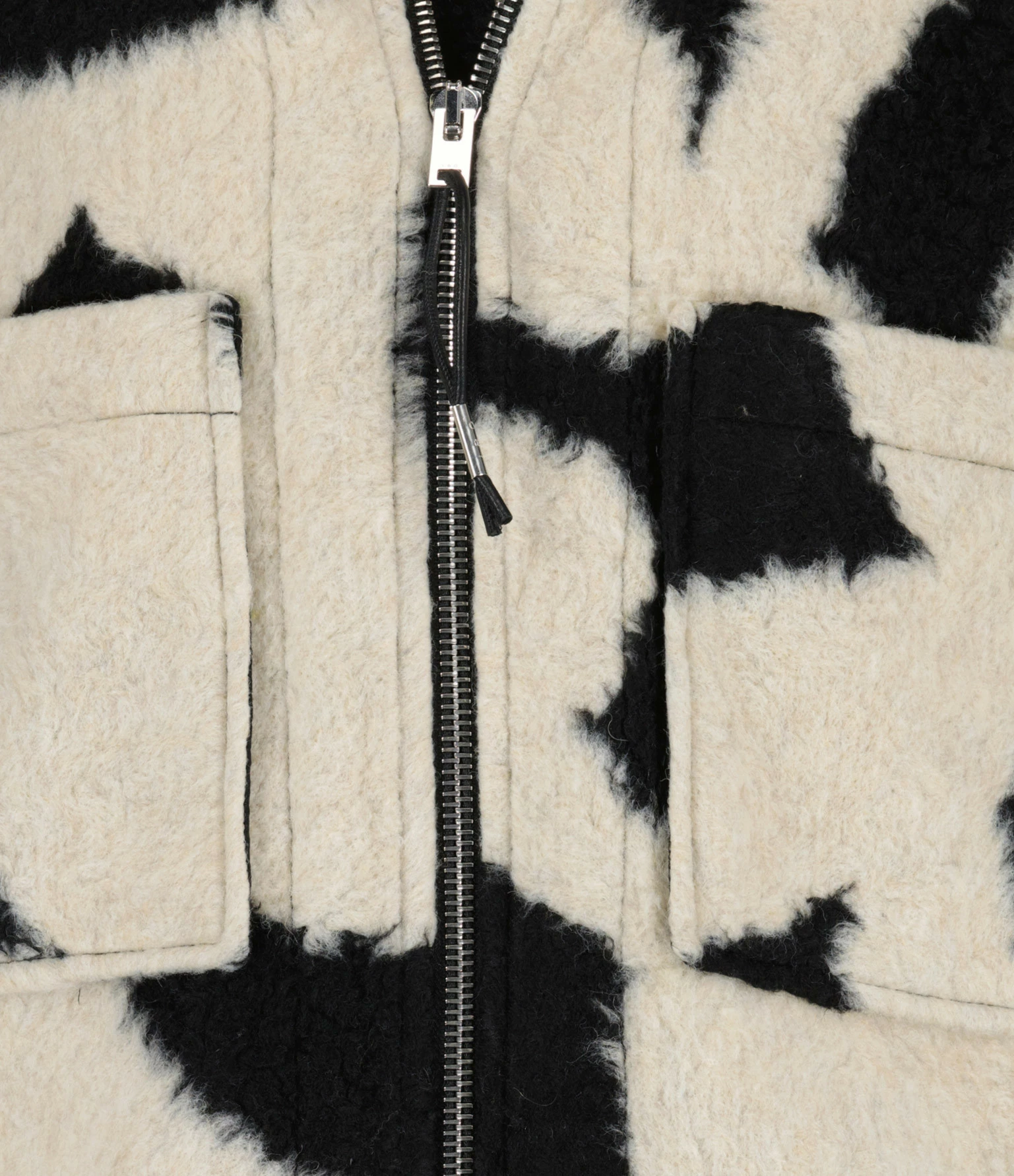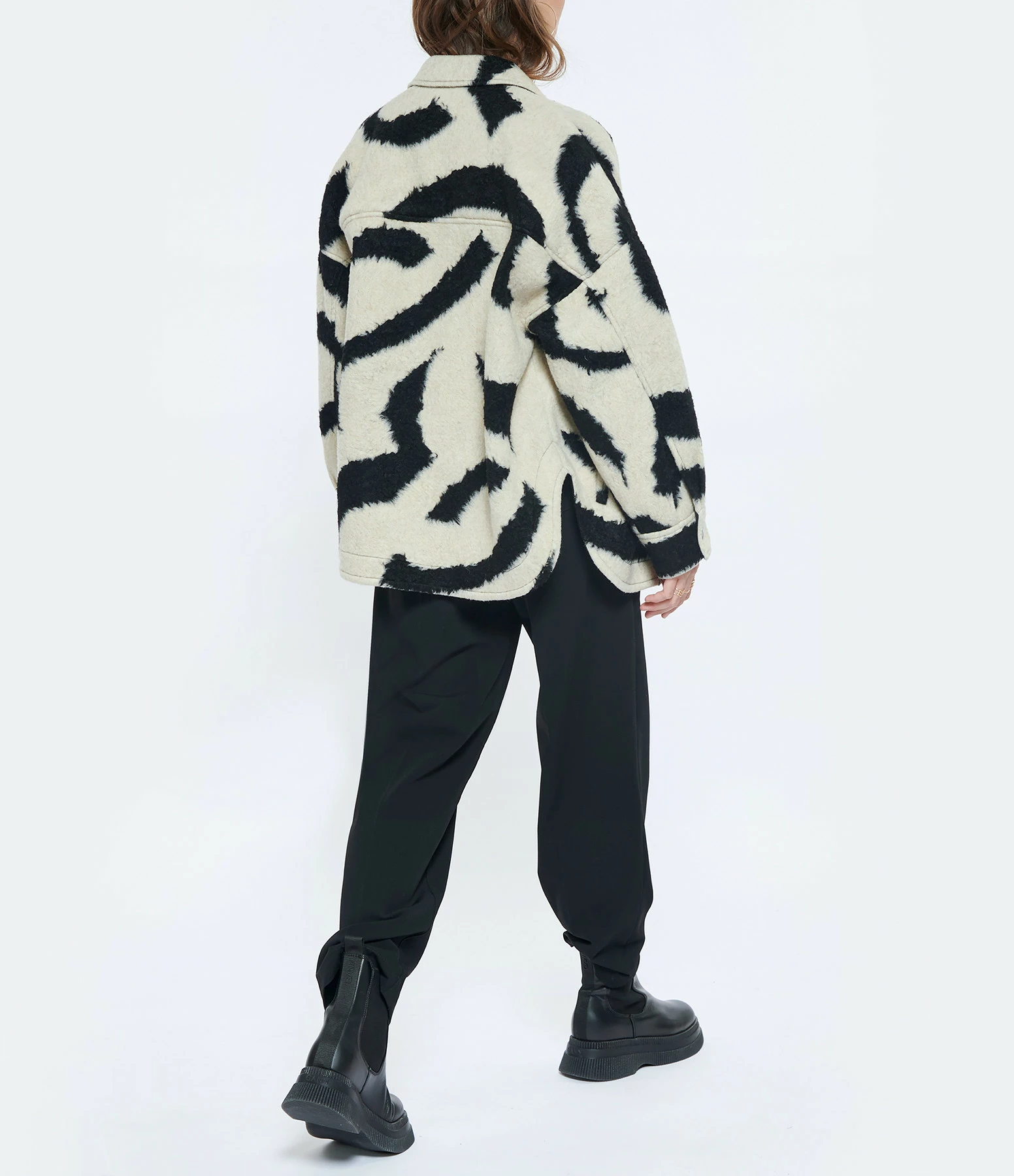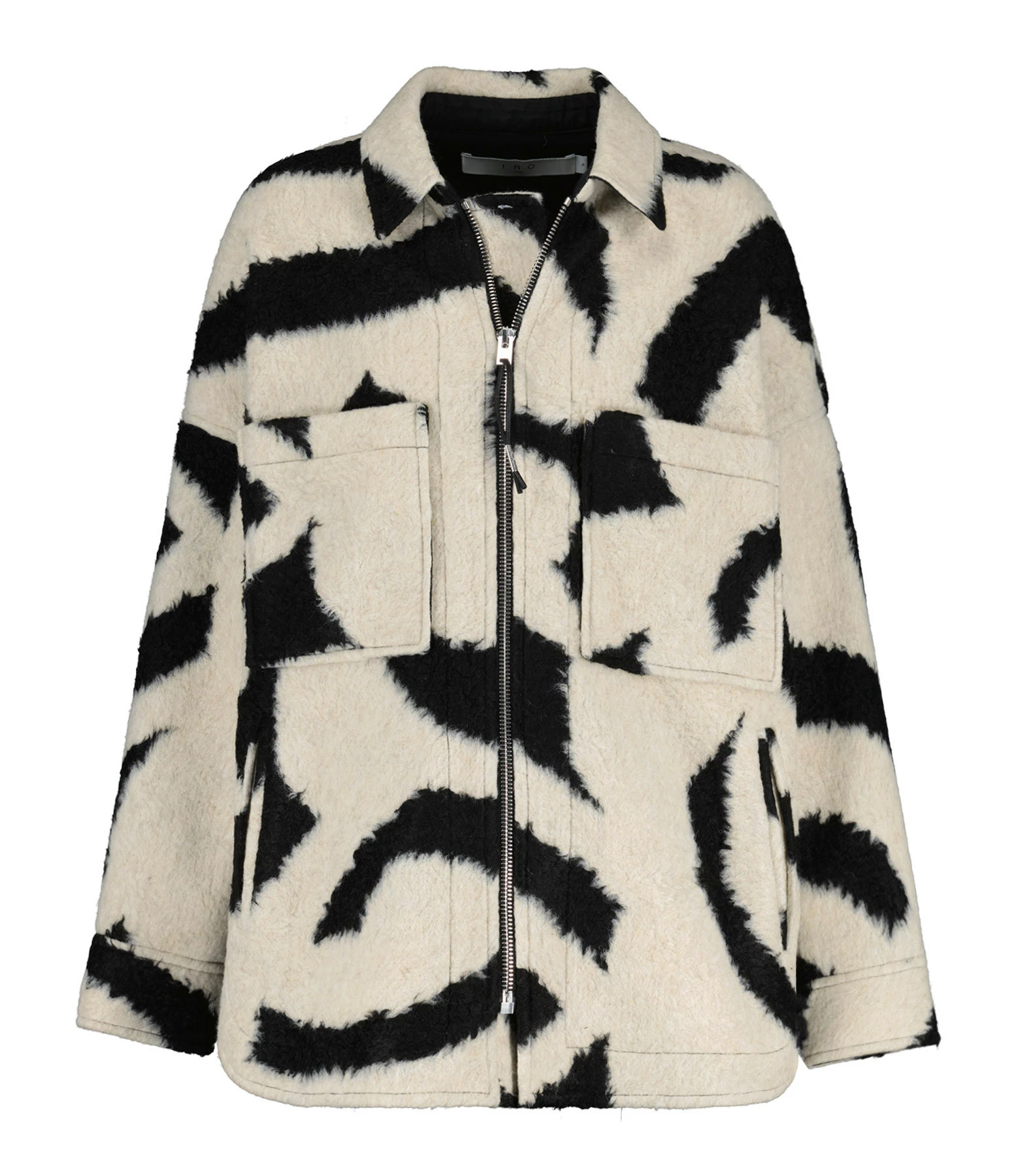 Veste surchemise épaisse en laine bouillie mélangée beige et noir. Manches longues. Deux poches plaquées sur la poitrine et deux poches passepoilées sur les côtés. Fermeture par zip. Base arrondie. Non doublée.