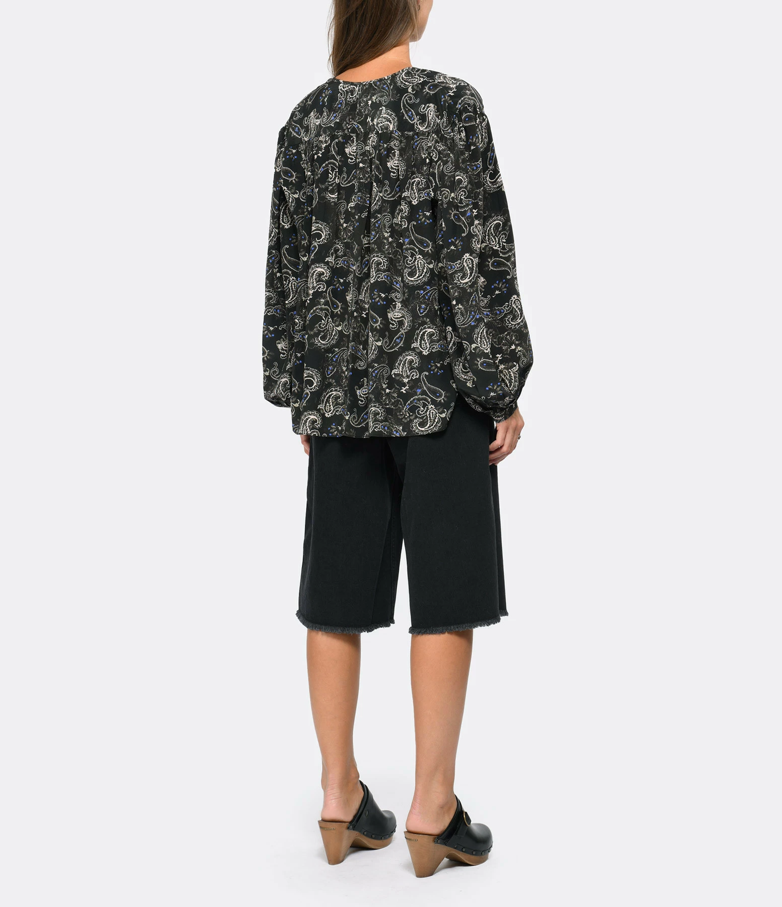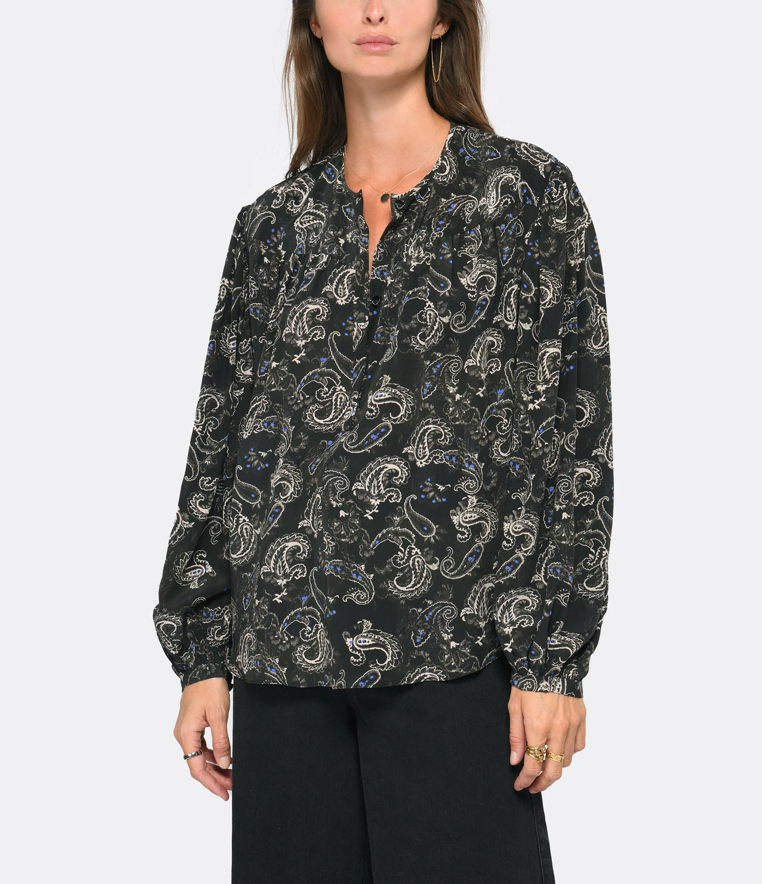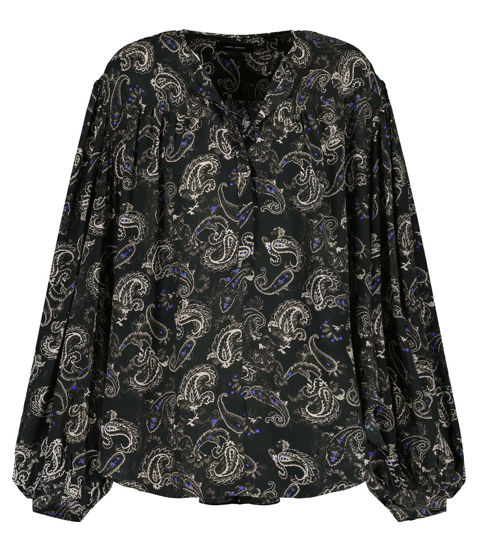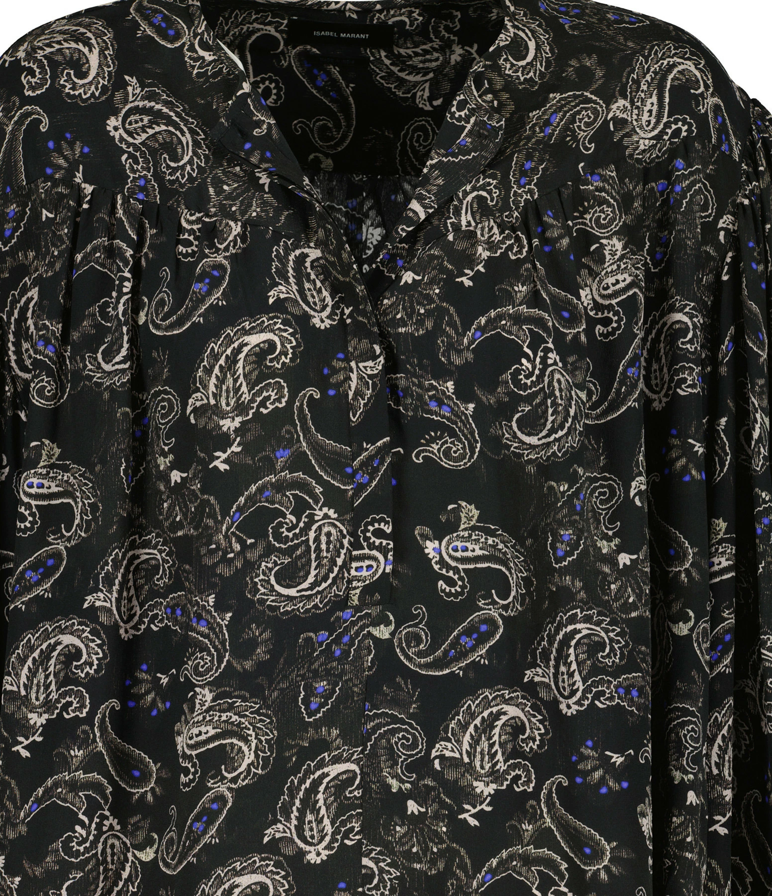 Blouse en soie imprimée dans des motifs floraux dans des tons noirs avec des touches de bleu. Encolure arrondie avec fente boutonnée dans une patte cachée. Boutons noirs gravés du logo en blanc. Manches longues bouffantes avec fentes et bordures boutonnées. Plastron et dos froncés. Deux fentes latérales. Coupe droite ample. Longueur plus longue dans le dos. Base arrondie.