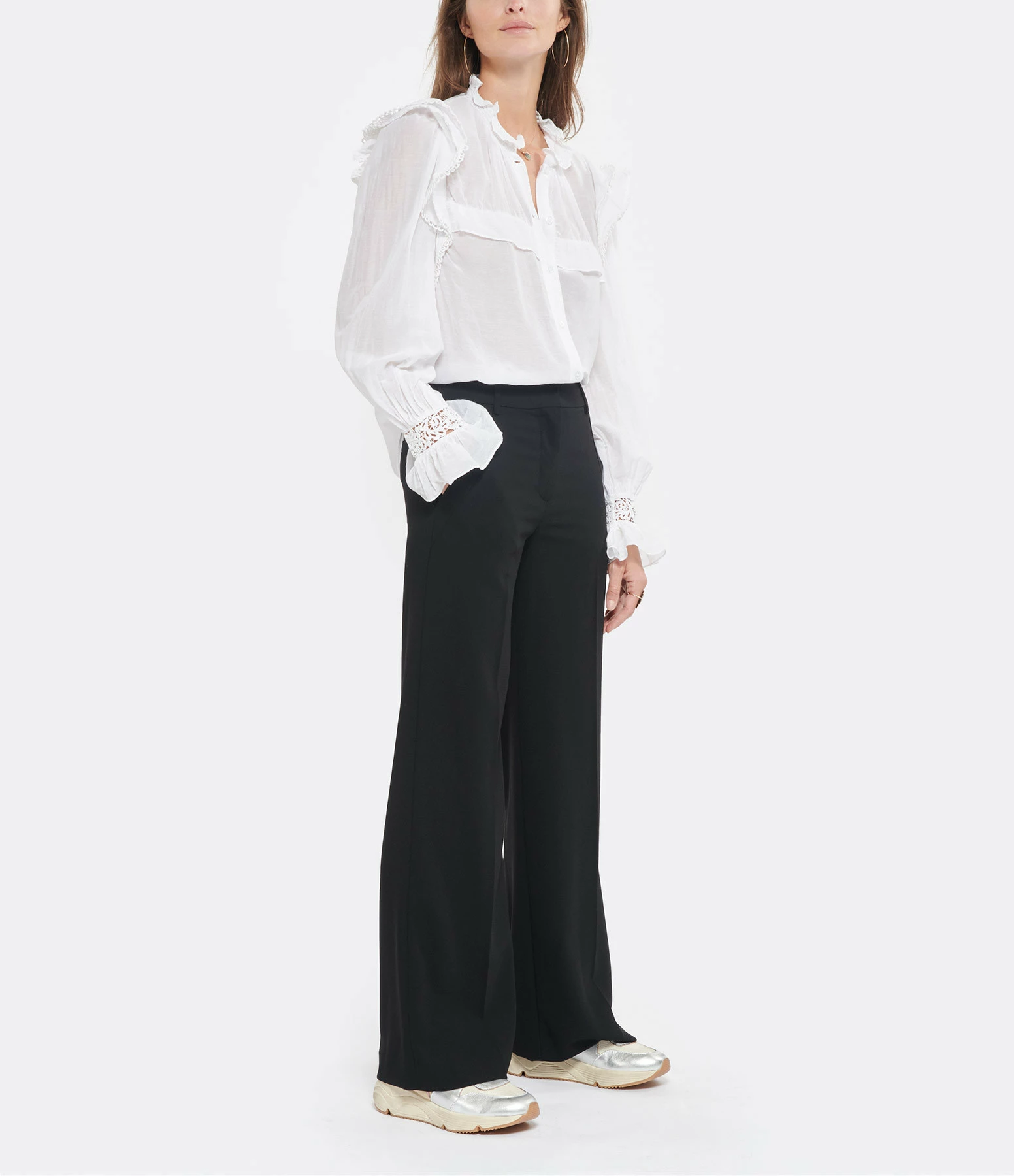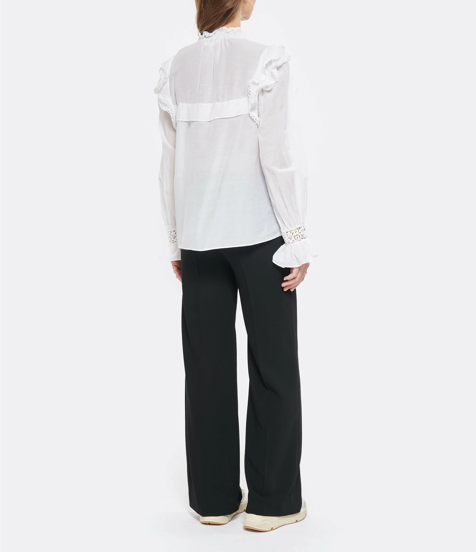 Blouse en coton blanc ornée de volants. Col officier volanté et froncé. Manches longues avec détails de broderies au niveau des poignets. Fermeture boutonnée sur le devant. Boutons blancs. Matière légèrement transparente. Coupe droite. Base droite. Non doublé.