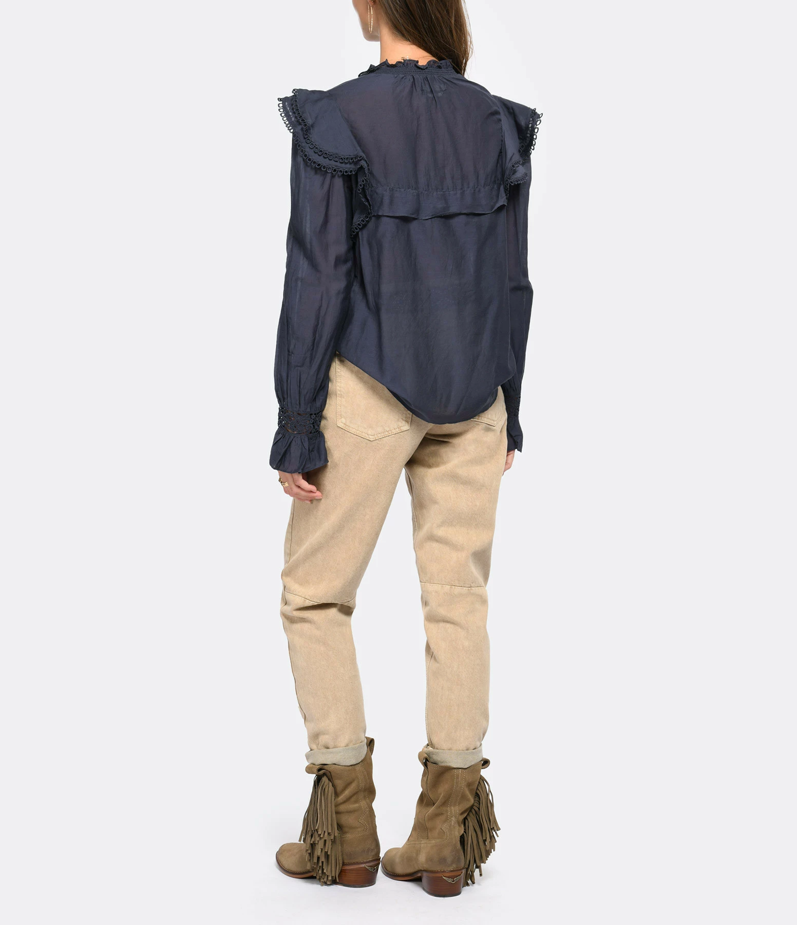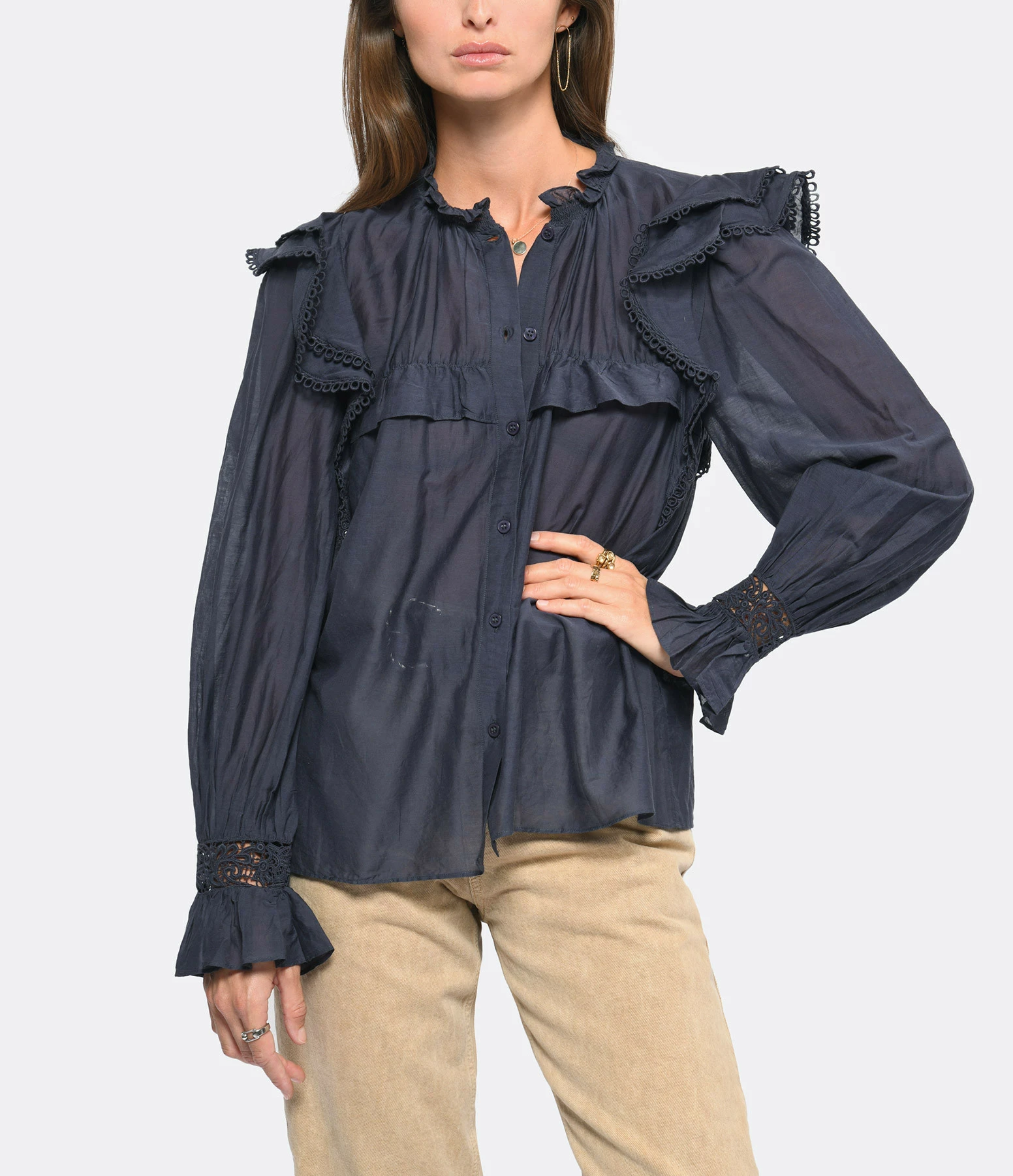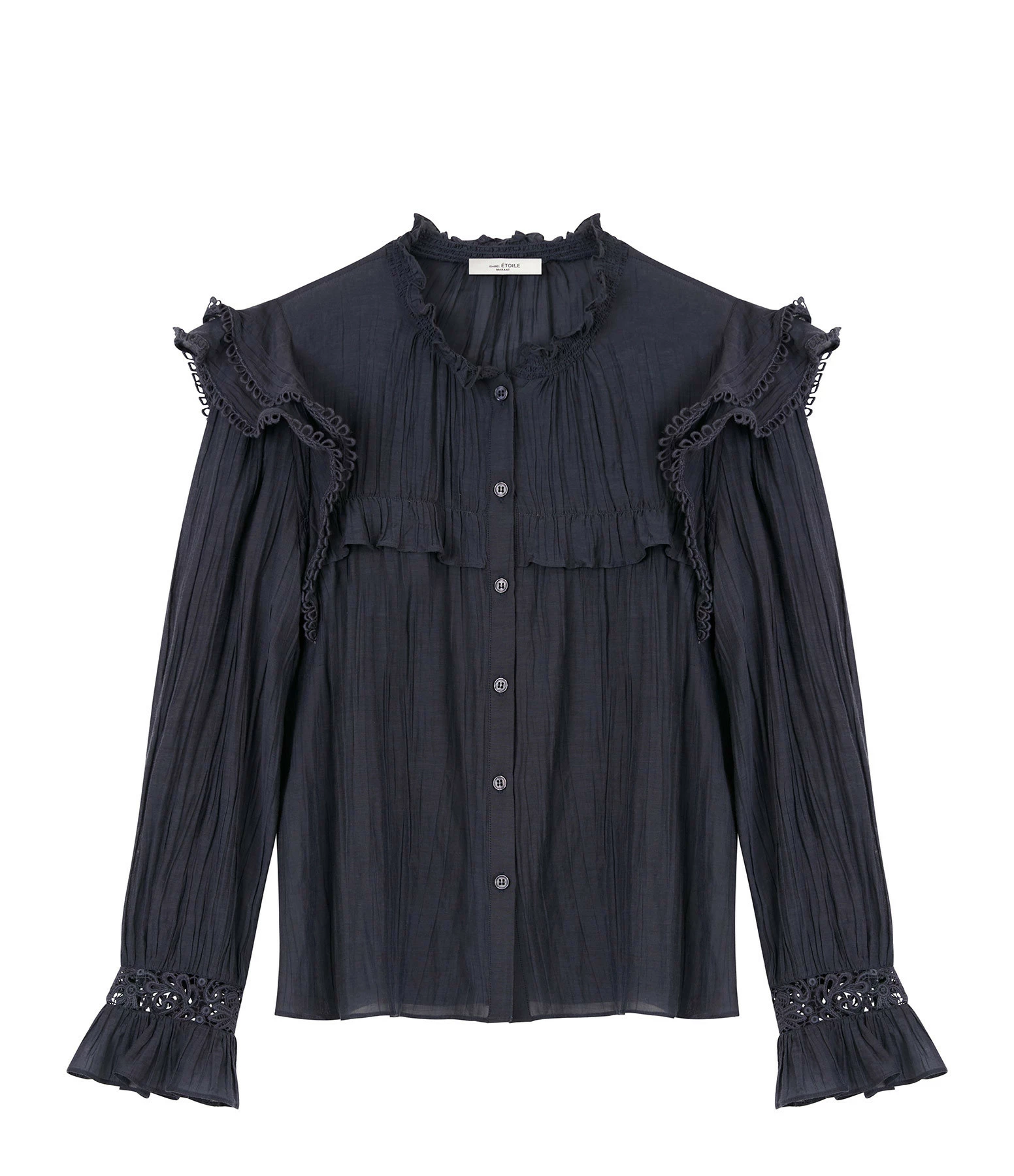 Chemise en coton bleu nuit ornée de volants. Col officier volanté et froncé. Manches longues avec détails de broderies au niveau des poignets. Fermeture boutonnée sur le devant. Boutons bleus. Matière légèrement transparente. Coupe droite. Base droite. Non doublée.