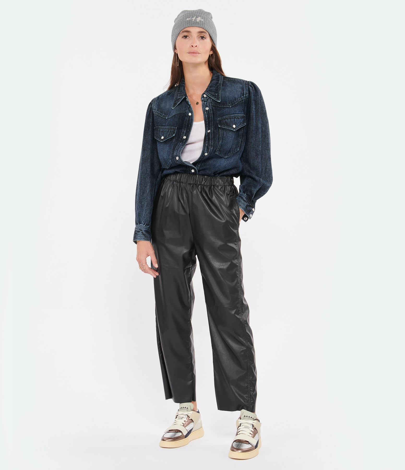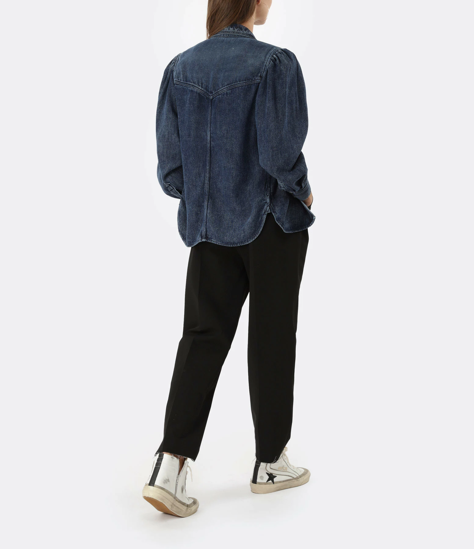 Chemise en denim de lyocell et coton bleu foncé. Col chemisier italien. Manches longues bouffantes avec fentes et poignets pressionnés. Fermeture pressionnée simple sur le devant. Boutons métalliques nacrées. Deux poches poitrine à rabat pressionnées sur le devant. Coupe droite. Base liquette.