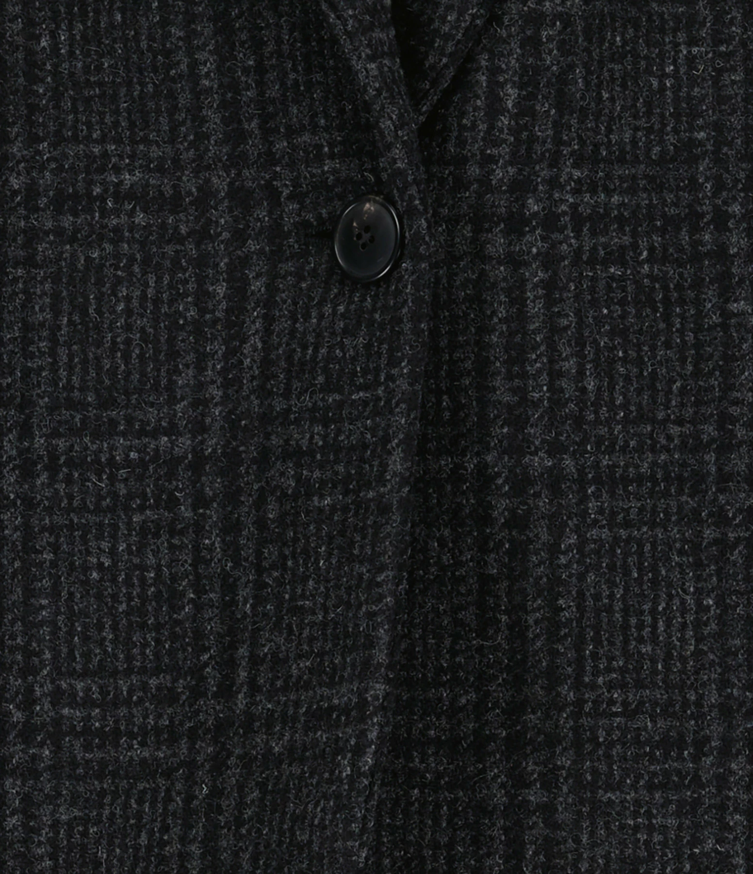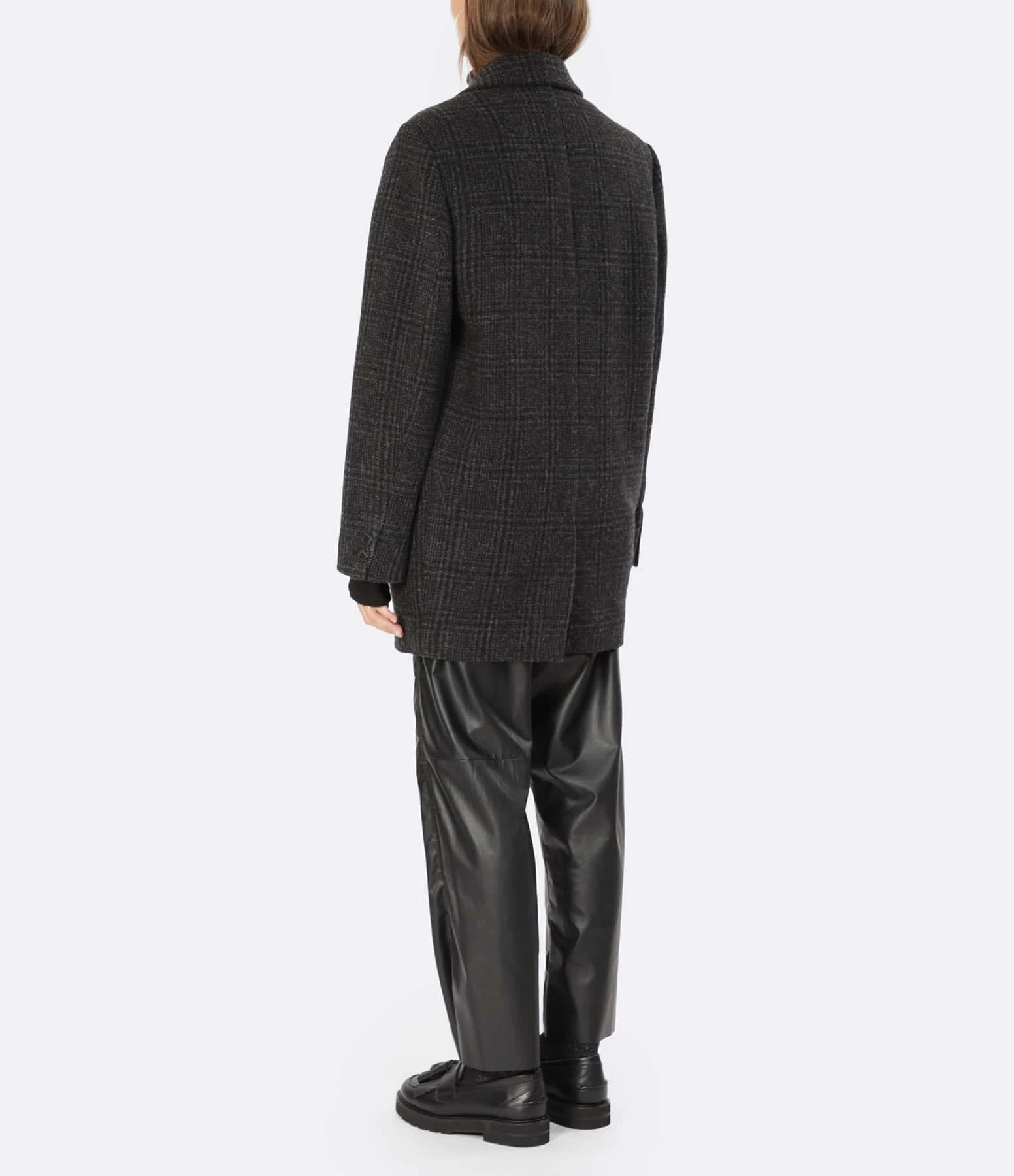 Manteau court en laine noir. Col tailleur cranté. Manches longues tailleur avec fentes et poignets boutonnés. Fermeture boutonnée simple sur le devant. Boutons aspect corne noirs. Une poche plaquée poitrine. Deux poches à rabat sur le devant. Une fente milieu dos. Coupe droite. Base arrondie. Doublé en coton noir.