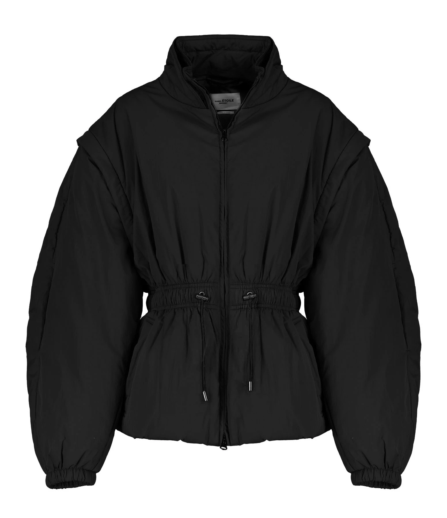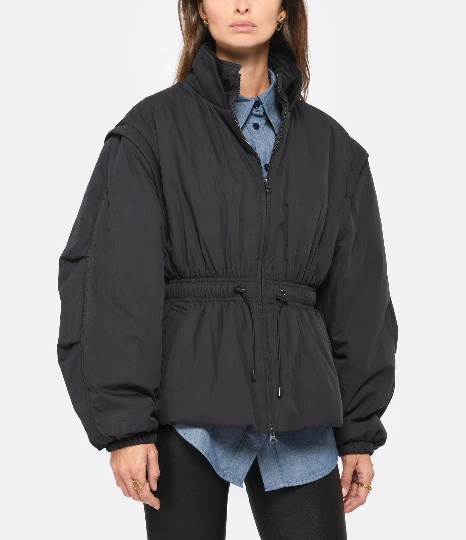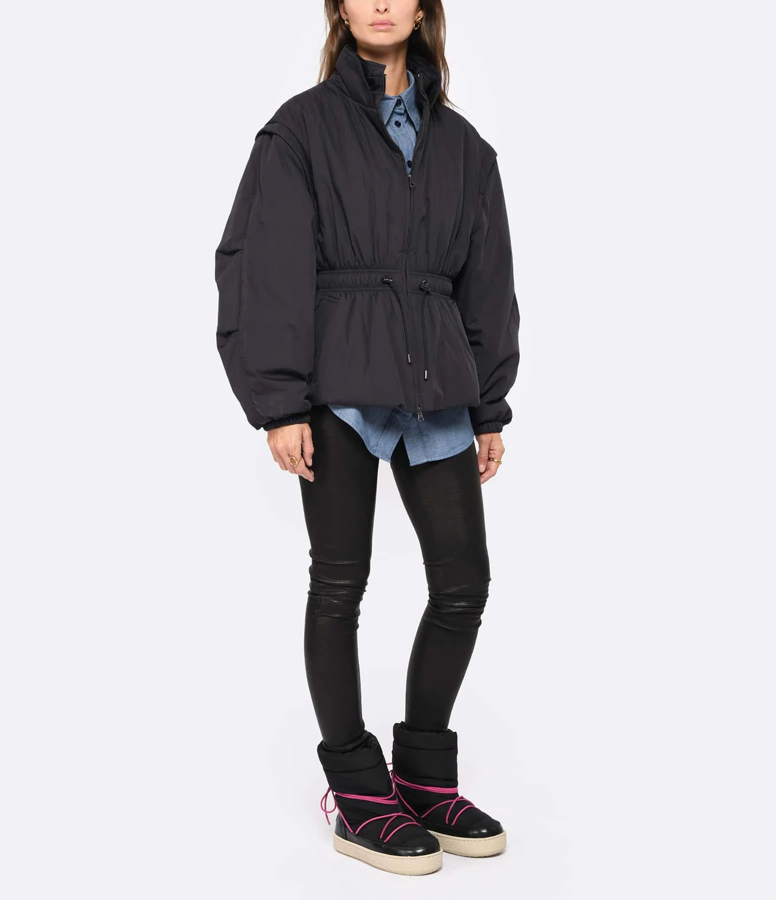 Manteau coupe-vent noir délavé. Manches amovibles zippées. Ceinture élastique. Fermeture zippée. Doublé en coton.