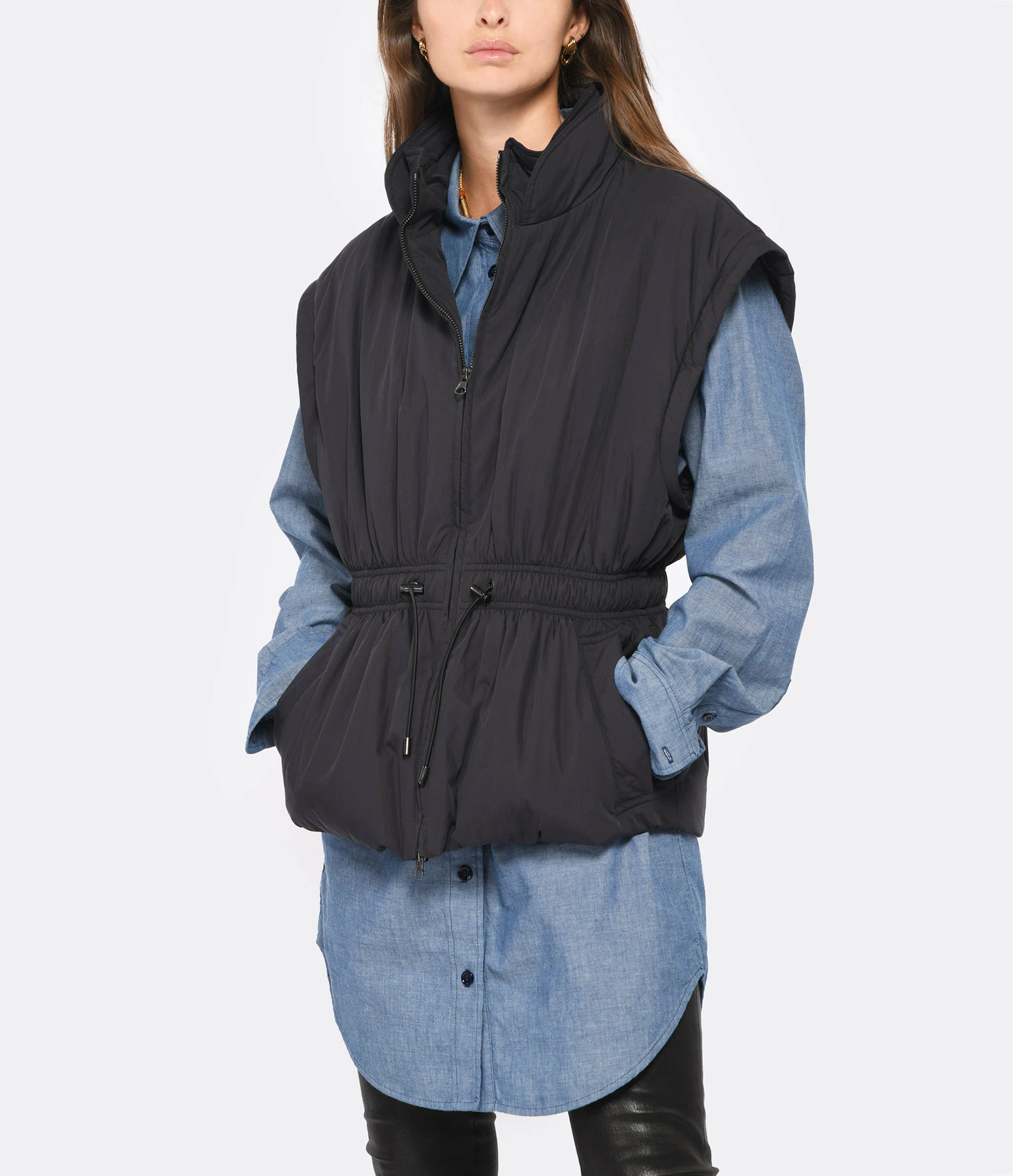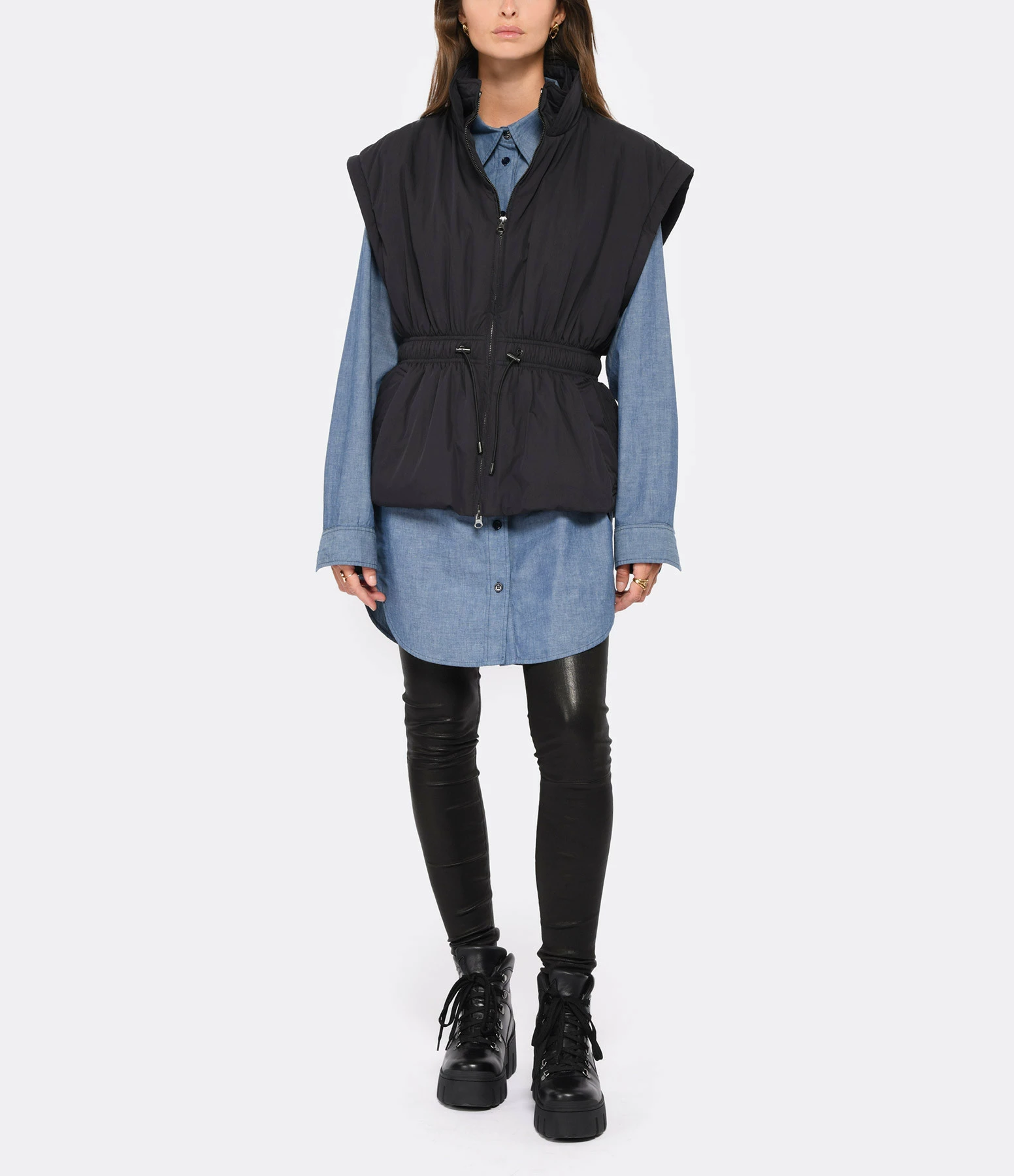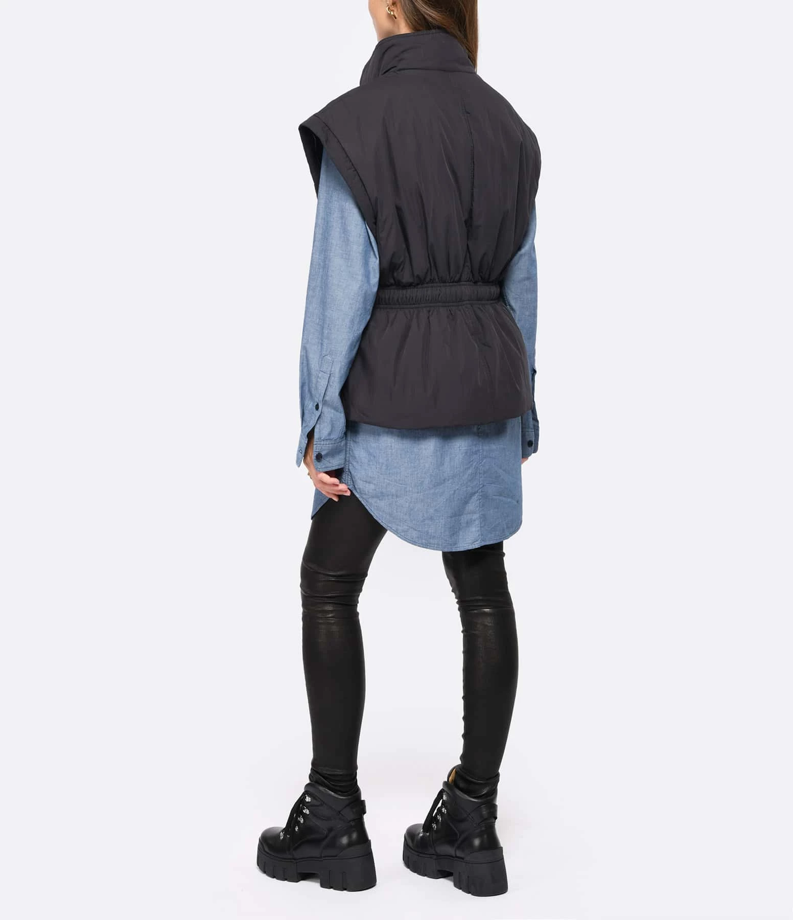 Manteau coupe-vent noir délavé. Manches amovibles zippées. Ceinture élastique. Fermeture zippée. Doublé en coton.