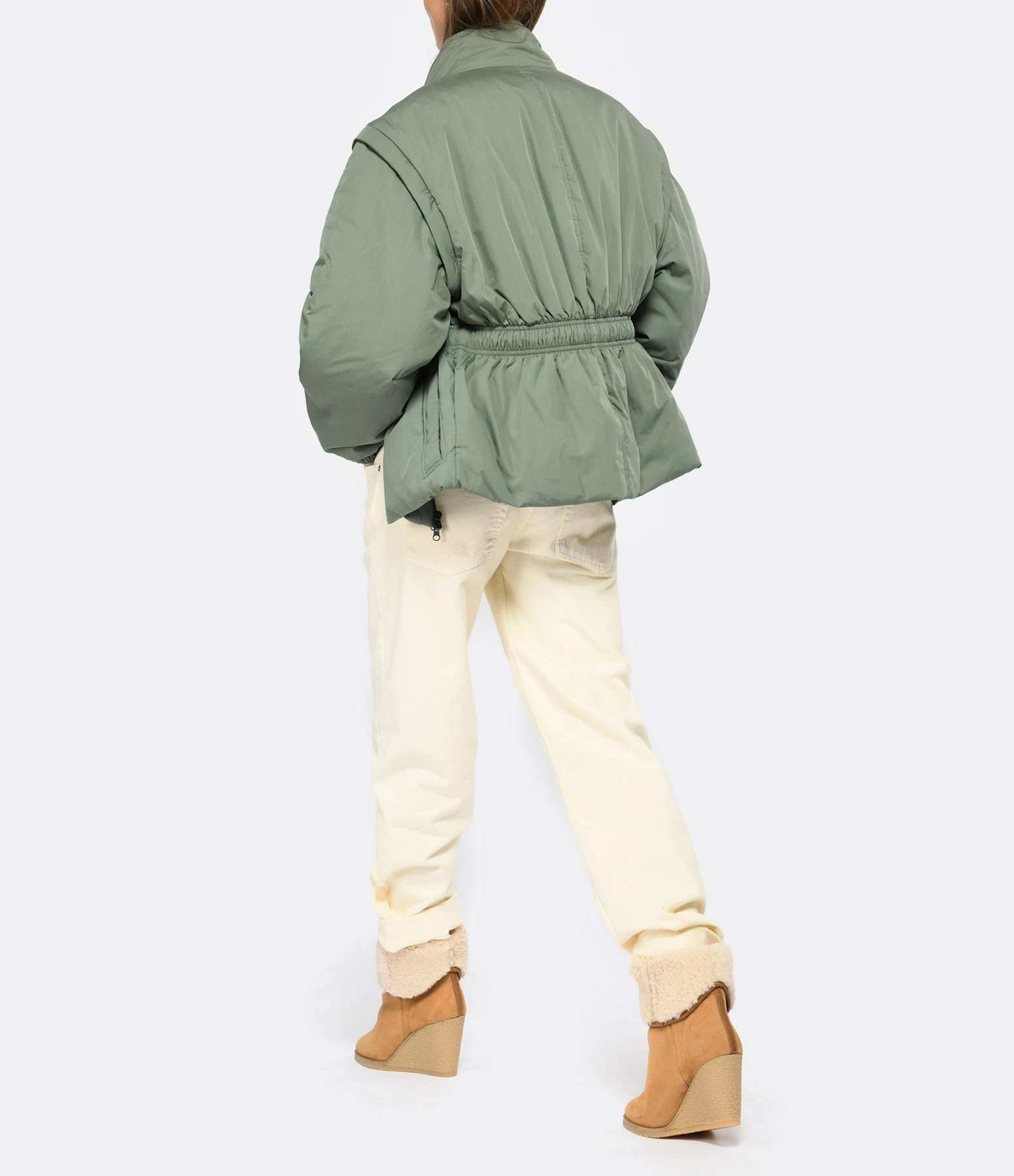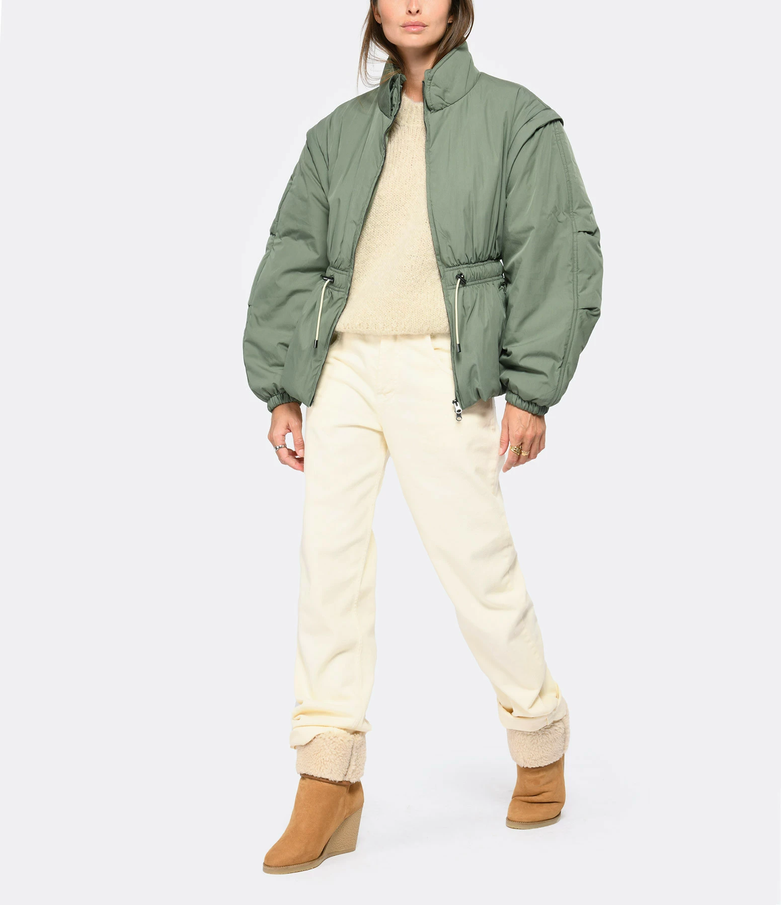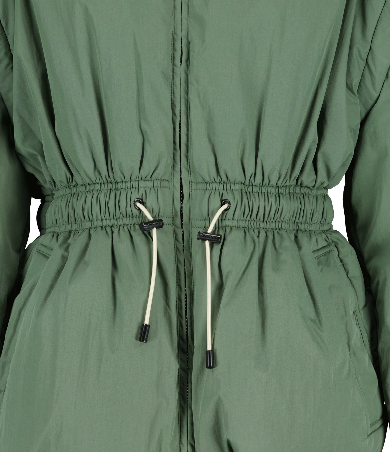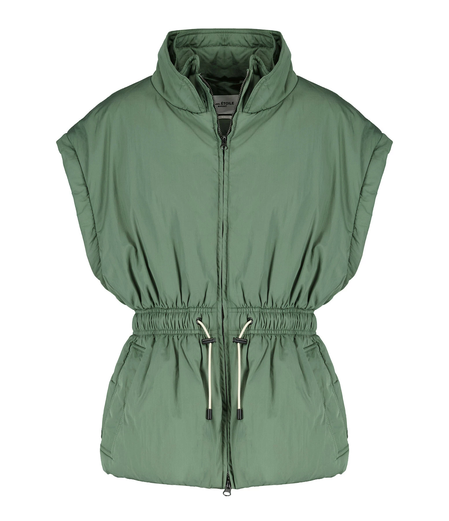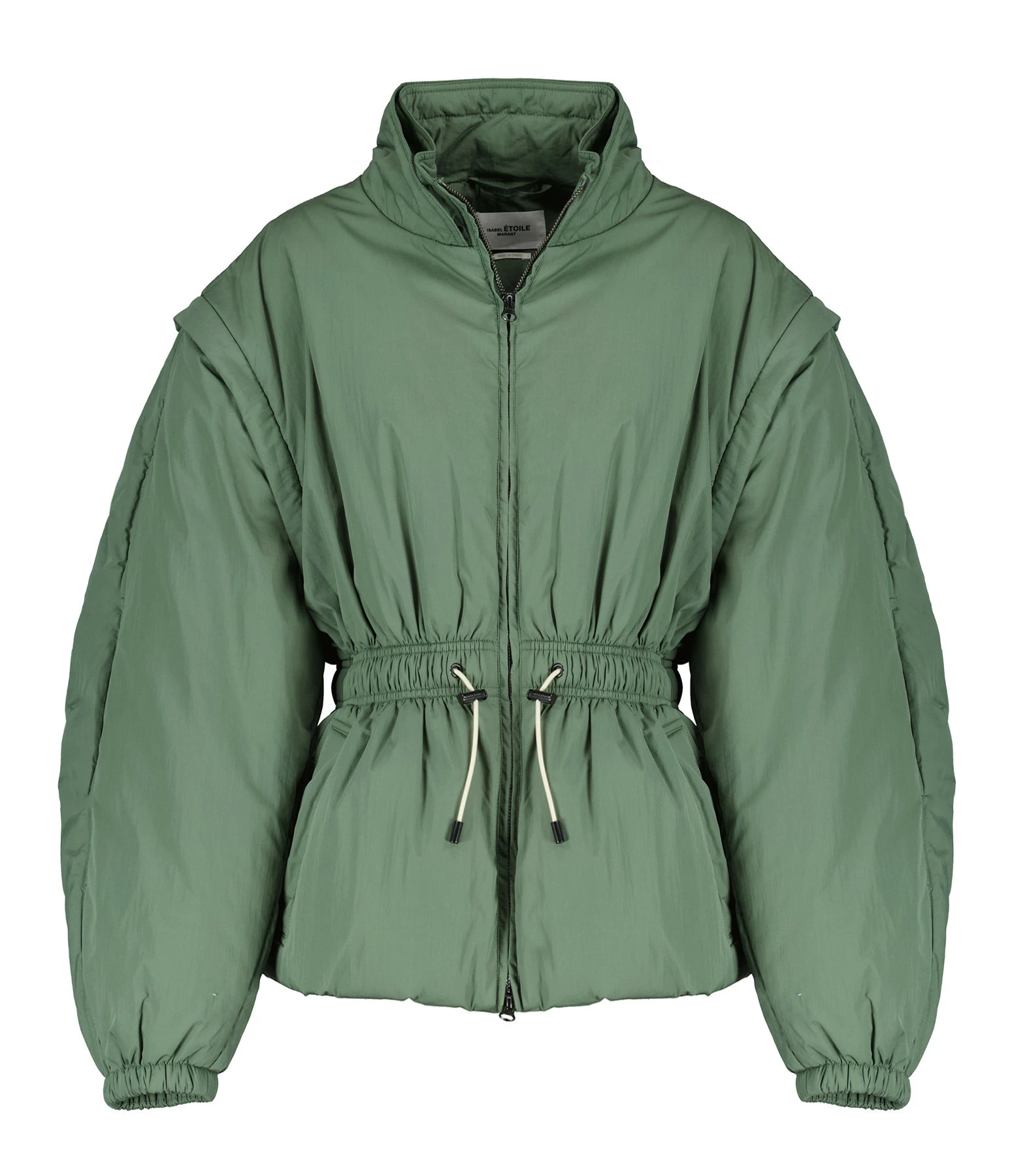 Manteau coupe-vent vert. Manches amovibles zippées. Ceinture élastique. Fermeture zippée. Doublé en coton.