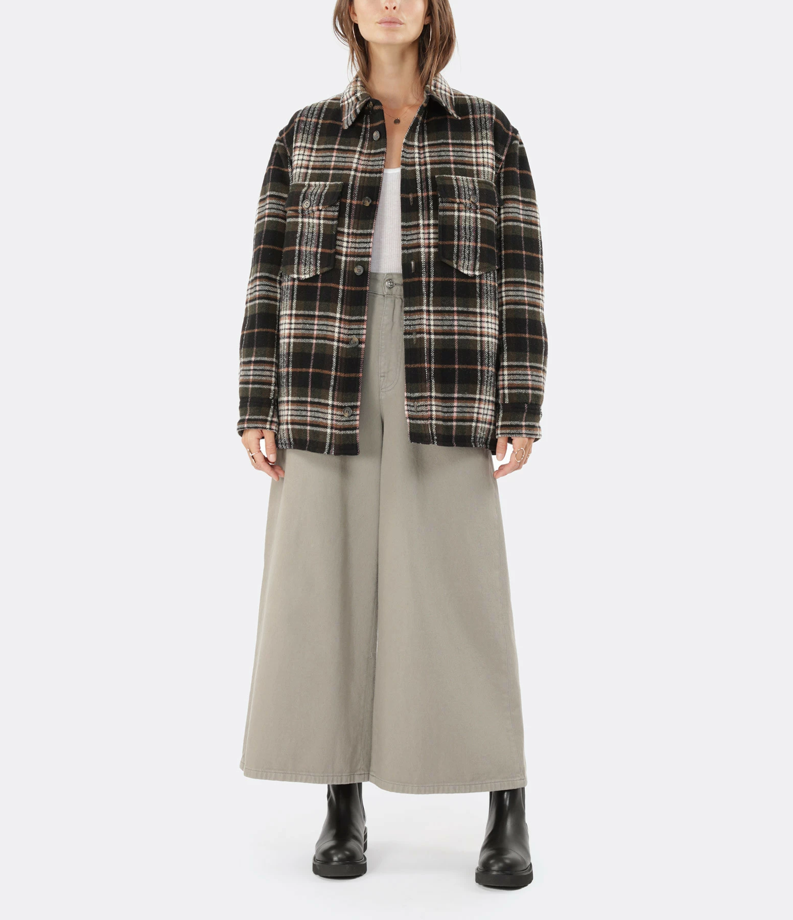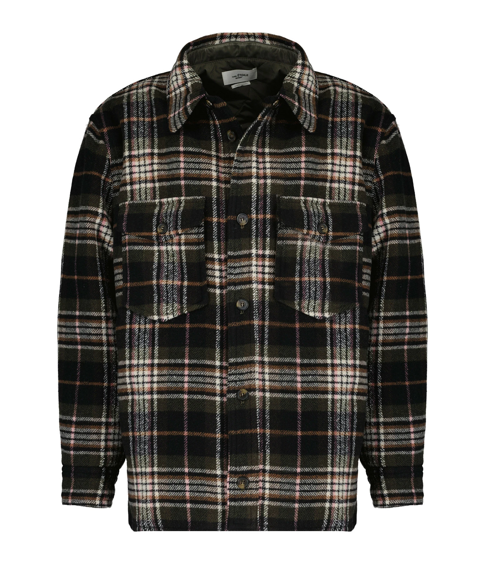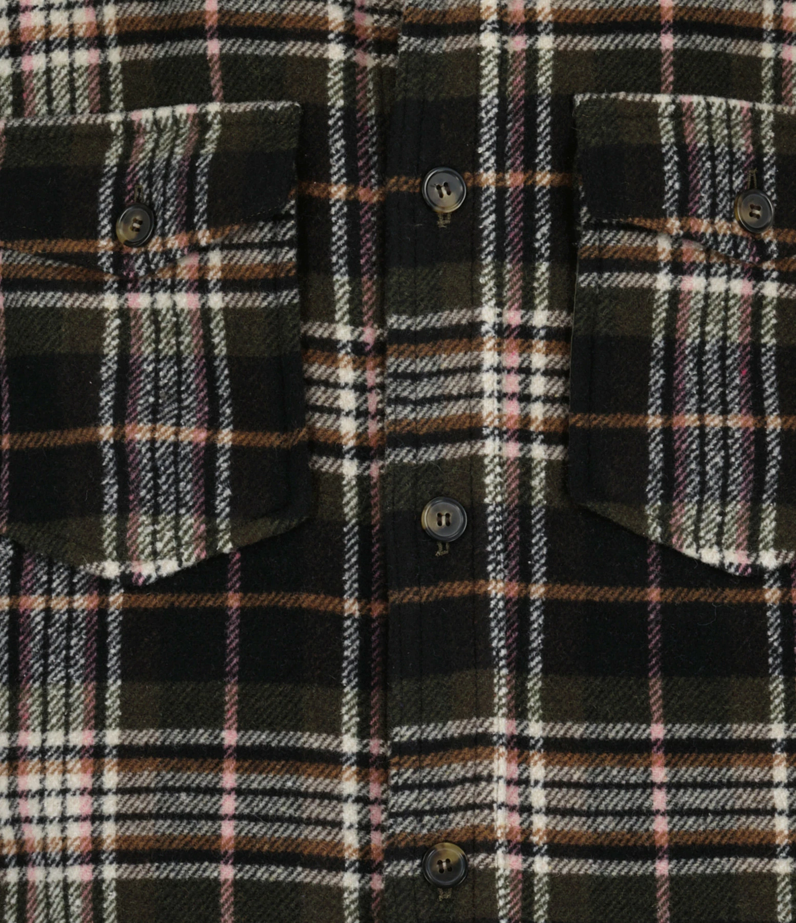 Manteau court en laine mélangée à carreaux kaki foncé. Col chemisier. Manches longues tailleur avec fentes et poignets boutonnés. Fermeture boutonnée simple sur le devant. Boutons effet corne marrons. Deux poches poitrine à rabat boutonnées. Deux poches prises dans la découpe sur le devant. Deux fentes latérales. Logo brodé en écru dans le dos. Intérieur matelassé. Coupe droite. Base droite.