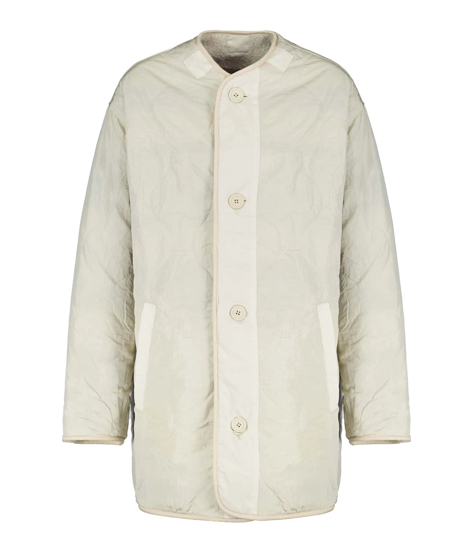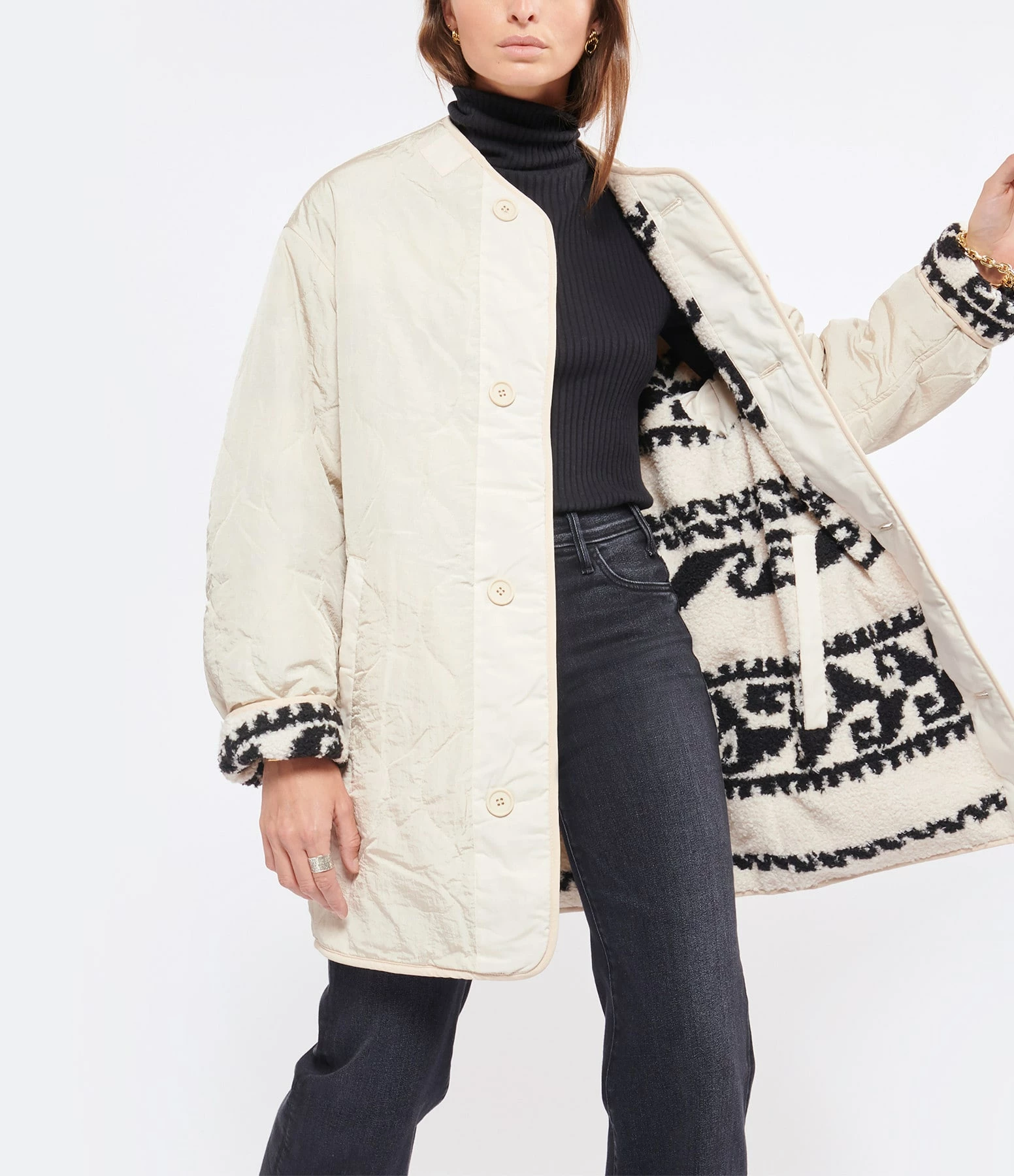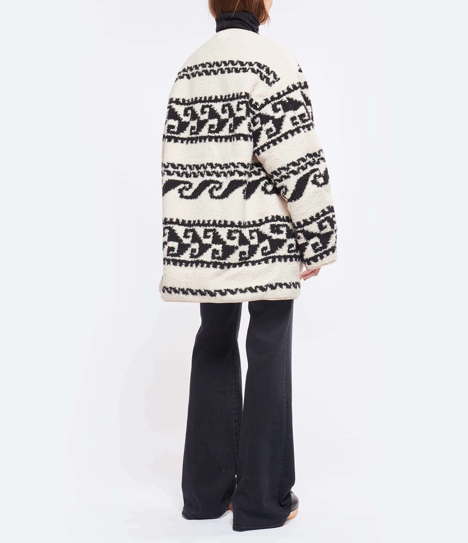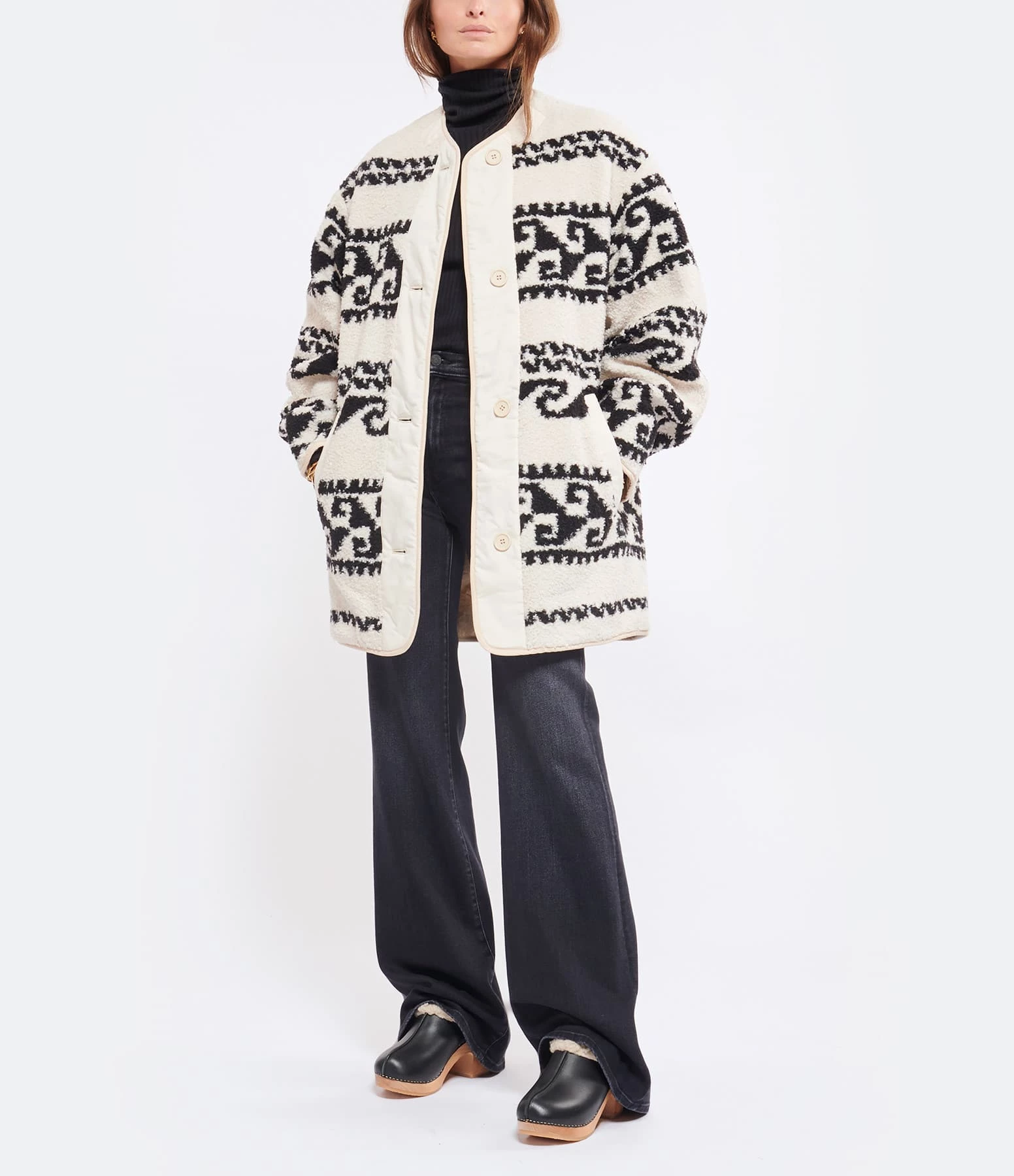 Manteau en polaire écru à motifs noirs. Doublure écrue réversible. Manches longues. Col rond. Fermeture boutonnée. Poches côtés. Coupe ample. Base arrondie.