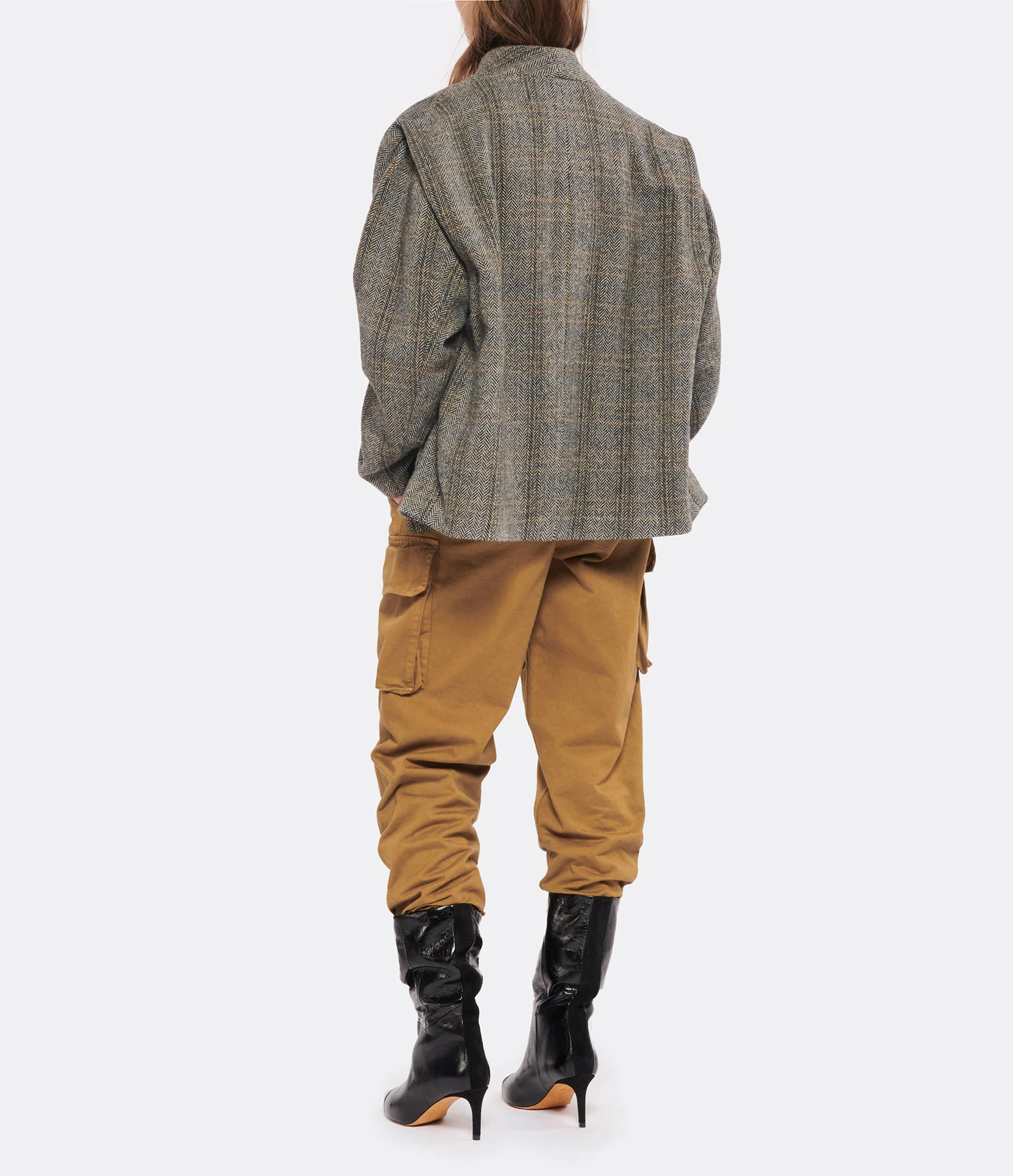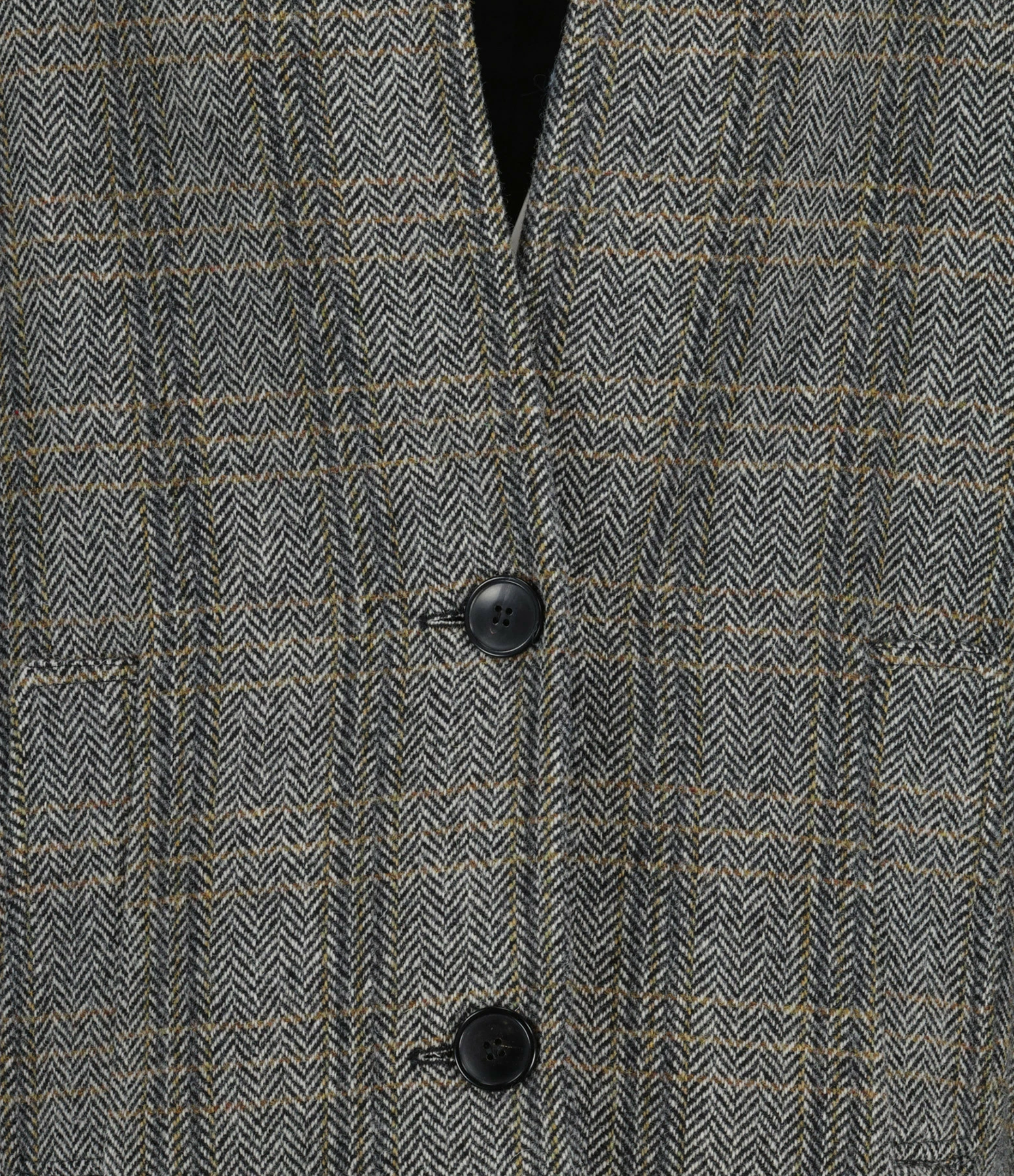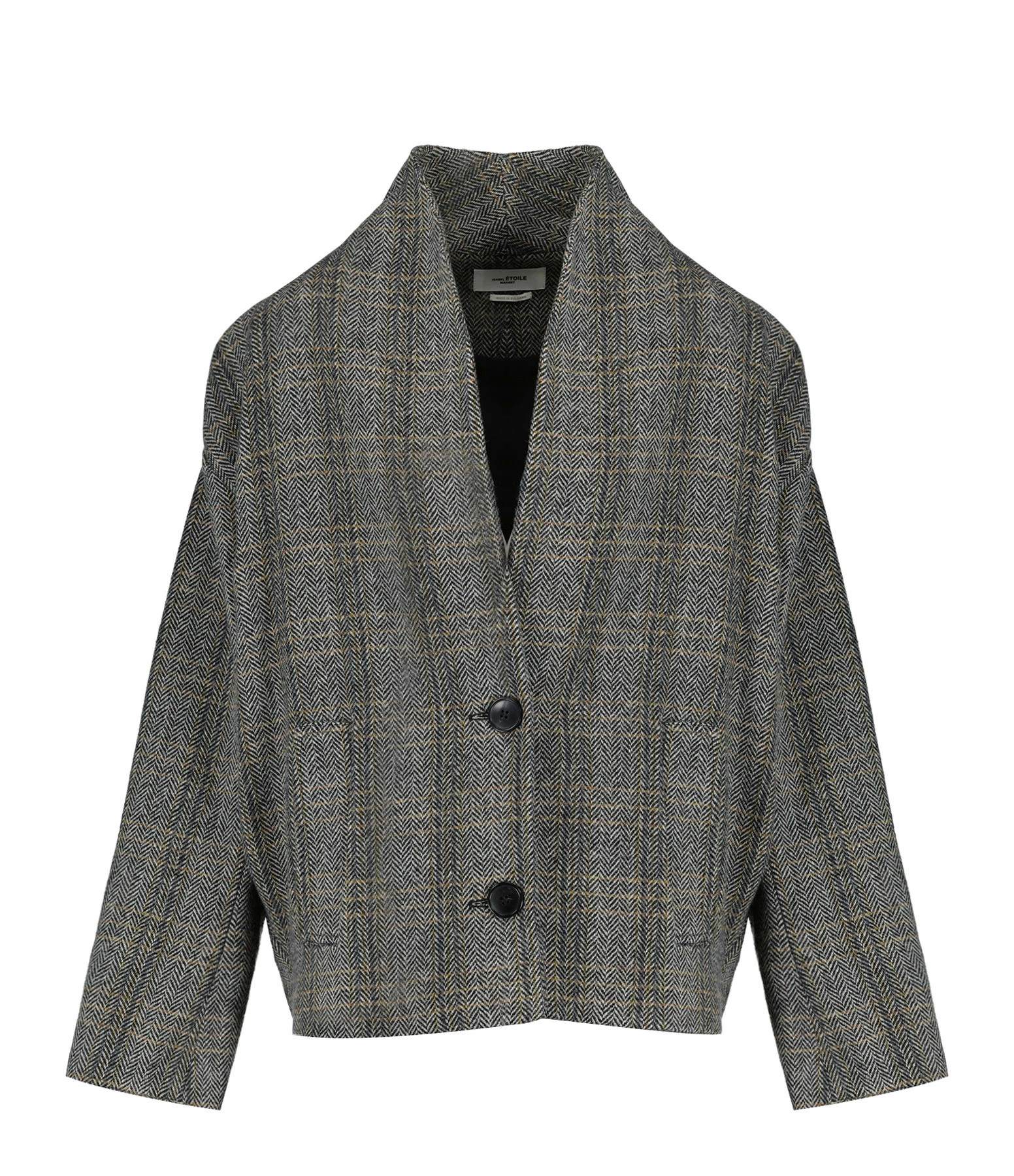 Veste courte en laine à carreaux gris. Col en V. Manches longues tailleur. Fermeture boutonnée simple sur le devant. Boutons noirs effet corne. Deux poches raglans sur le devant. Coupe droite large. Base arrondie. Doublée en coton noir.