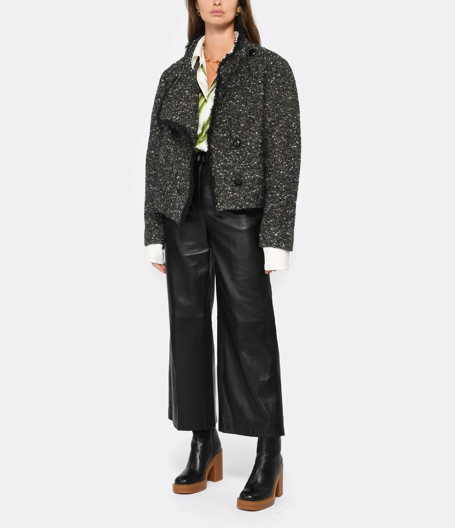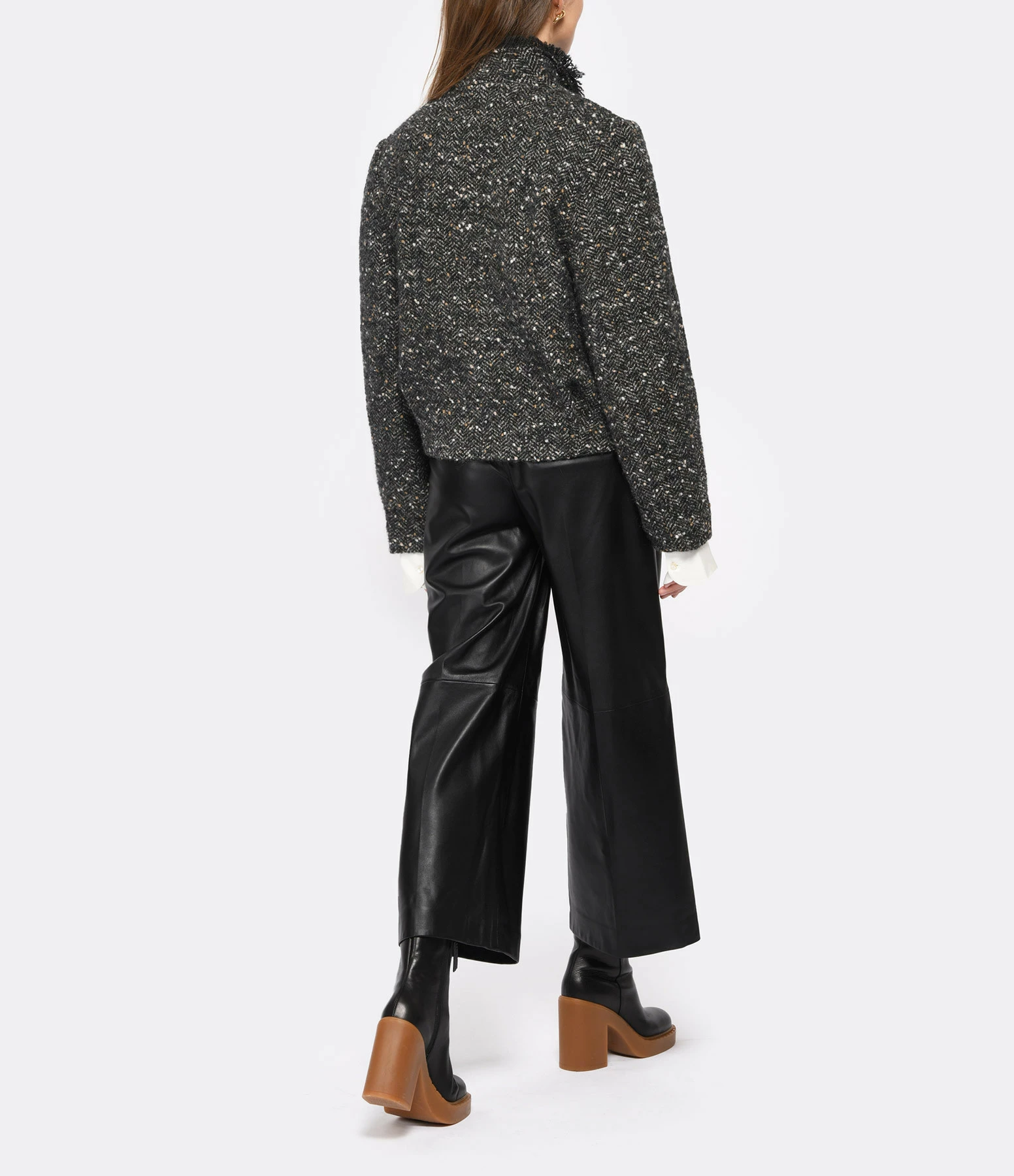Veste courte en laine noire, blanche et beige. Bords frangés. Col montant. Manches longues. Deux poches passepoilées sur le devant. Fermeture asymétrique à boutons. Coupe droite. Base droite.